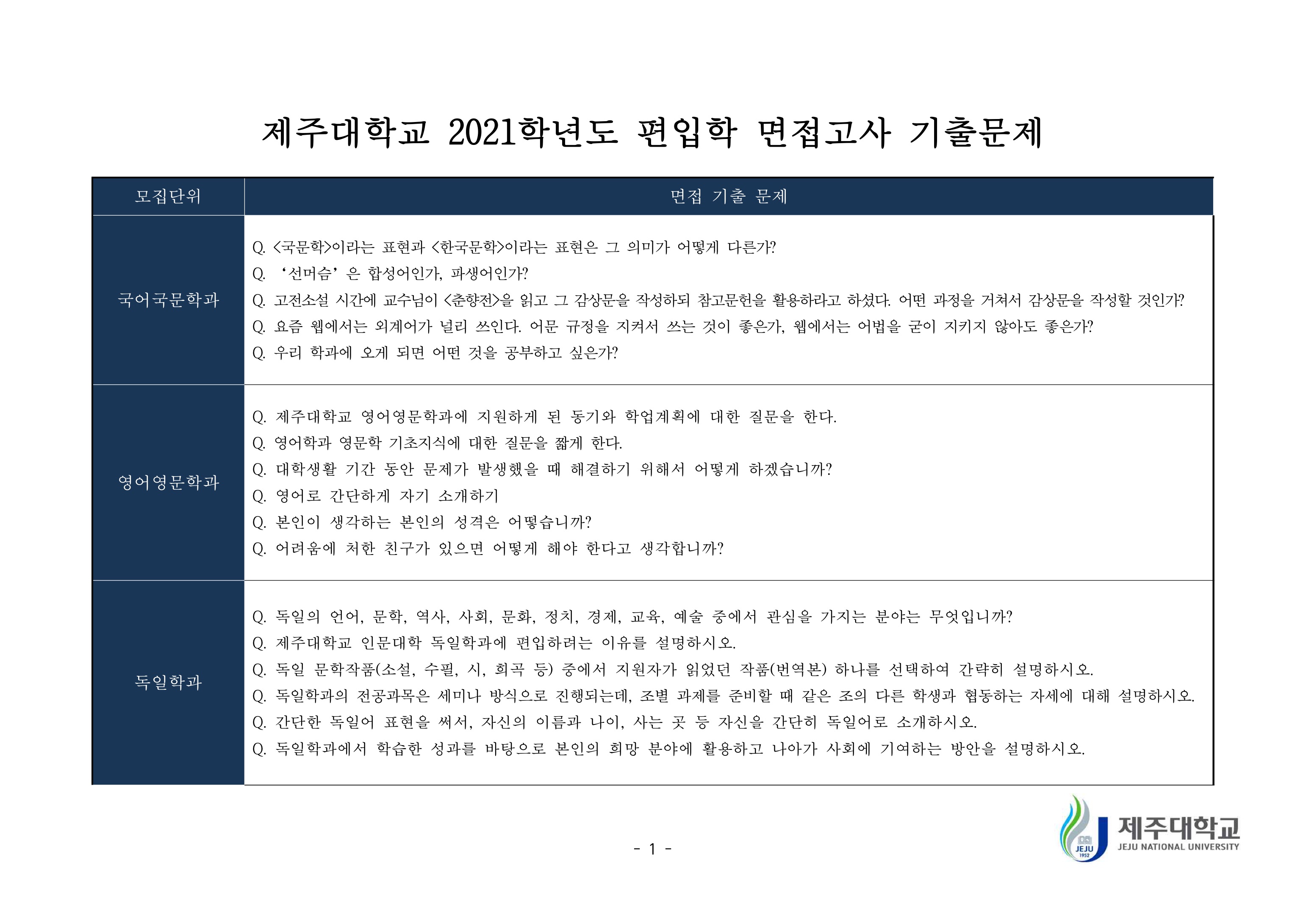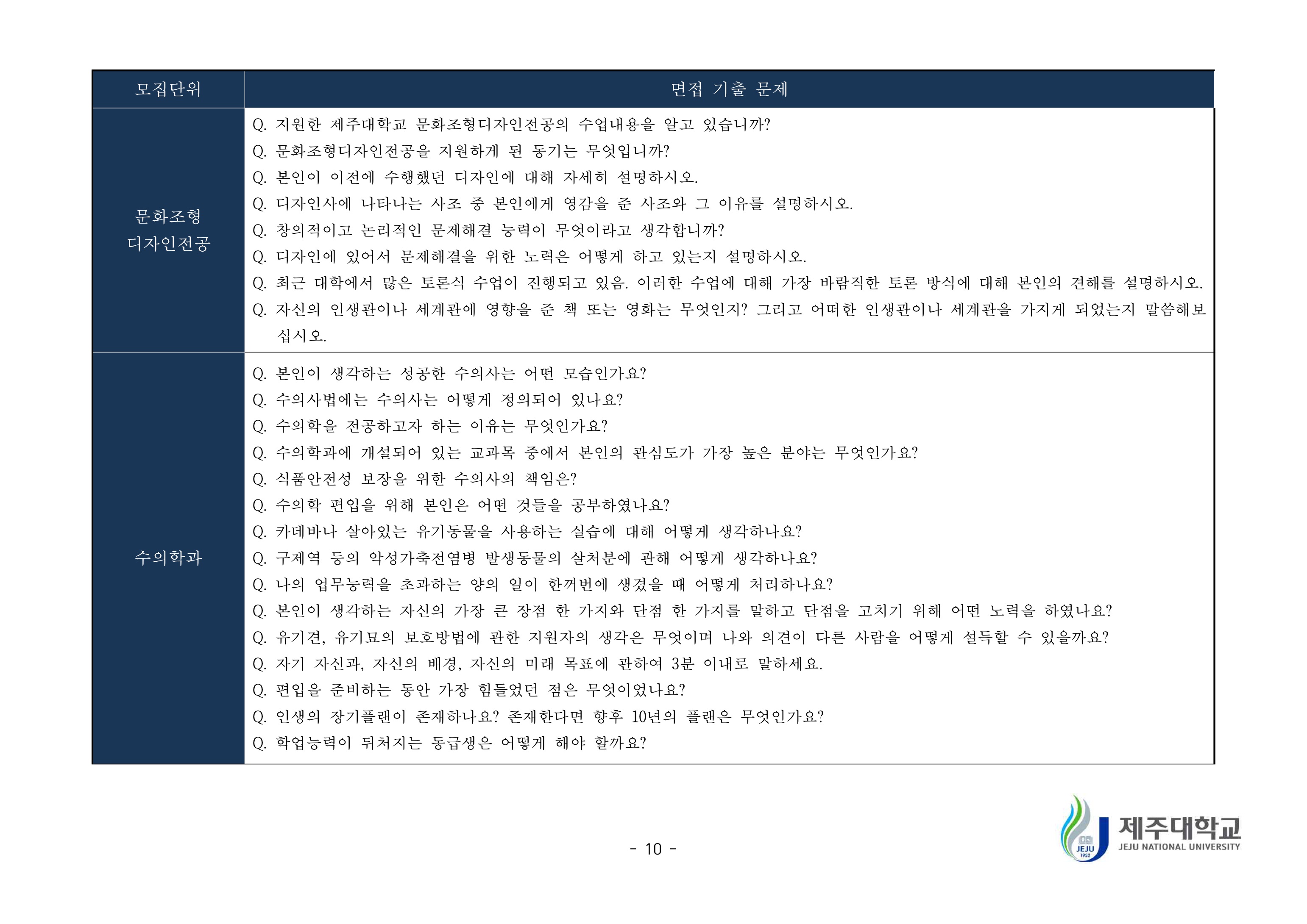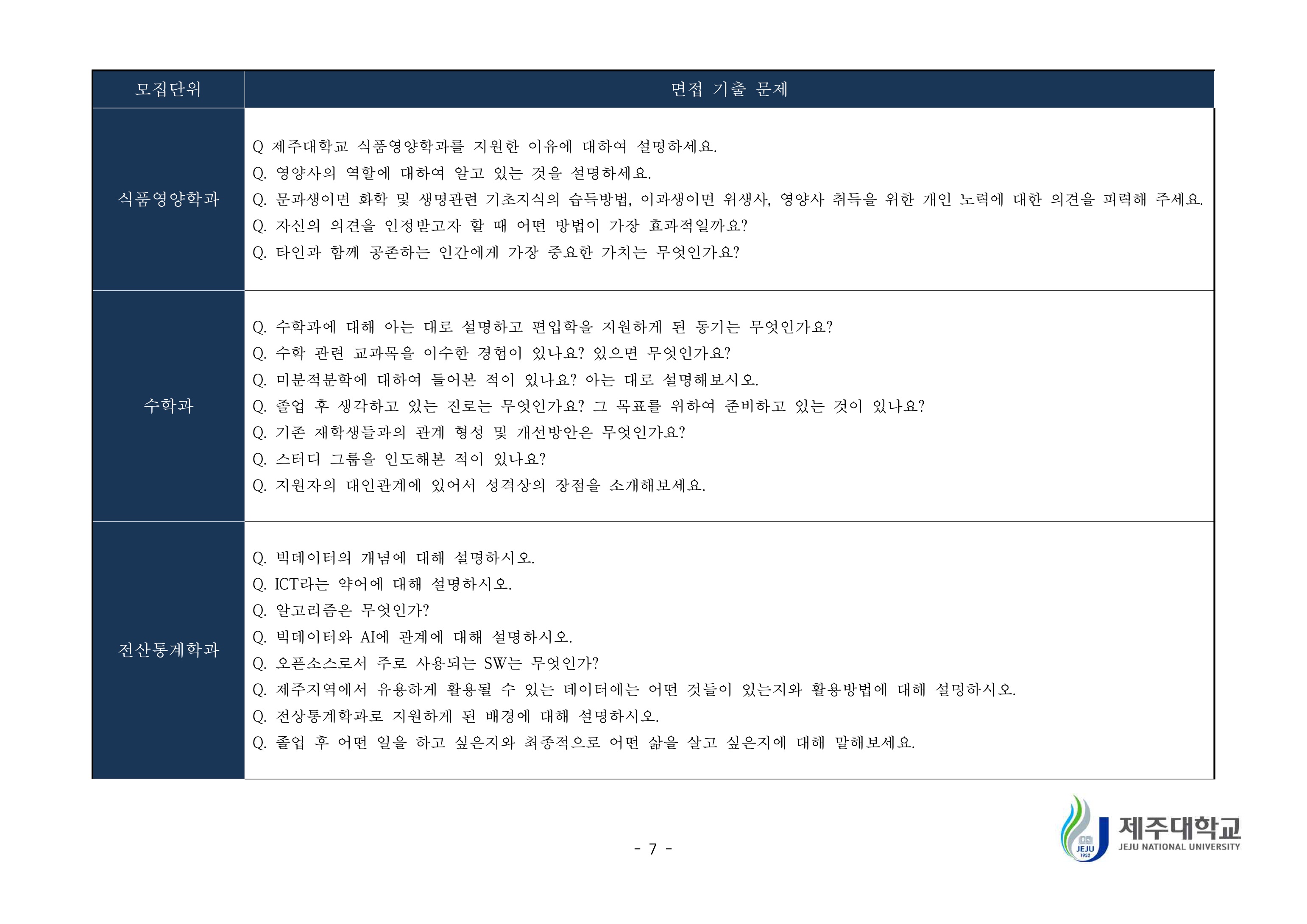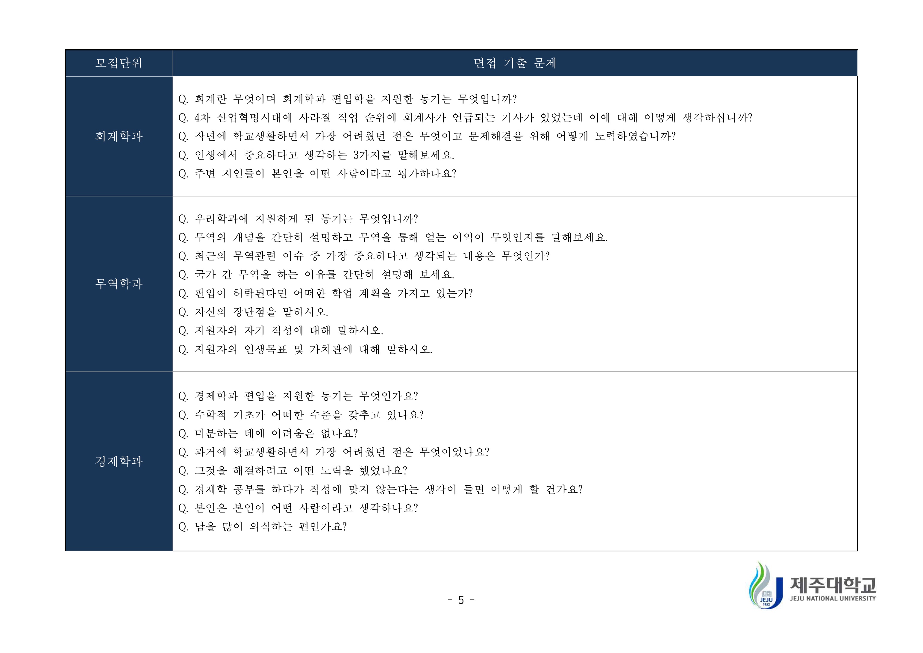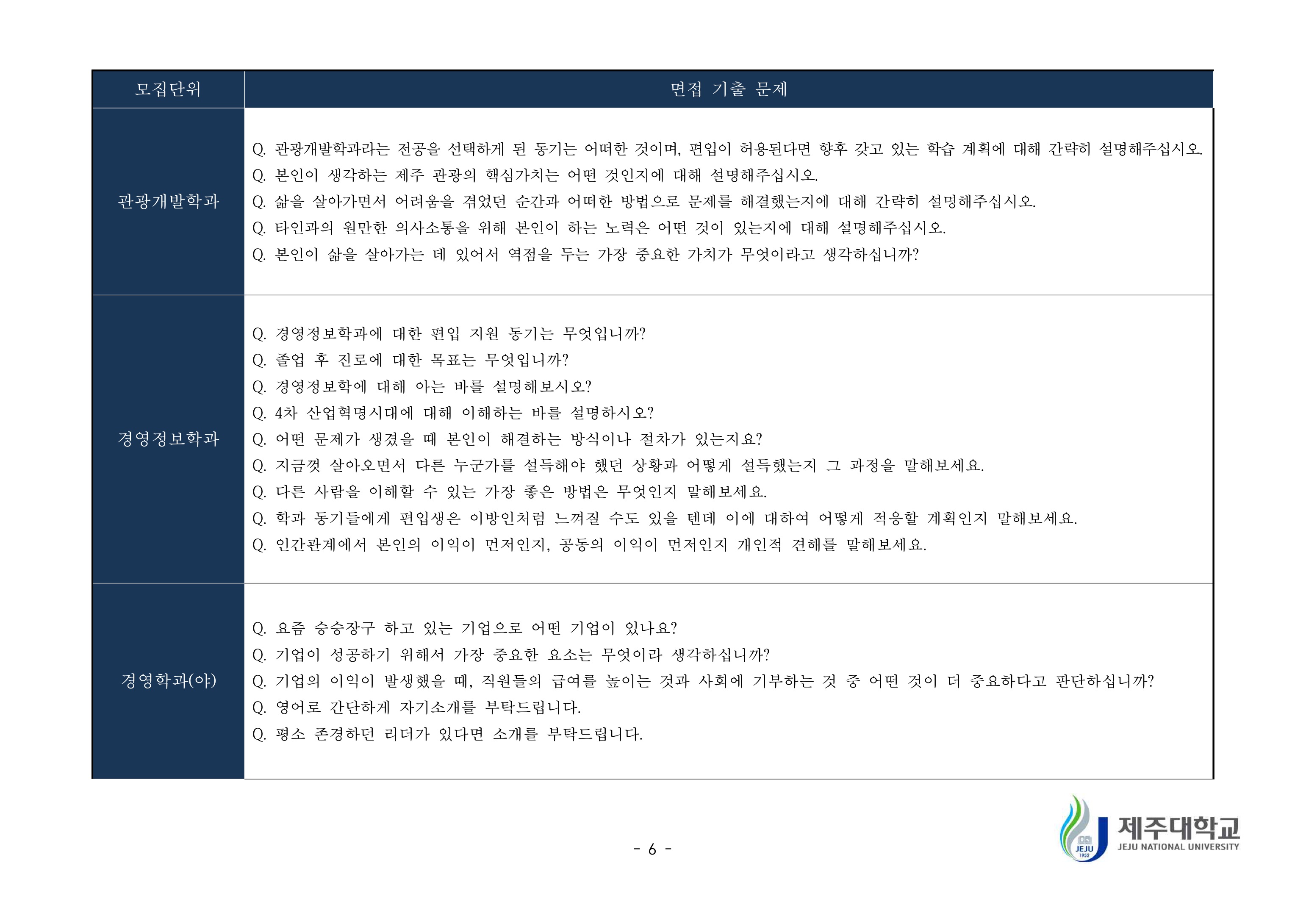 2019학년도 제주대학교 학생부종합전형 면접질문 예시 2021학년도 제주대학교 편입학 면접고사 기출문제
