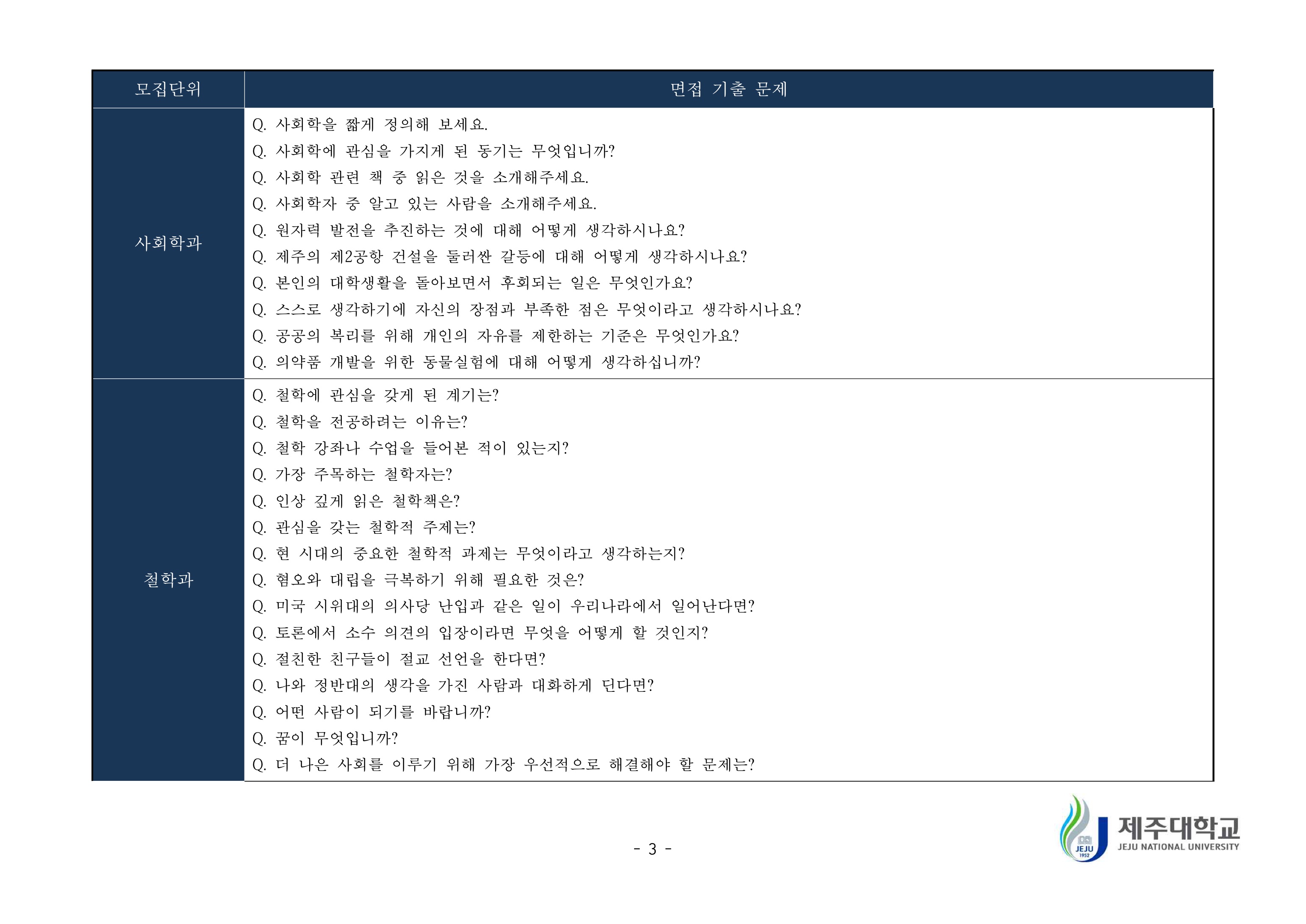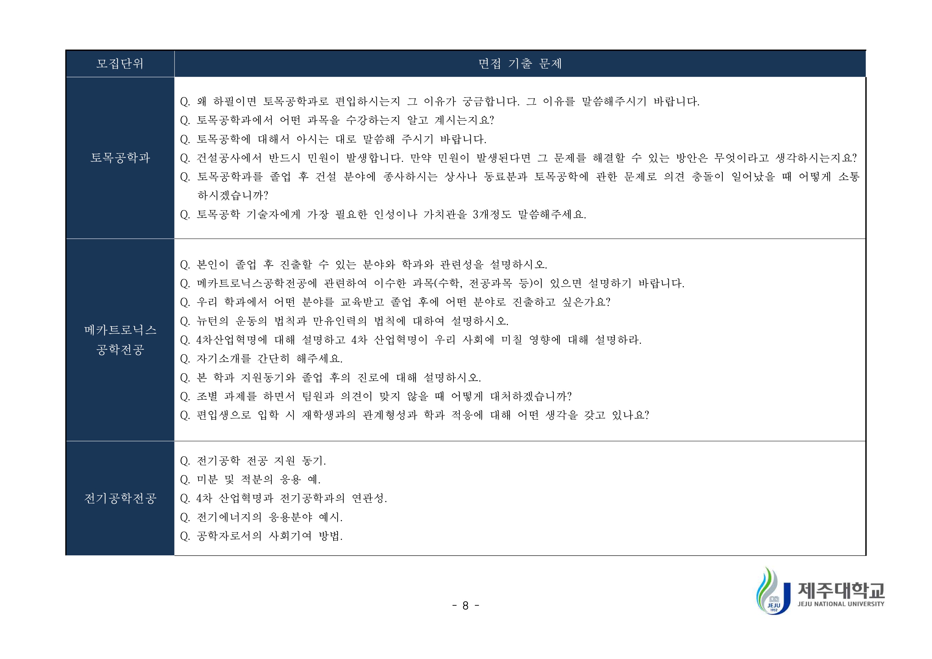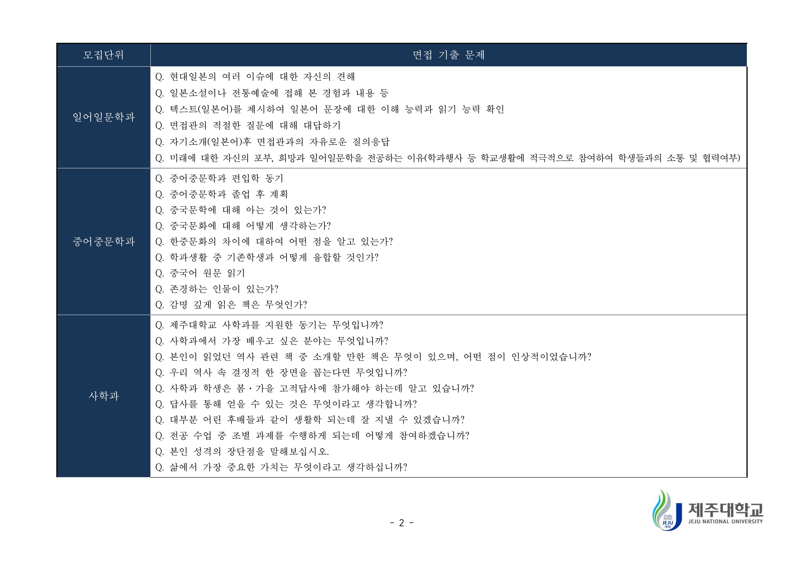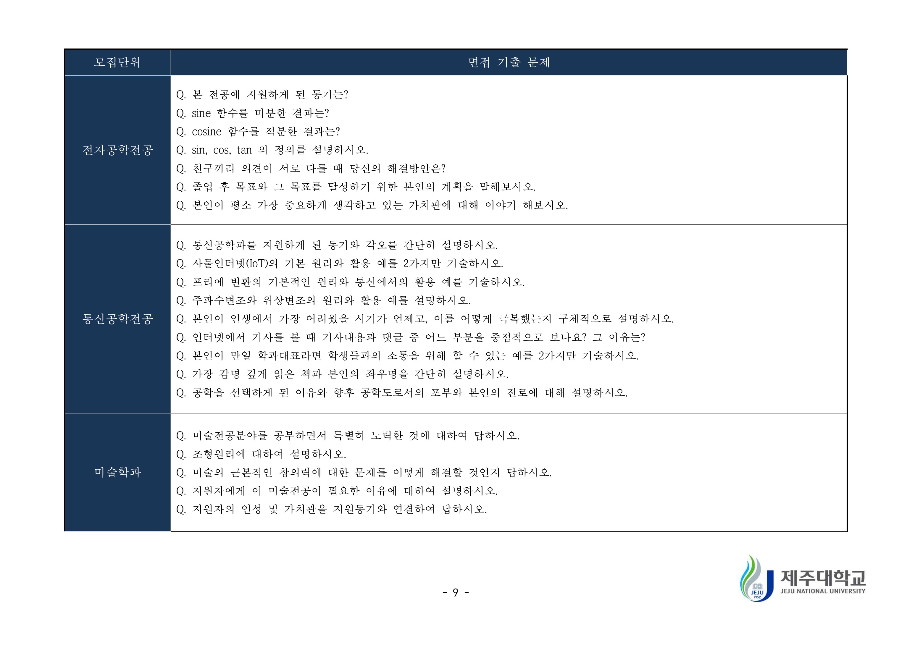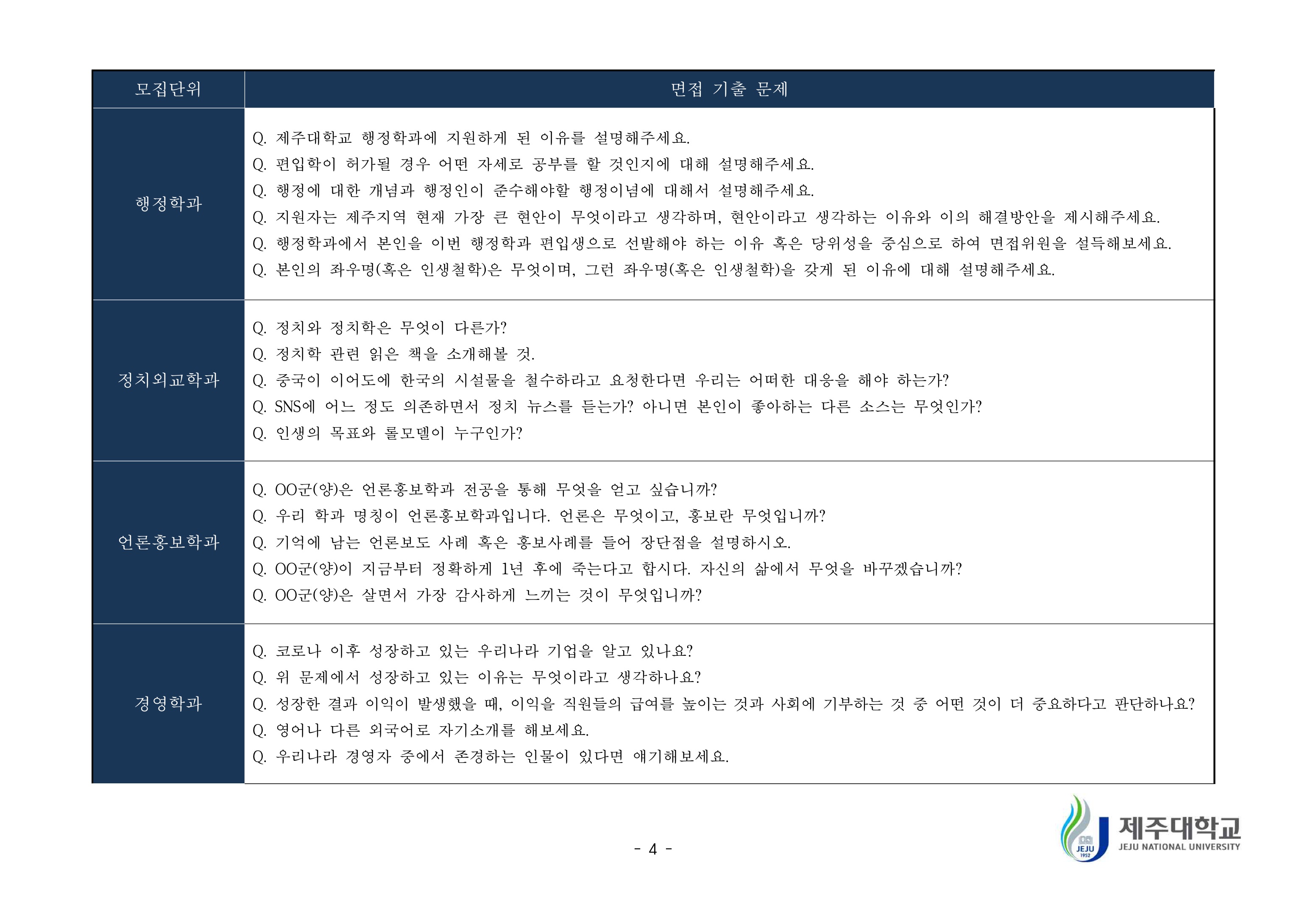 2019학년도 제주대학교 학생부종합전형 면접질문 예시 2021학년도 제주대학교 편입학 면접고사 기출문제