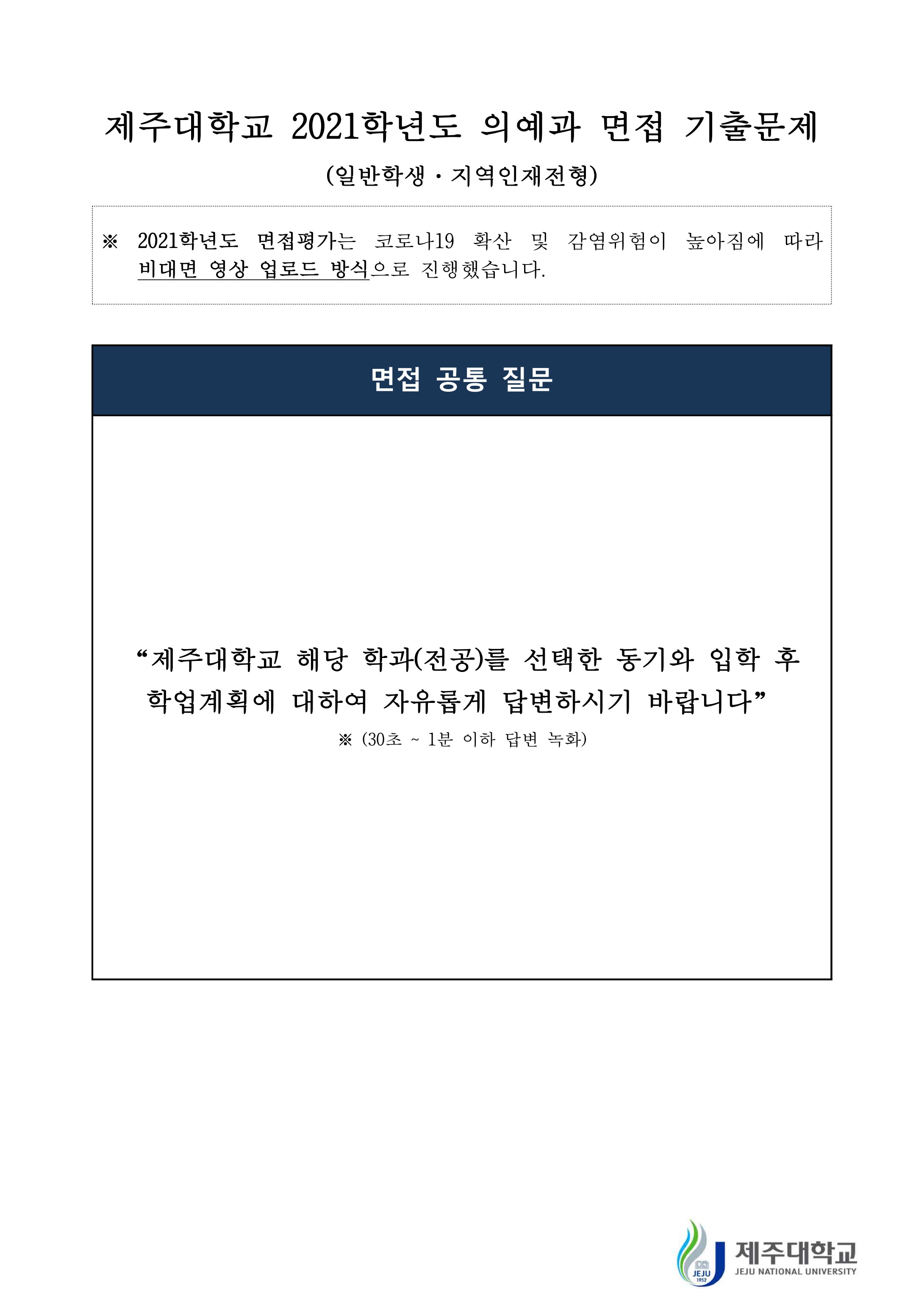 2021학년도 제주대학교 의예과 면접 기출문제 (일반학생 지역인재전형) 2020학년도 제주대학교 의예과 면접 기출문제 (일반학생 · 지역인재전형)