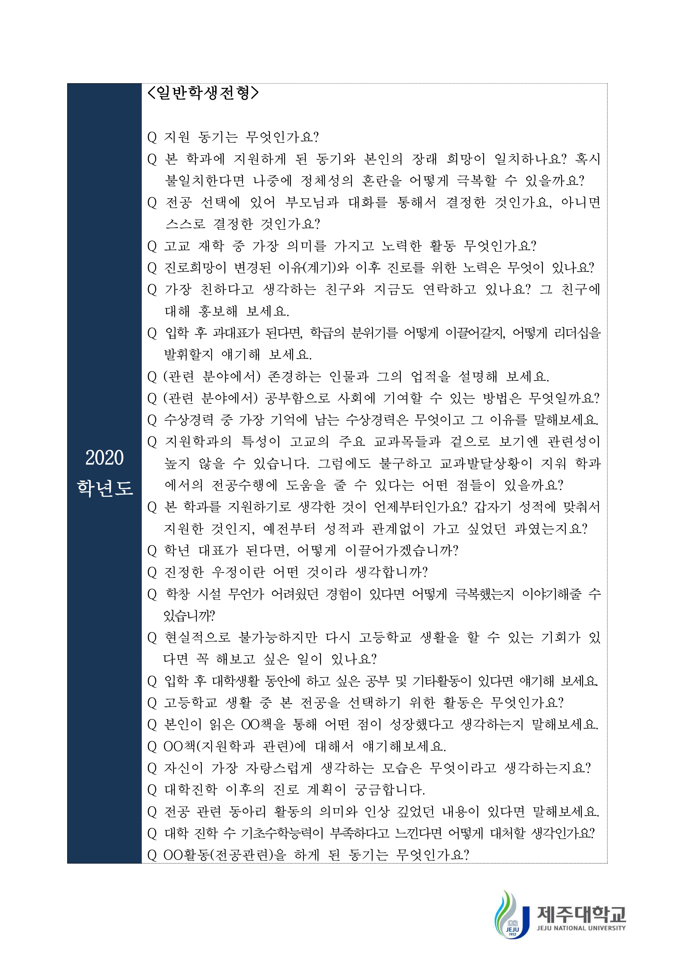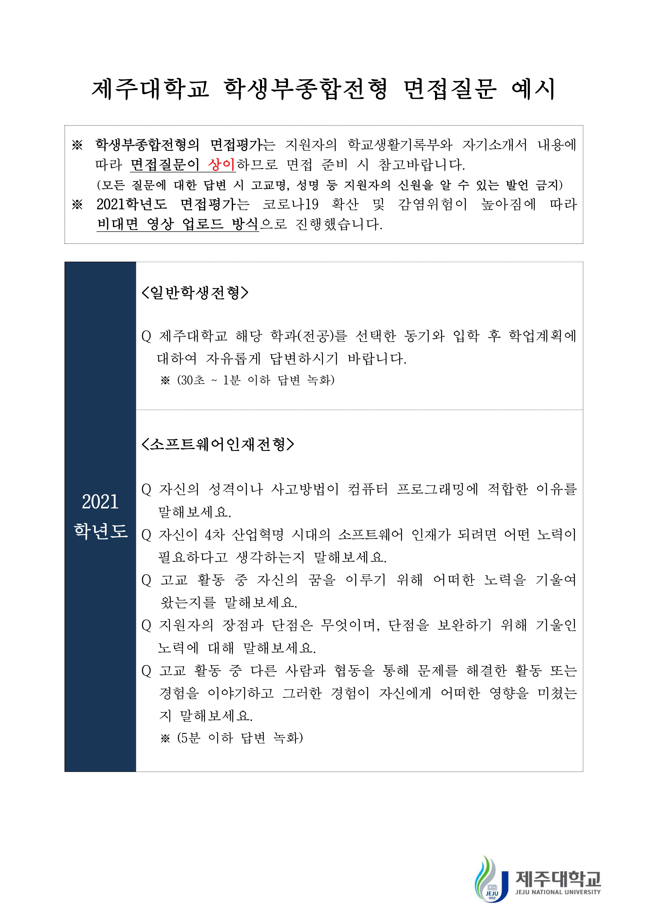 2021학년도 제주대학교 학생부종합전형 면접질문 예시 2020학년도 제주대학교 학생부종합전형 면접질문 예시
