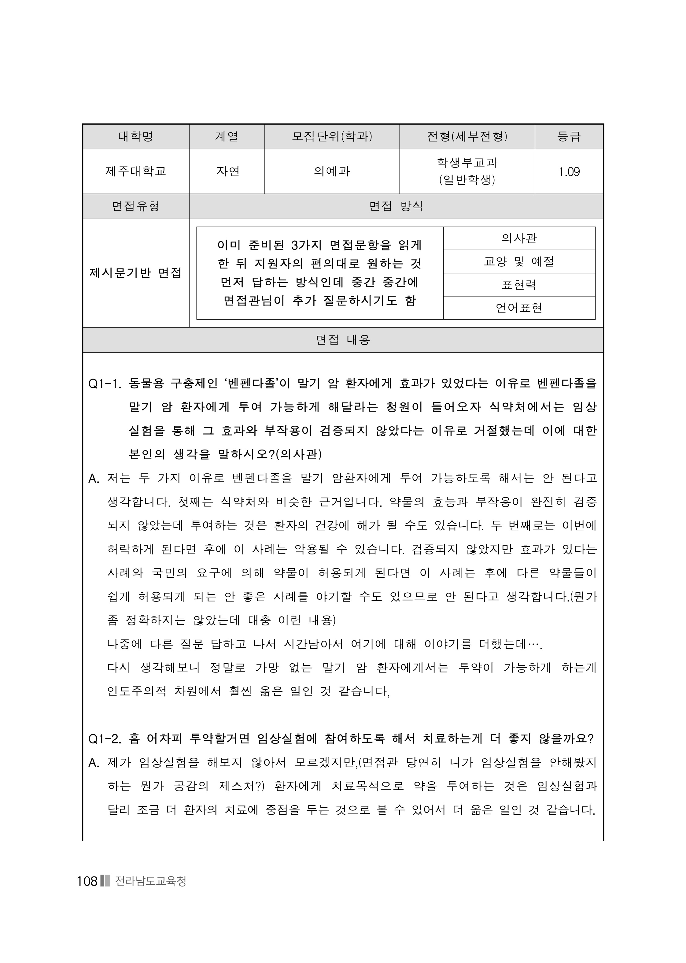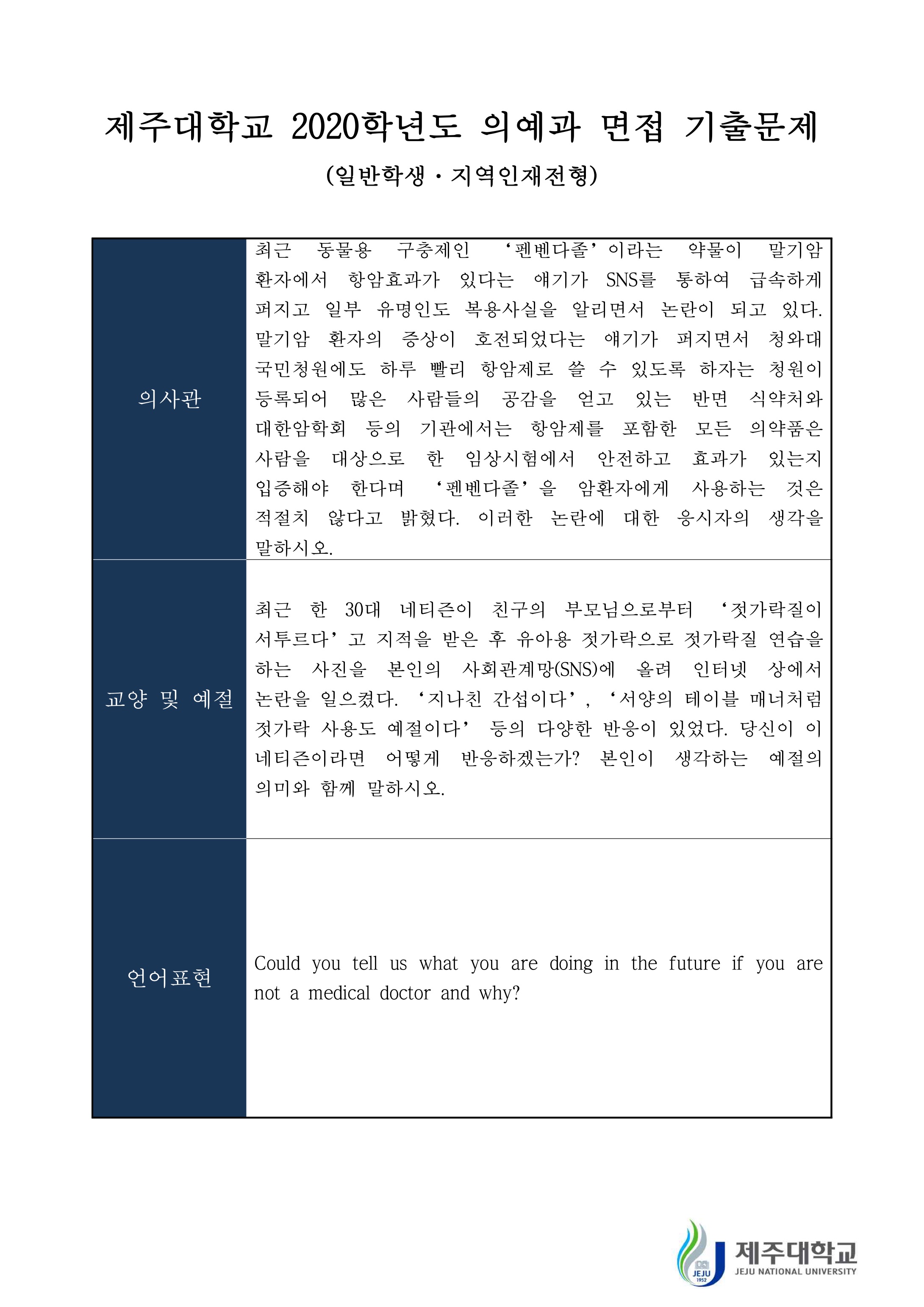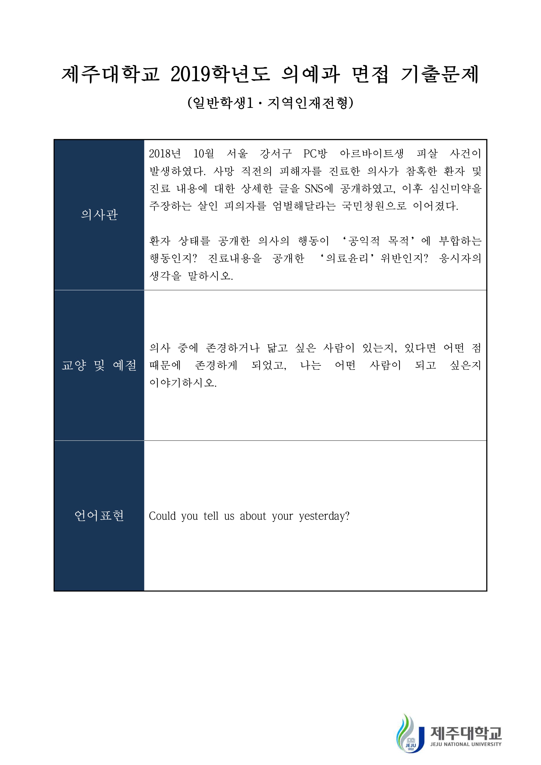 2020학년도 제주대학교 의예과 면접 기출문제 (일반학생 지역인재전형) 2019학년도 제주대학교 의예과 면접 기출문제 (일반학생 · 지역인재전형)