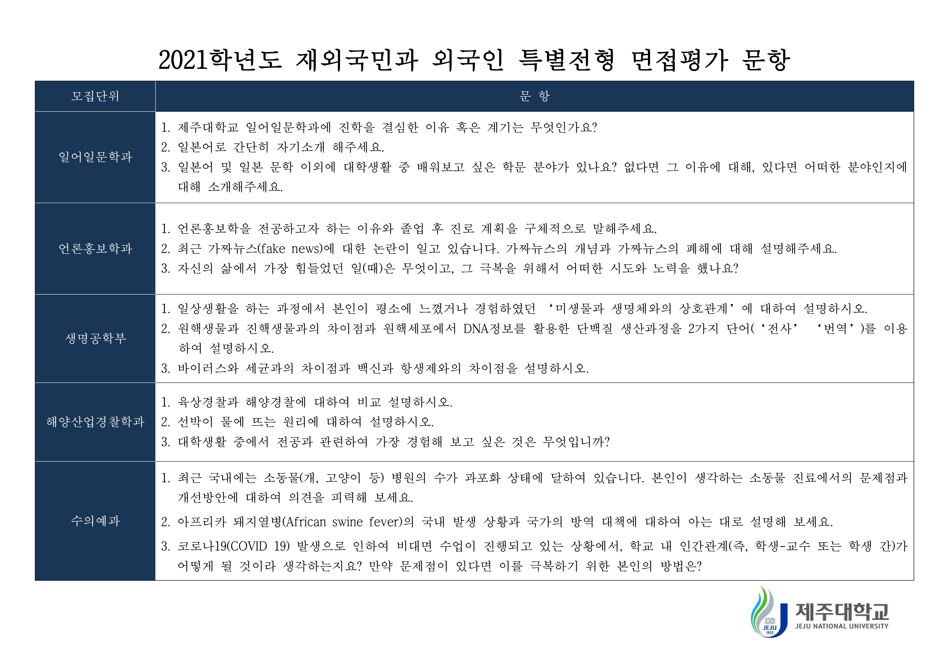 2021학년도 제주대학교 편입학 면접고사 기출문제 3. 제주대학교 2021학년도 편입학 면접 기출문제.pdf0.12MB2021학년도 제주대학교 재외국민과 외국인 특별전형 면접평가 문항