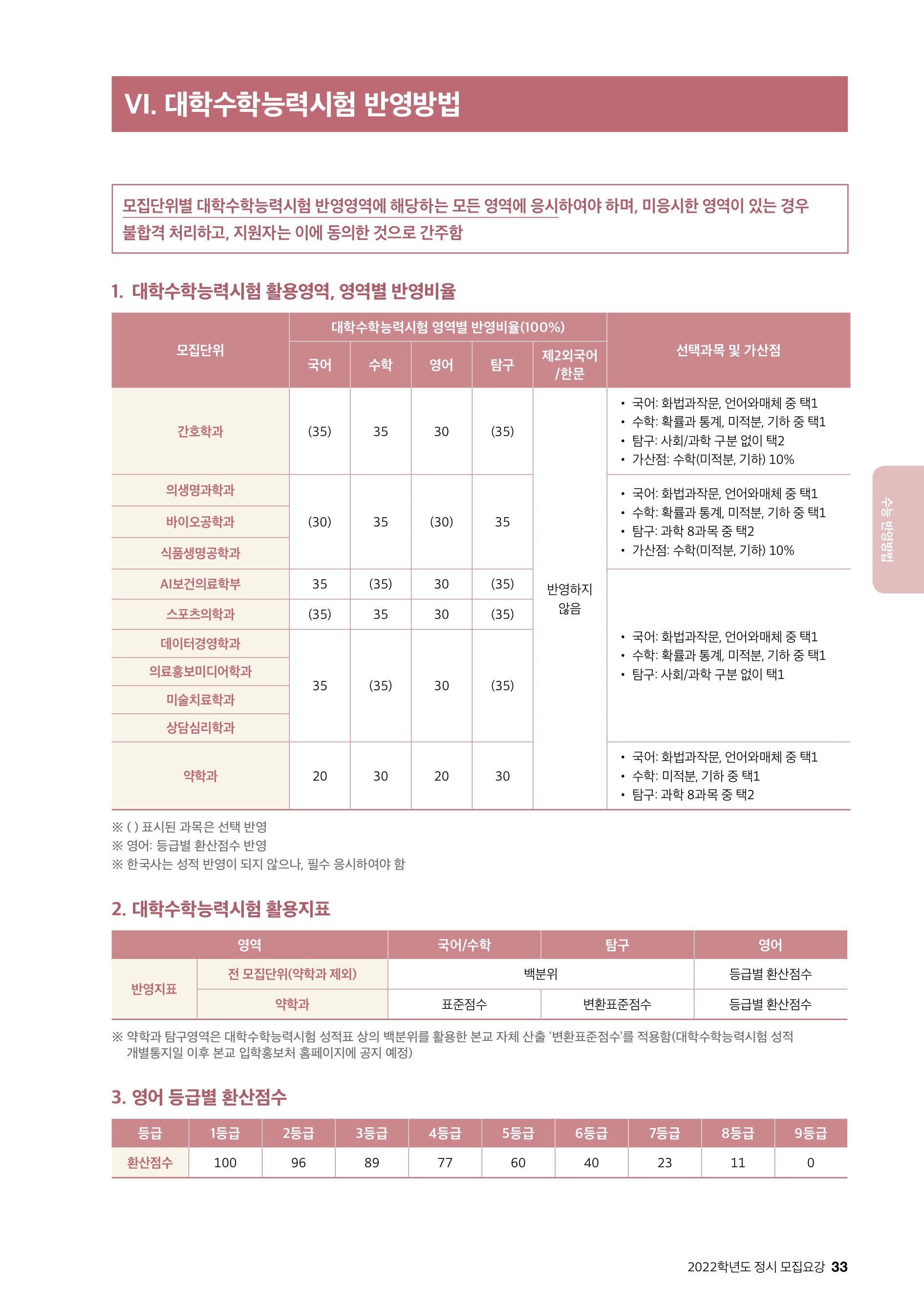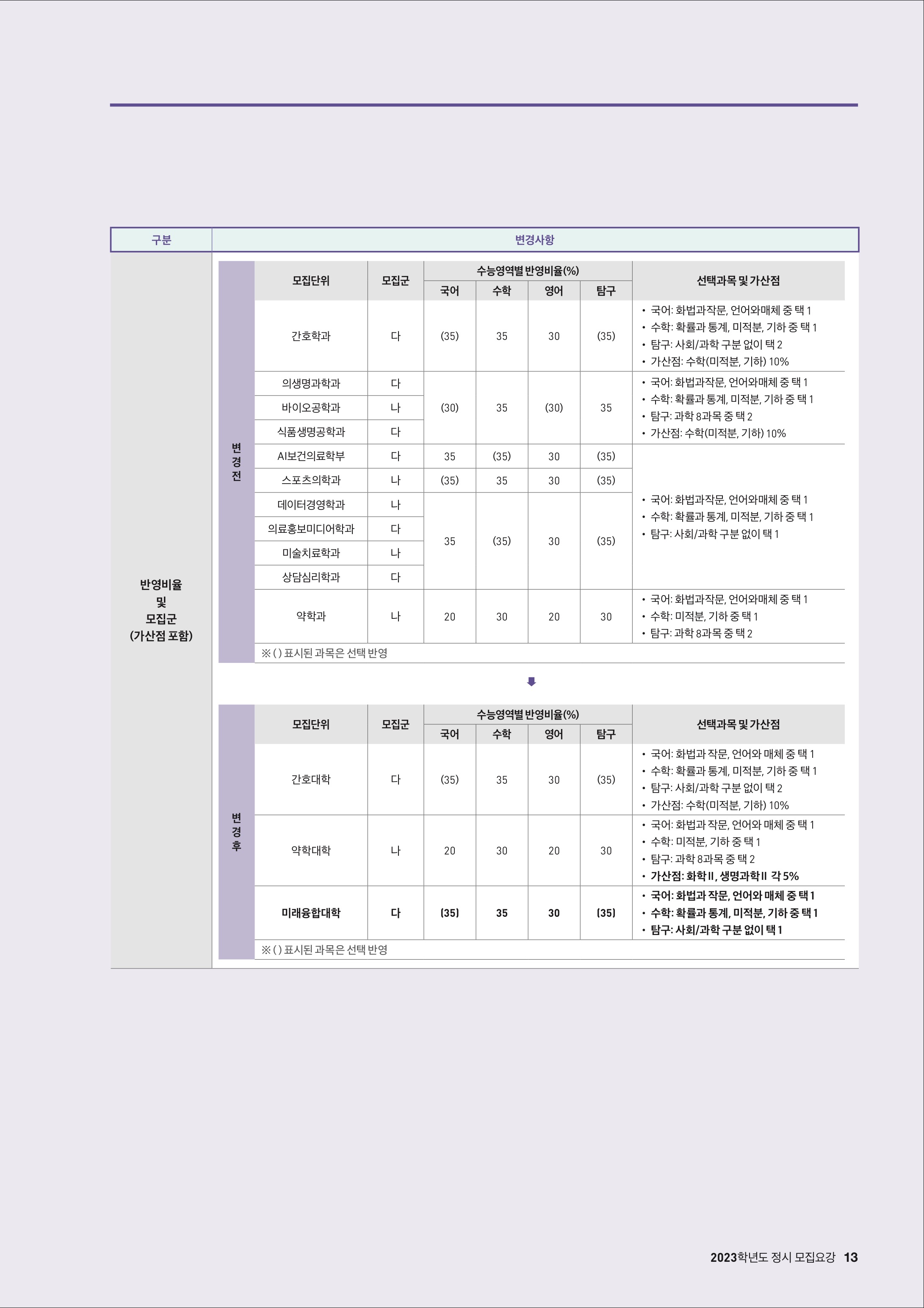- 국어 또는 영어 반영: 의생명과학과, 바이오공학과, 식품생명공학과
