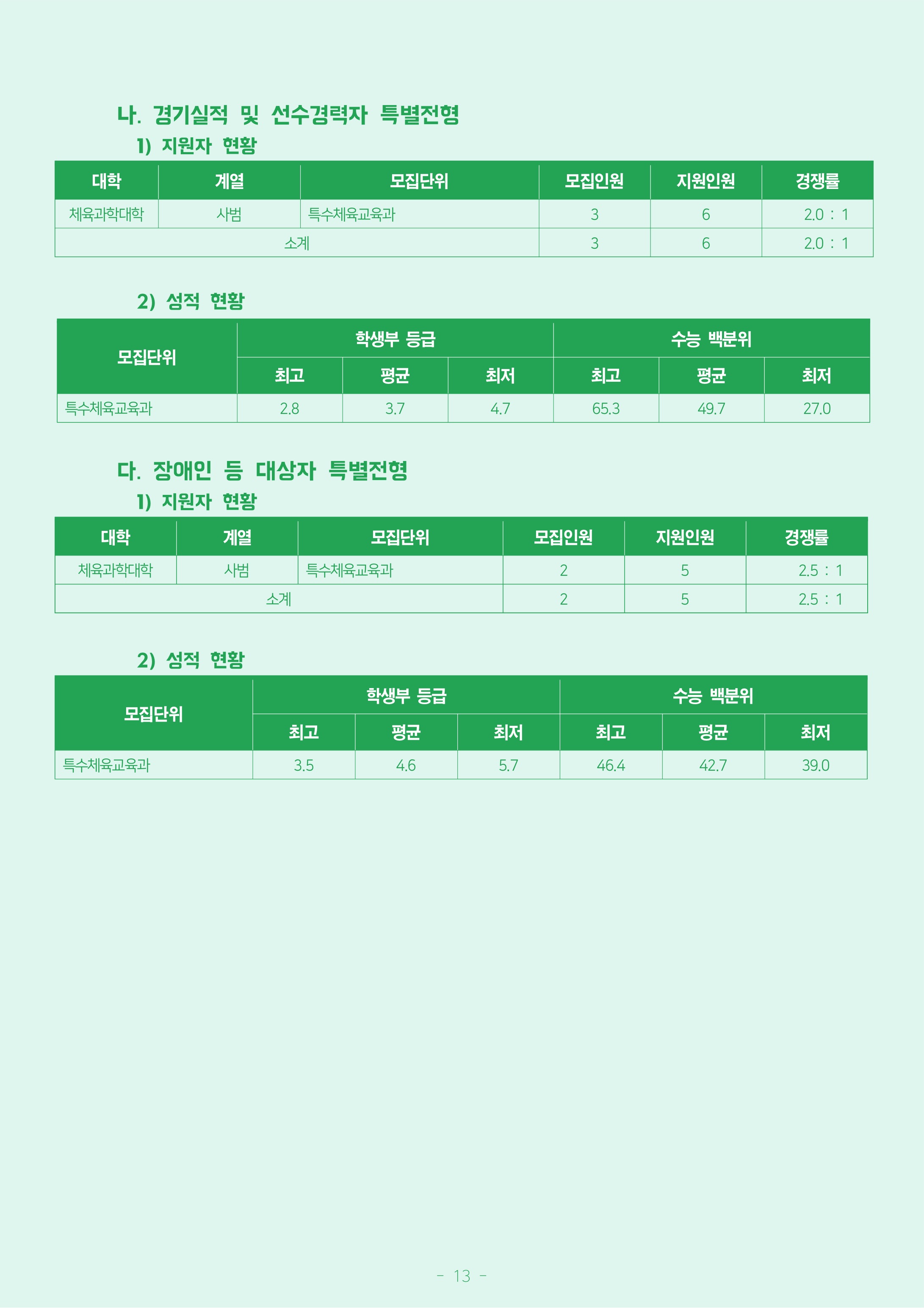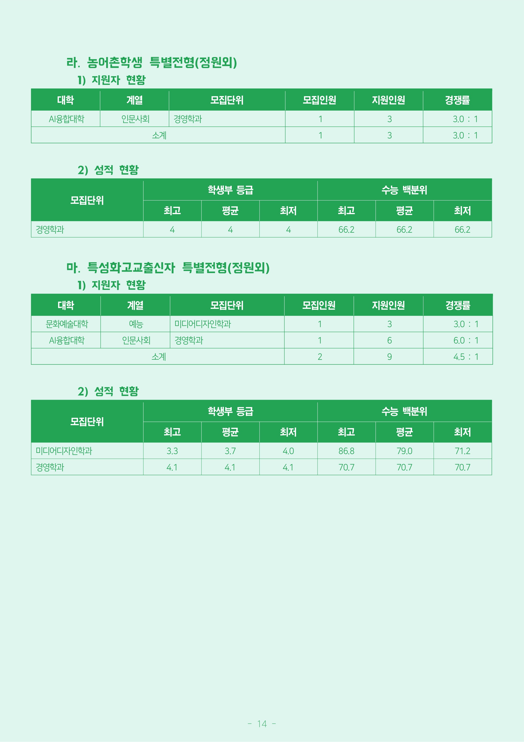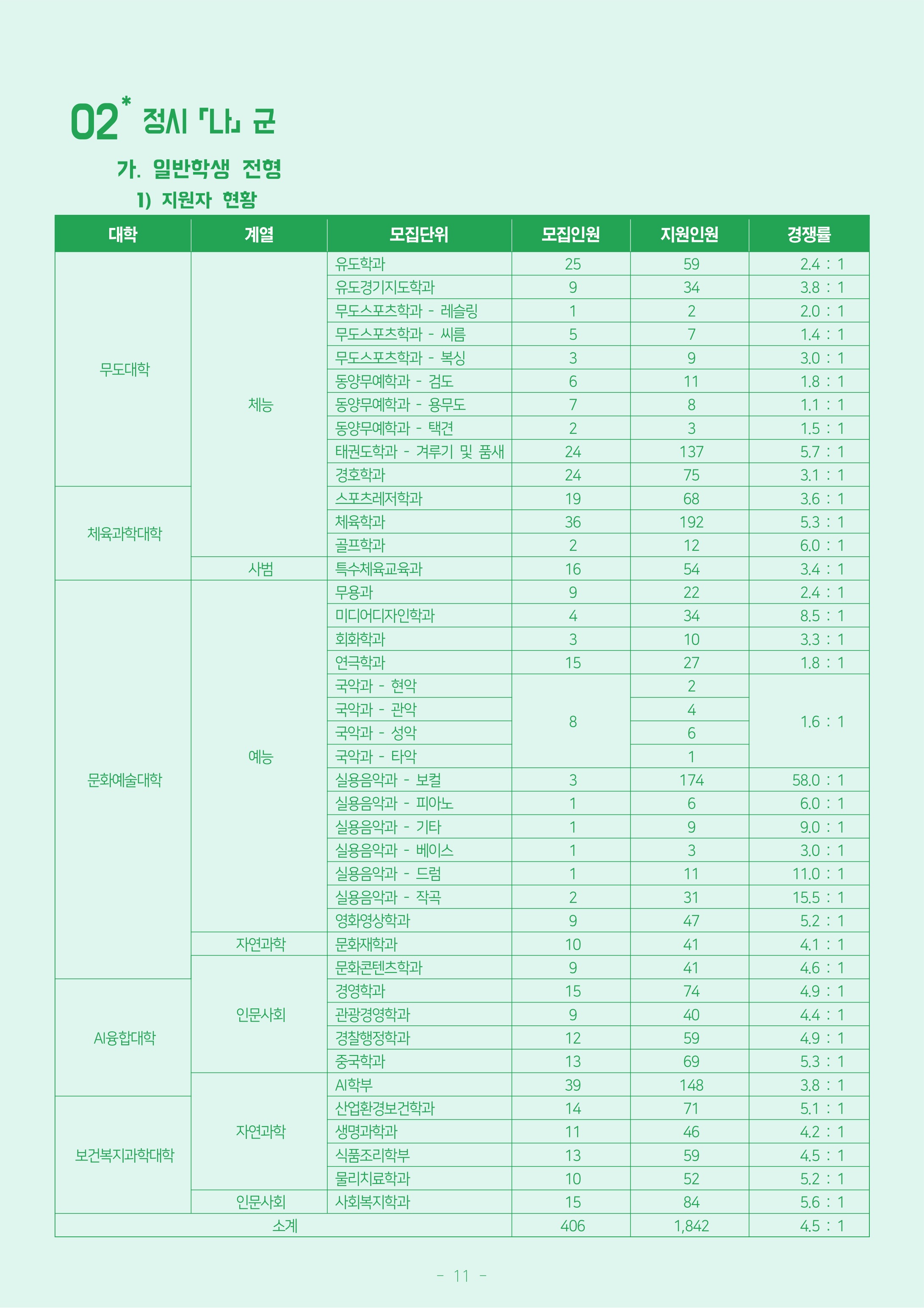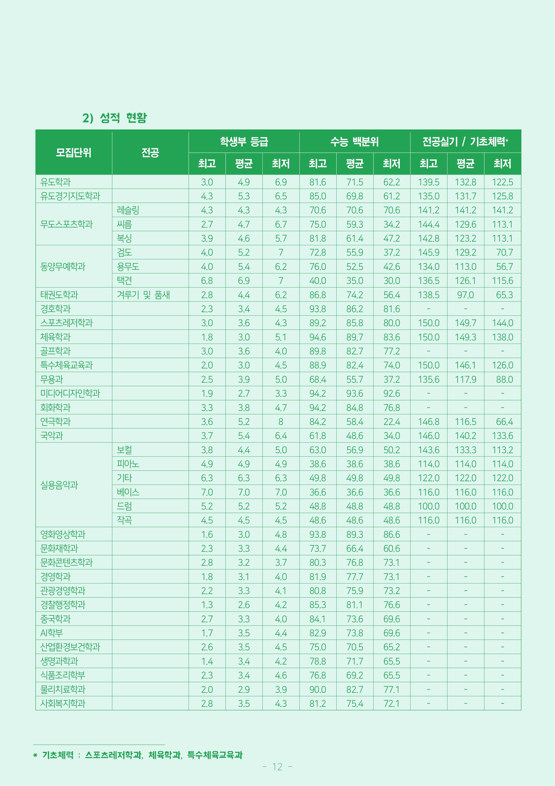 (수능)국어 수학 탐구 평균 영어 백분위 나군 유도학과 25 2.4 : 1 133 200 - - 16.5 33.25 3 유도경기지도학과 9 3.8 : 1 131.08 200 - - 15.5 32.75 3 무도스포츠학과 - 레슬링 9 2.0 : 1 141.2 200 - - 25.6 35.30 4 무도스포츠학과 - 씨름 1.4 : 1 118.4 200 - - 13.2 31.60 3 무도스포츠학과 - 복싱 3.0 : 1 104 200 - - 2.2 26.10 3 동양무예학과 - 검도 15 1.8 : 1 98.6 200 - - 9.4 24.70 5 동양무예학과 - 용무도 1.1 : 1 89.52 200 - - 9.8 22.40 6 동양무예학과 - 택견 1.5 : 1 66 200 - - 13.8 16.90 9 태권도학과 - 겨루기 및 품새 24 5.7 : 1 139.72 200 - - 24.6 34.80 4 경호학과 24 3.1 : 1 295.68 350 - - 34.5 42.25 3 스포츠레저학과 19 3.6 : 1 169.76 200 - - 34.9 42.45 3 체육학과 36 5.3 : 1 176.2 200 51 - 37.1 44.05 골프학과 2 6.0 : 1 282.17 350 - - 35.6 40.30 4 특수체육교육과 16 3.4 : 1 160.93 200 28 - 28.2 26.83 3 무용과 9 2.4 : 1 111.04 200 - - 15.5 27.75 5 미디어디자인학과 4 8.5 : 1 327.25 350 - - 33.5 46.75 1 회화학과 3 3.3 : 1 290.22 350 - - 32.9 41.45 3 연극학과 15 1.8 : 1 107.8 200 36.9 - 17 26.95 국악과 - 현악 8 1.6 : 1 104 200 - - 5.3 22.65 5 국악과 - 관악 국악과 - 성악 국악과 - 타악 실용음악과 - 보컬 9 58.0 : 1 110.84 200 - - 15.4 27.70 5 실용음악과 - 피아노 6.0 : 1 77.2 200 - - 3.6 19.30 6 실용음악과 - 기타 9.0 : 1 99.6 200 - - 14.8 24.90 6 실용음악과 - 베이스 3.0 : 1 73.2 200 - - 1.6 18.30 6 실용음악과 - 드럼 11.0 : 1 97.6 200 - - 8.8 24.40 5 실용음악과 - 작곡 15.5 : 1 97.2 200 - - 3.6 24.30 4 영화영상학과 9 5.2 : 1 305.2 350 - - 37.2 43.60 3 문화재학과 10 4.1 : 1 226 350 - 24.4 21.6 21.53 5 문화콘텐츠학과 9 4.6 : 1 261.077 350 26.6 - 23.7 24.87 3 경영학과 15 4.9 : 1 267.54 350 26.8 - 22.5 25.47 2 관광경영학과 9 4.4 : 1 260.531 350 26 - 27 24.80 4 경찰행정학과 12 4.9 : 1 278.11 350 24.6 10 17.8 19.88 2 중국학과 13 5.3 : 1 249.249 350 30 - 16.9 23.73 3 AI학부 39 3.8 : 1 251.207 350 - 30.4 17.1 23.93 3 산업환경보건학과 14 5.1 : 1 244.662 350 - 26.8 21.7 23.30 4 생명과학과 11 4.2 : 1 244.788 350 - 23.2 25.3 23.30 4 식품조리학부 13 4.5 : 1 236.64 350 - 23.1 20.2 22.53 3 물리치료학과 10 5.2 : 1 281.925 350 - 28 25.5 26.87 2 사회복지학과 15 5.6 : 1 260.86 350 28.4 - 24.7 24.83 4 '입시 정보 > 정시등급 입시 결과' 카테고리의 다른 글