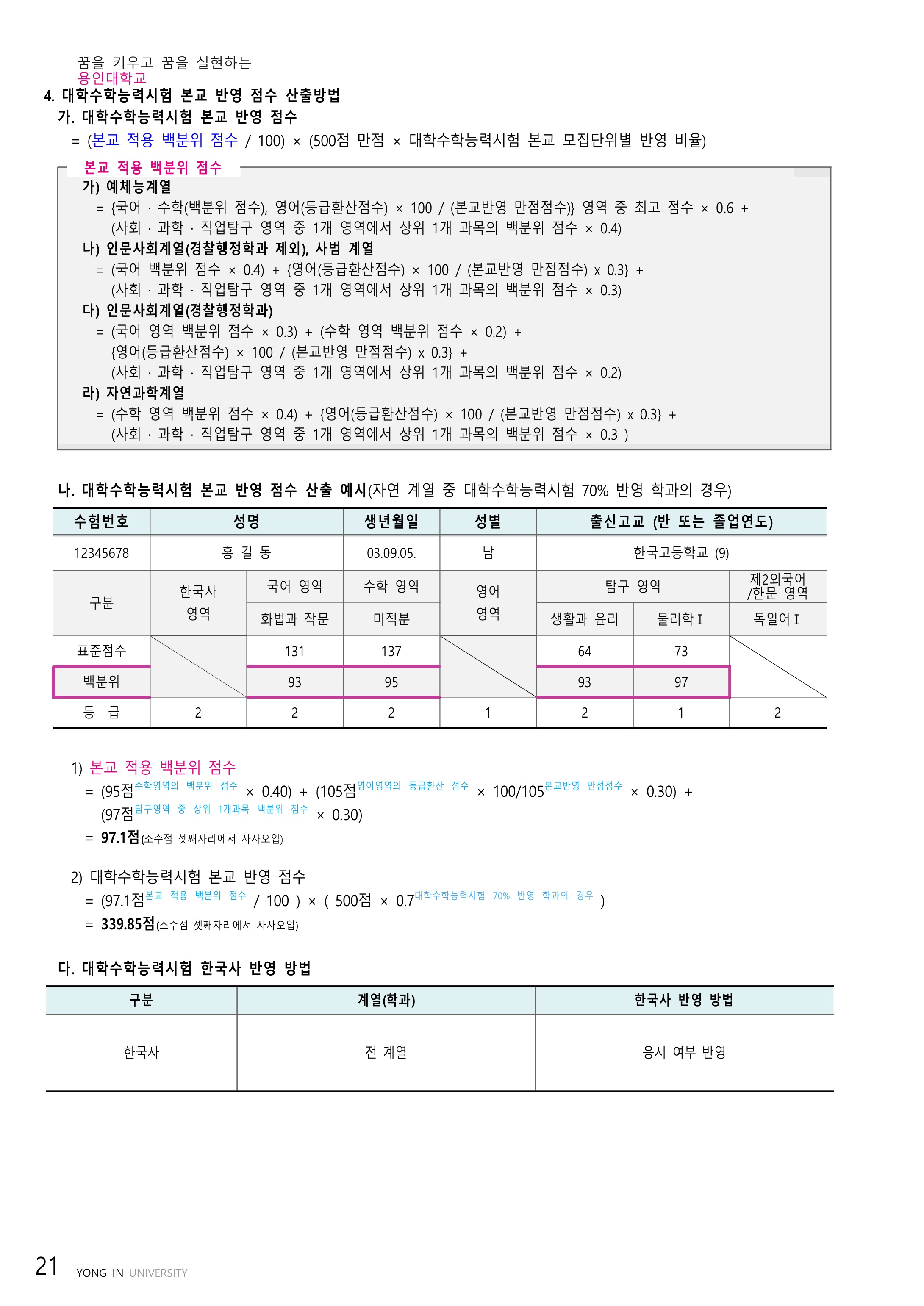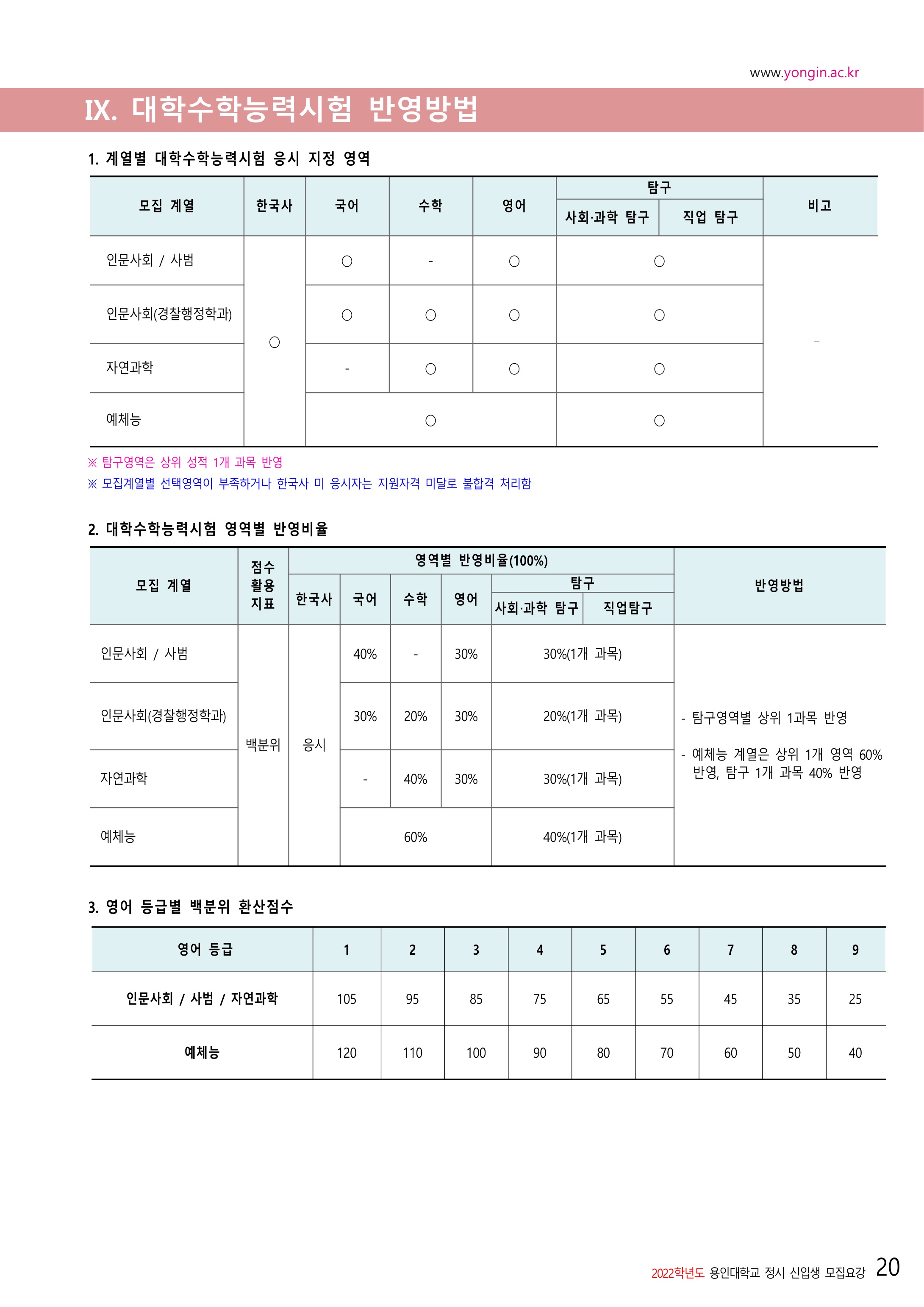 2022학년도 용인대학교 대학수학능력시험 반영방법 2022학년도 용인대학교 정시등급