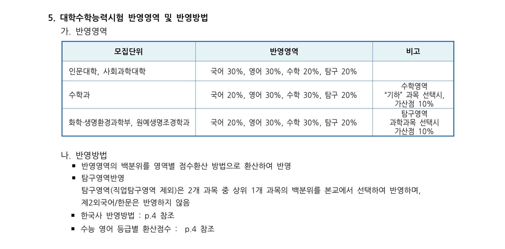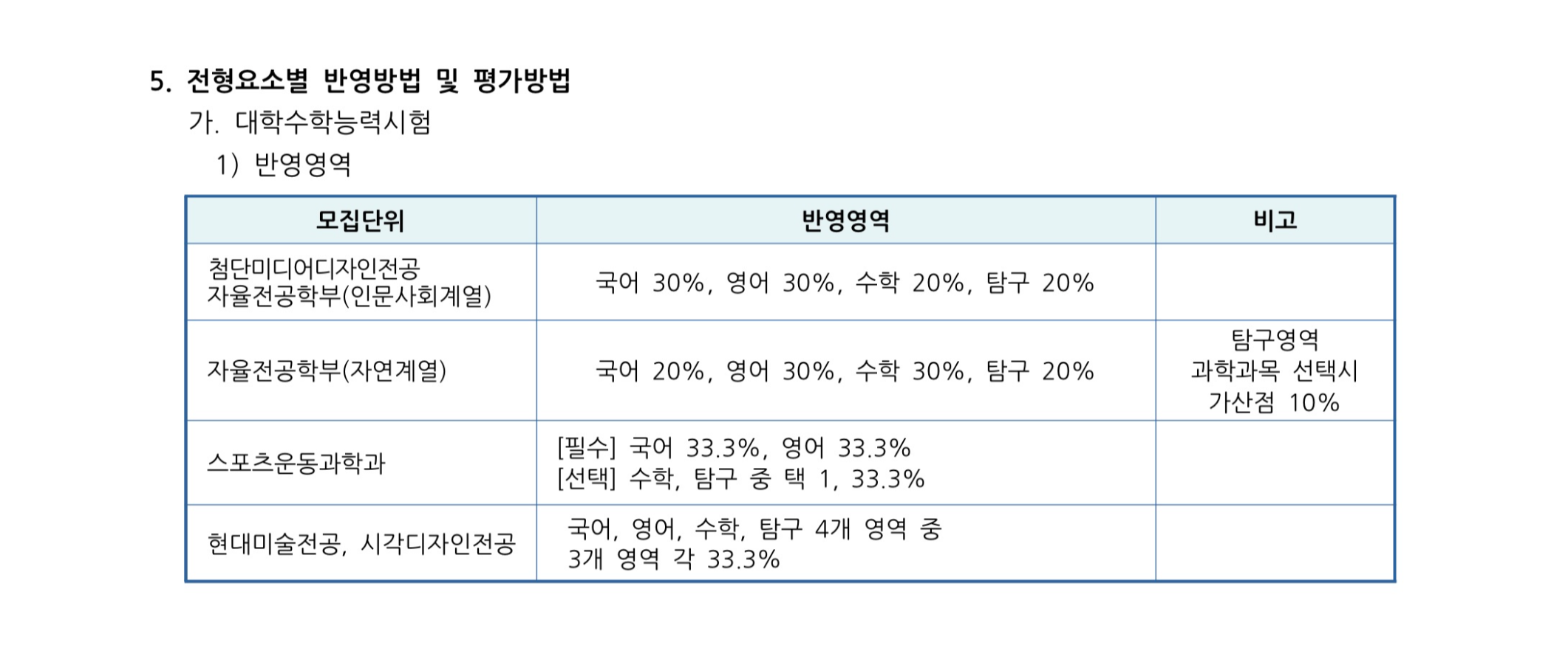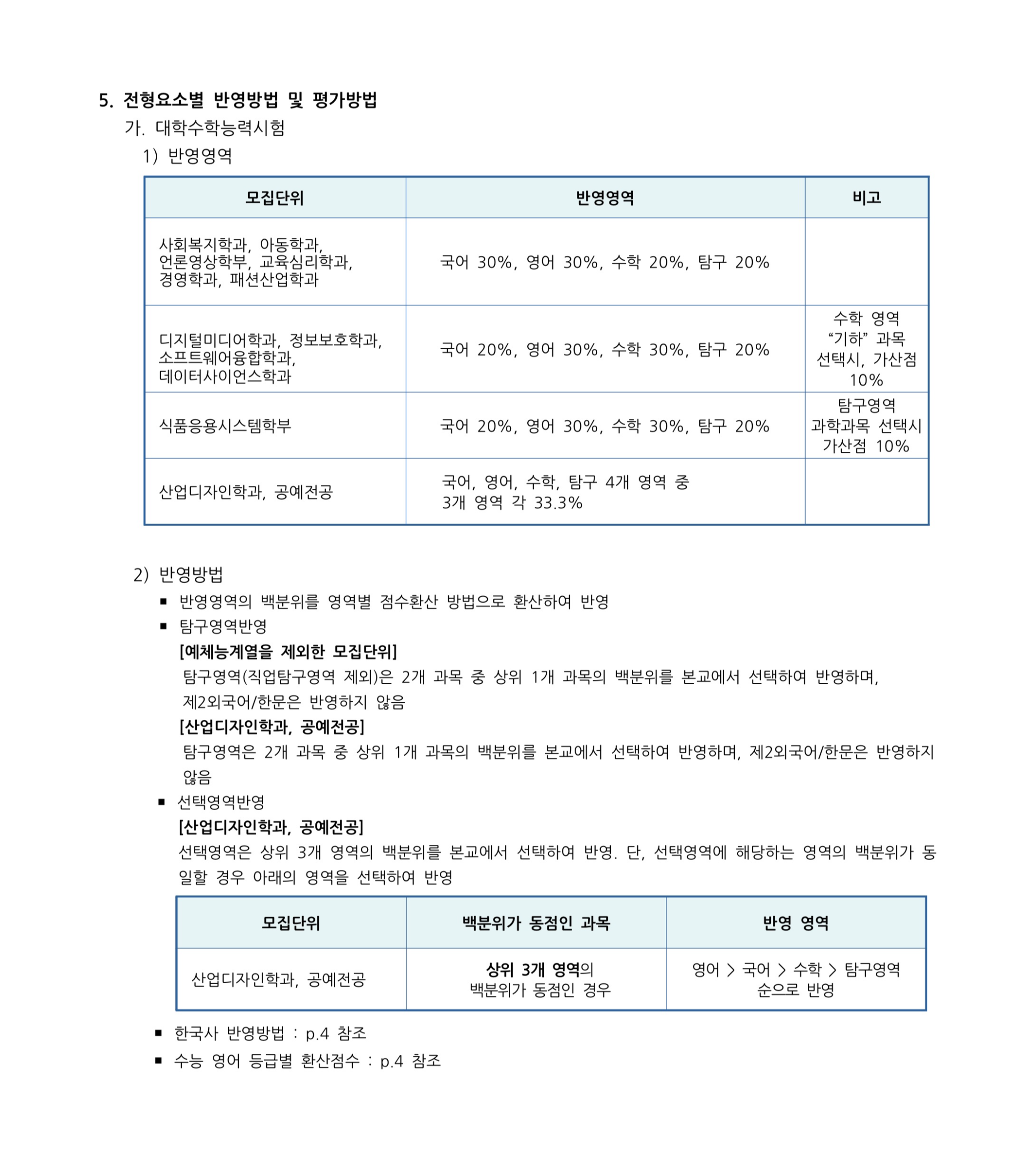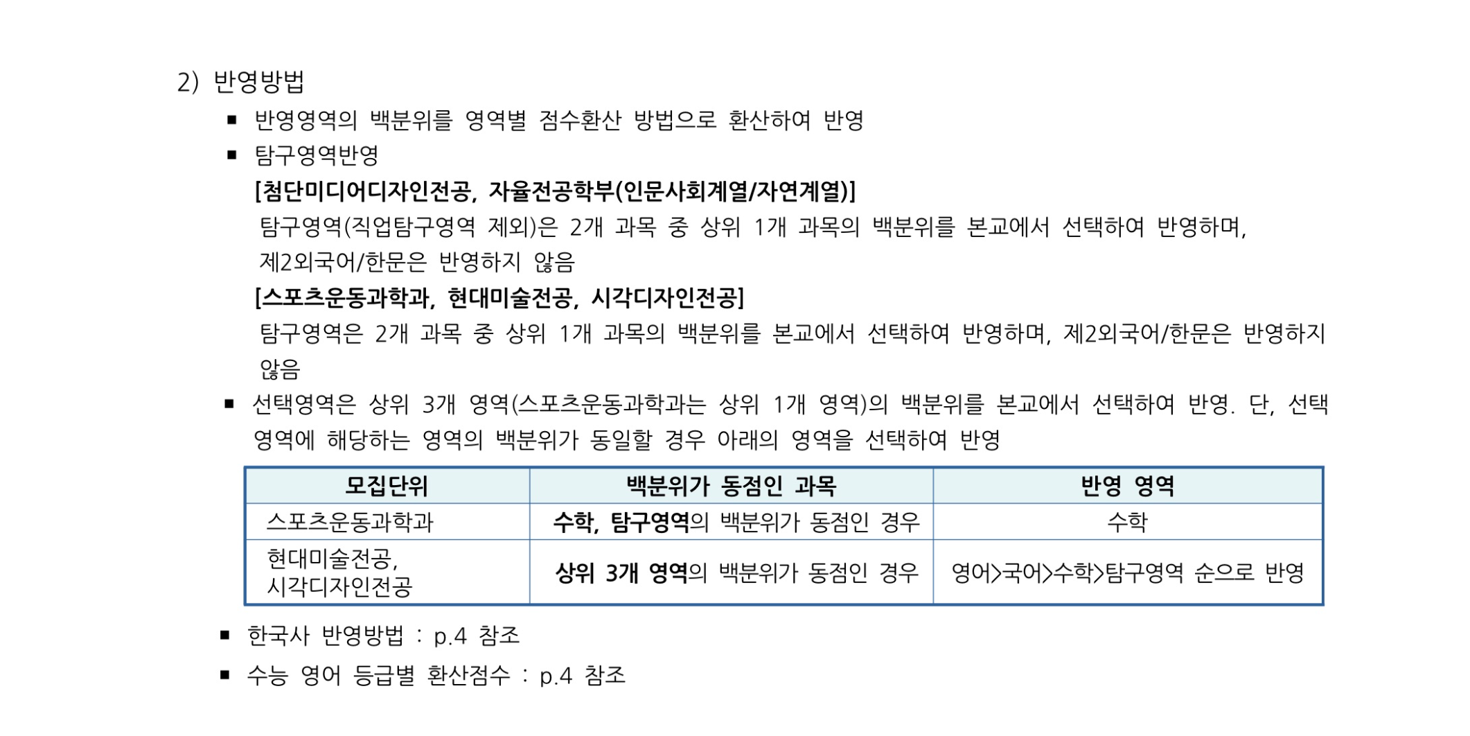 (산업디자인학과, 공예전공, 스포츠운동과학과, 현대미술전공, 시각디자인전공은 상위 3개 영역 반영)국어, 영어, 수학, 탐구 상위 3개 영역