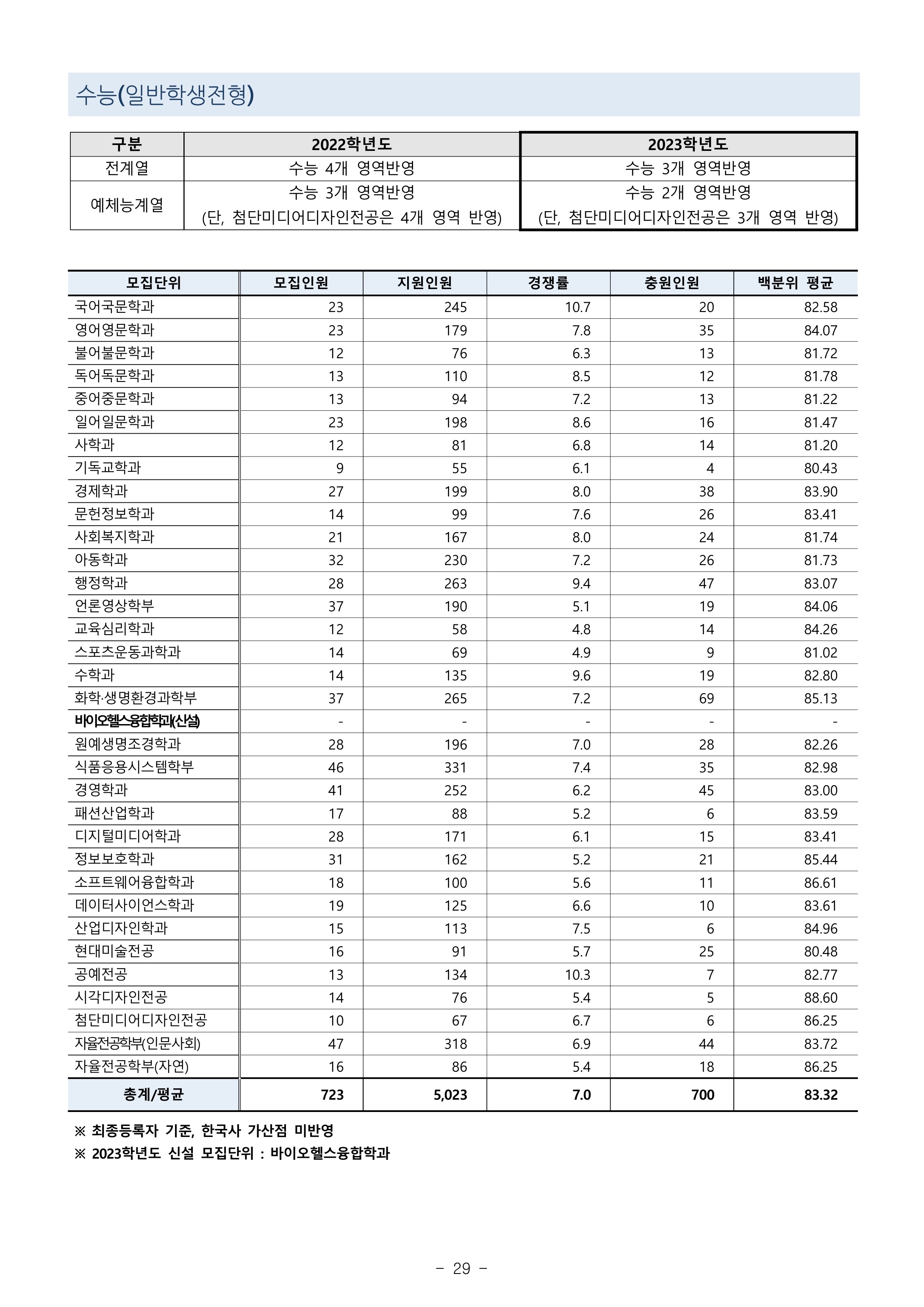 구분 2022학년도 2023학년도 비고 수능성적 반영영역 변경 국어, 영어, 수학, 탐구 4개 영역