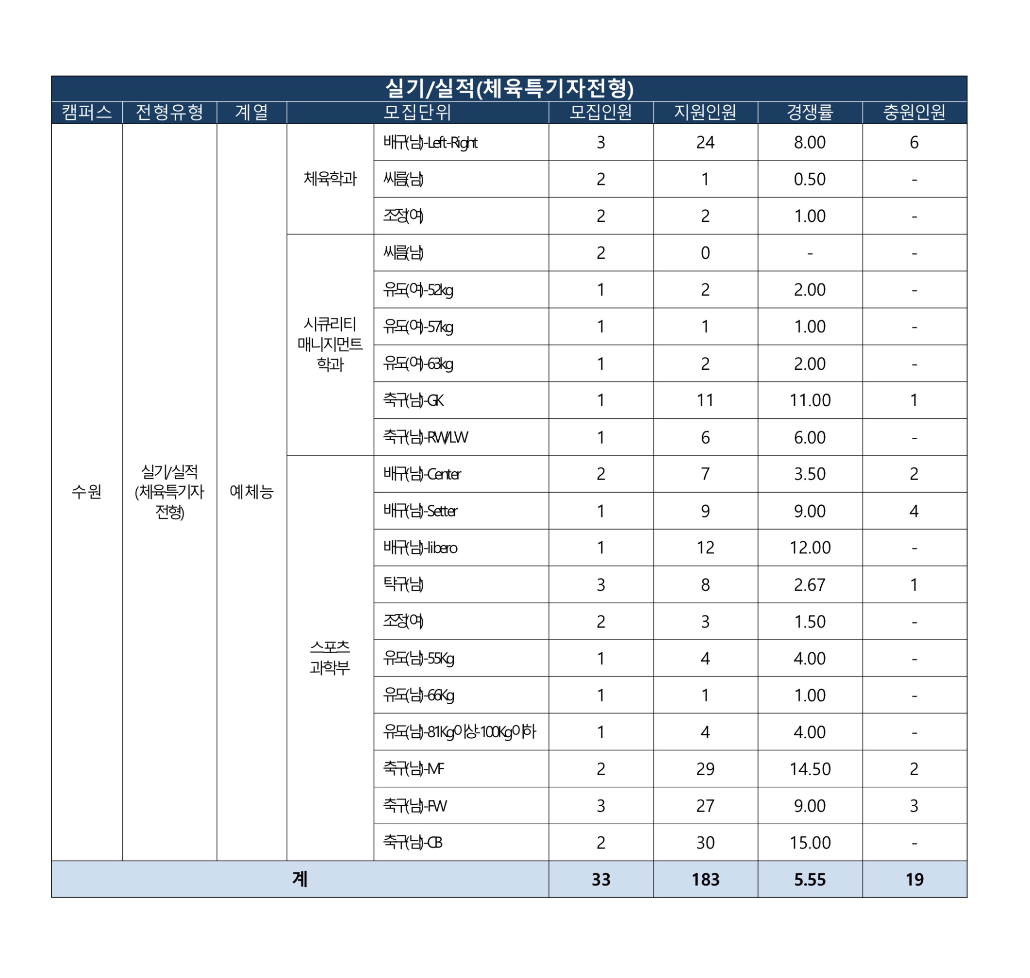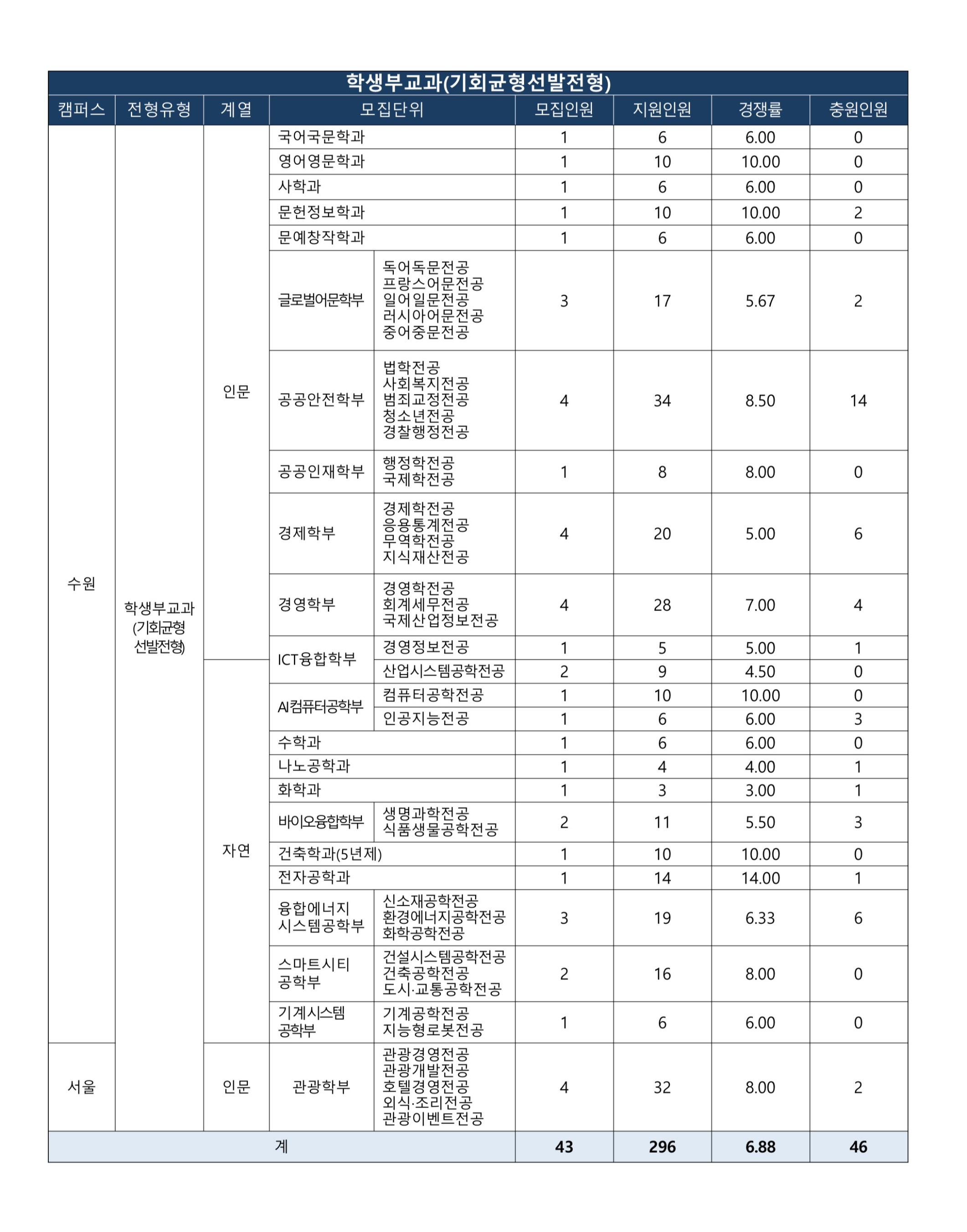 식품생물공학전공2 5.50 3 선발인원 3명 이하 건축학과(5년제) 1 10.00 0 선발인원 3명 이하 전자공학과 1 14.00 1 선발인원 3명 이하 융합에너지시스템