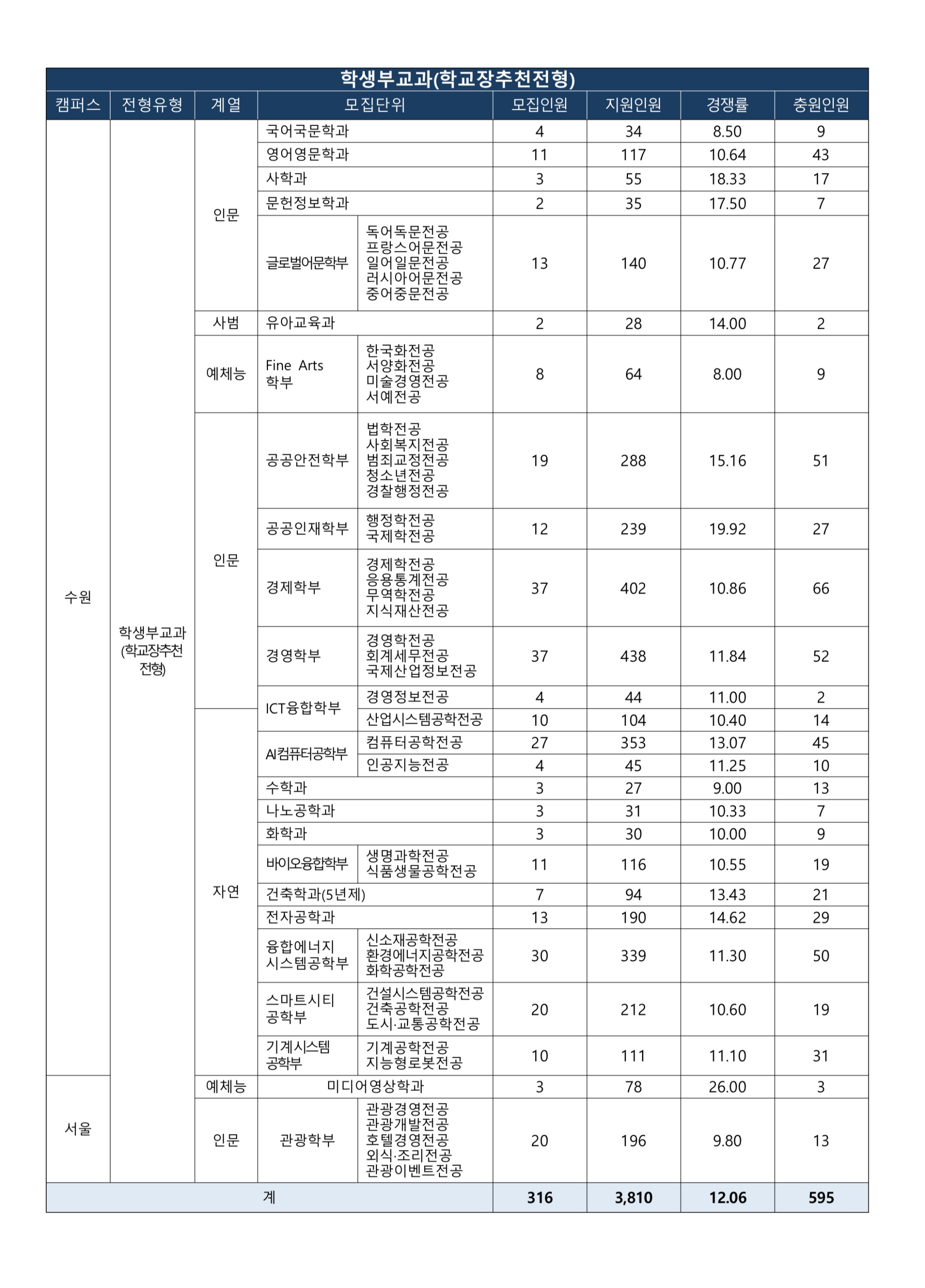국제산업정보전공37 11.83 52 98.20 95.50 100 2.89 3.04 ICT융합학부 경영정보전공 4 1100 2 선발인원 3명 이하 ICT융합학부 산업시스템공학전공 10 9.45 14 95.50 95.50 100 3.61 3.69 AI컴퓨터공학부 컴퓨터공학전공 27 13.57 45 95.50 95.50 100 3.12 3.19 AI컴퓨터공학부 인공지능전공 4 11.25 10 95.50 95.50 100 3.32 3.32 수학과 3 9.00 13 선발인원 3명 이하 나노공학과 3 10.33 7 선발인원 3명 이하 화학과 3 10.00 9 선발인원 3명 이하 바이오융합학부 생명과학전공