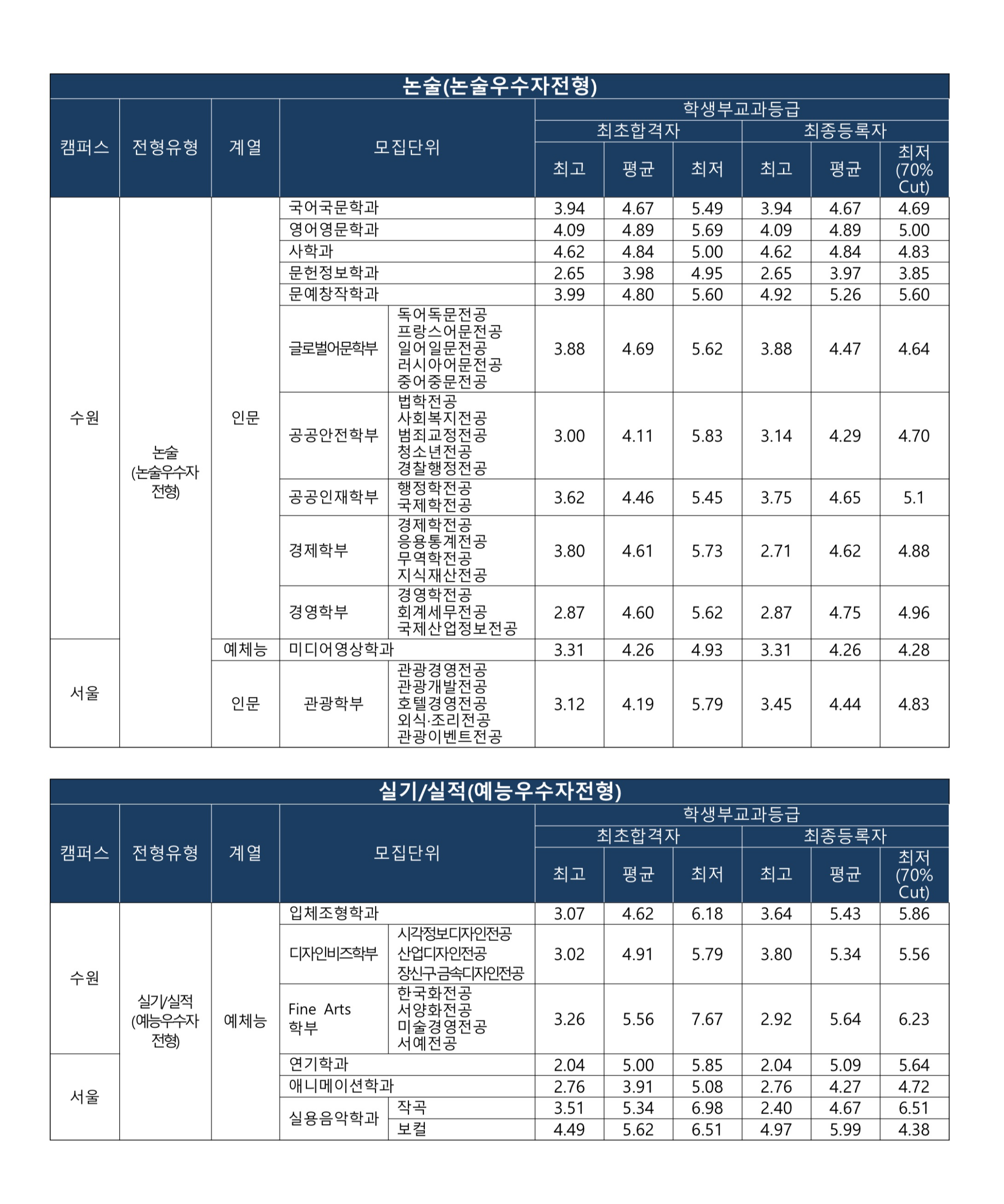 2022학년도 경기대학교 논술전형 수시등급 2022학년도 경기대학교 실기/실적전형 수시등급