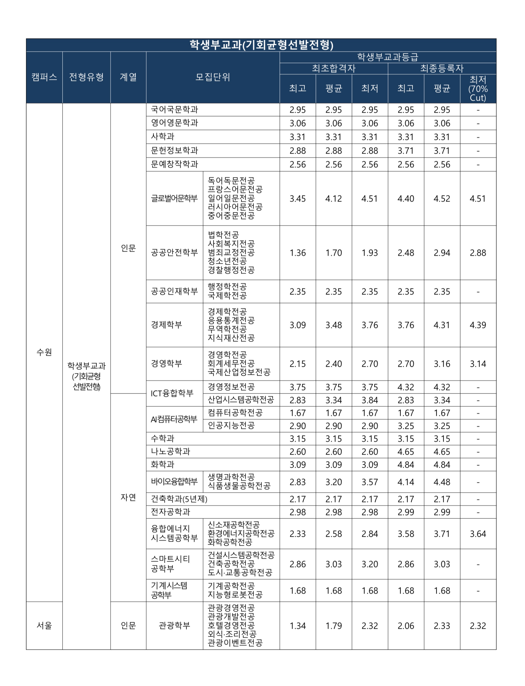 관광이벤트전공12 7.16 18 95.50 95.50 100 2.96 3.10 모집단위 학생부교과(기회균형선발전형) 모집