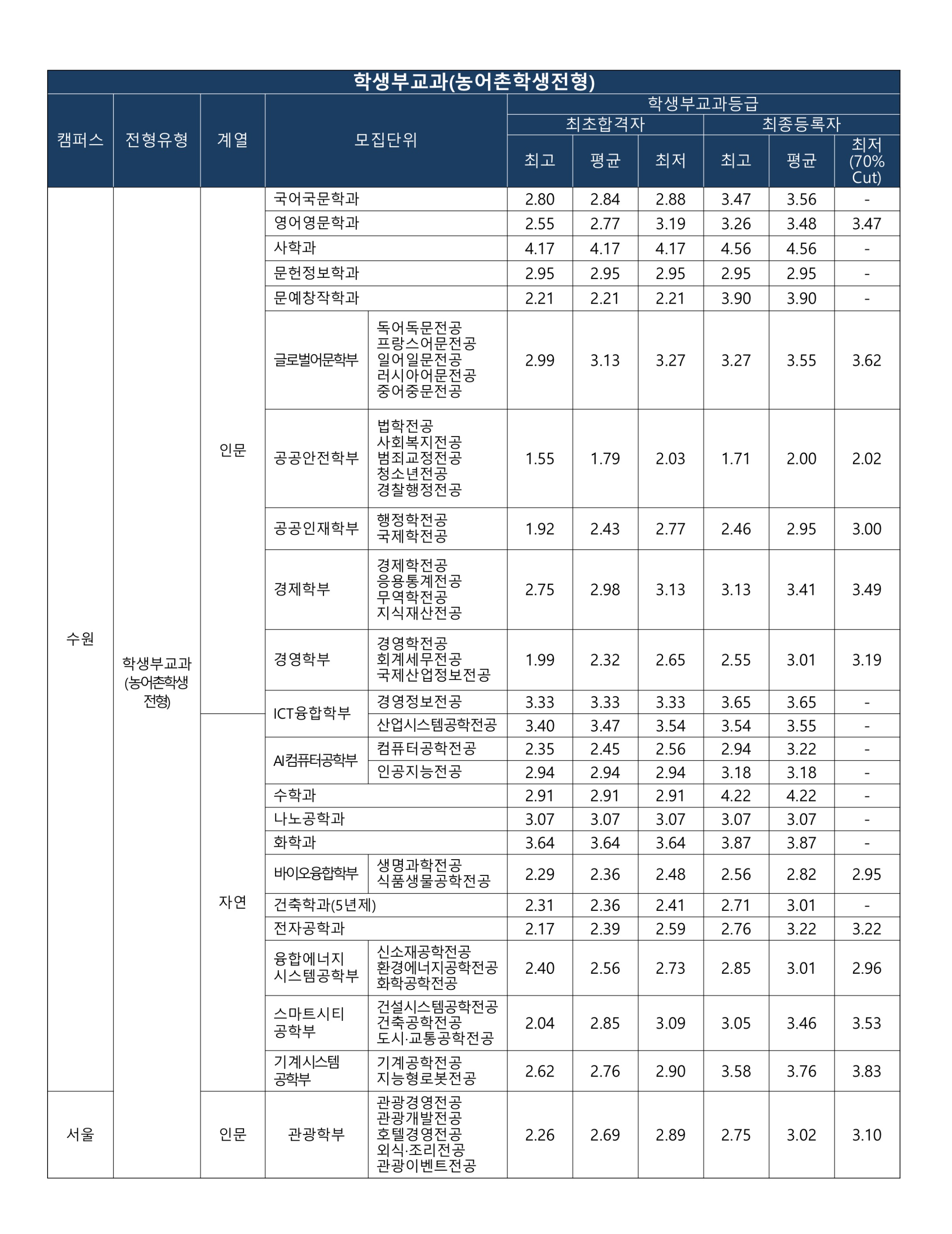 반영 교과목50% cut 70% cut 영어영문학과 1 14.00 0 선발인원 3명 이하 전 교과