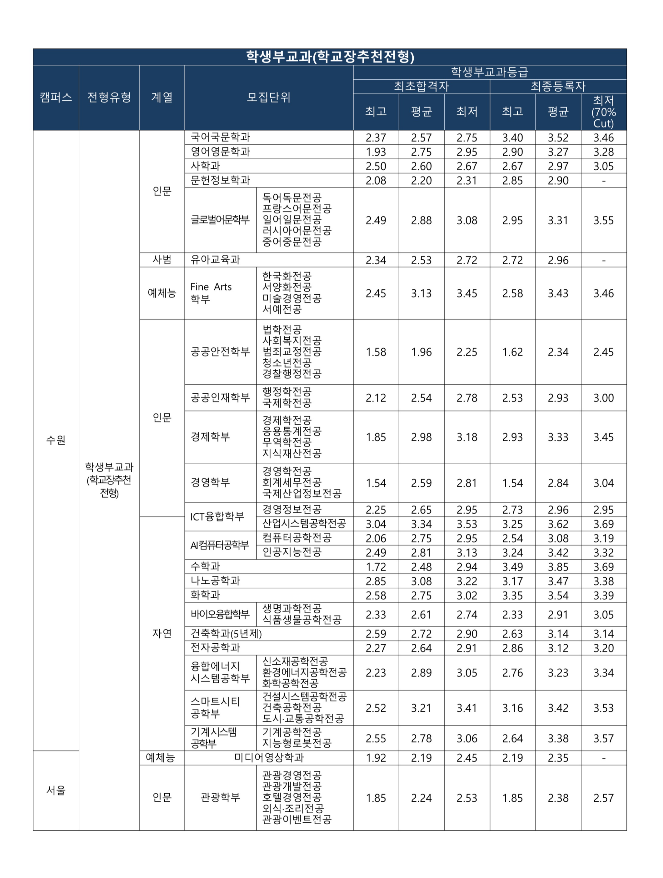 반영 교과목50% cut 70% cut 국어국문학과 14 6.21 16 3.58 3.70 전 교과