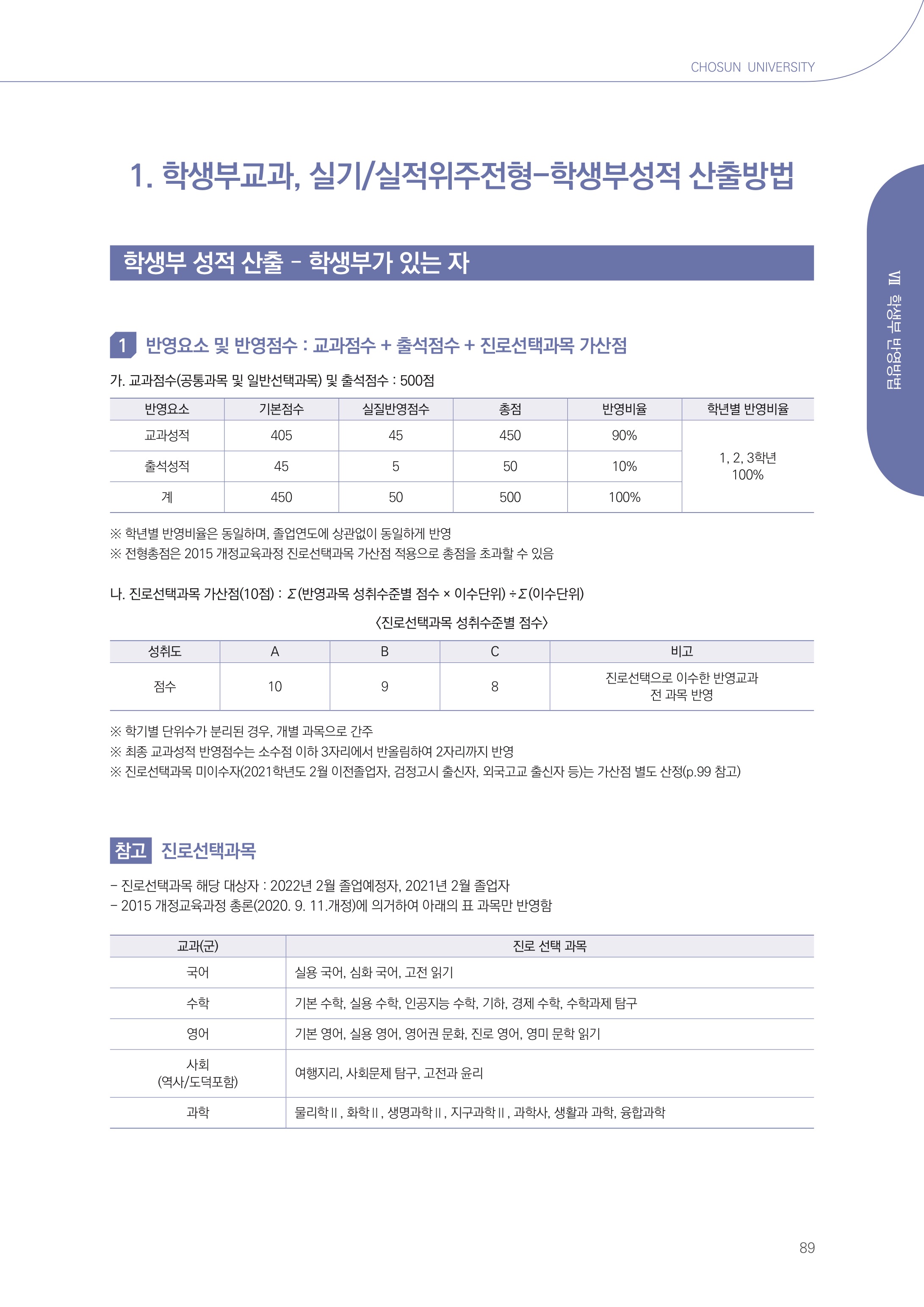2022학년도 조선대학교 학생부성적 산출방법