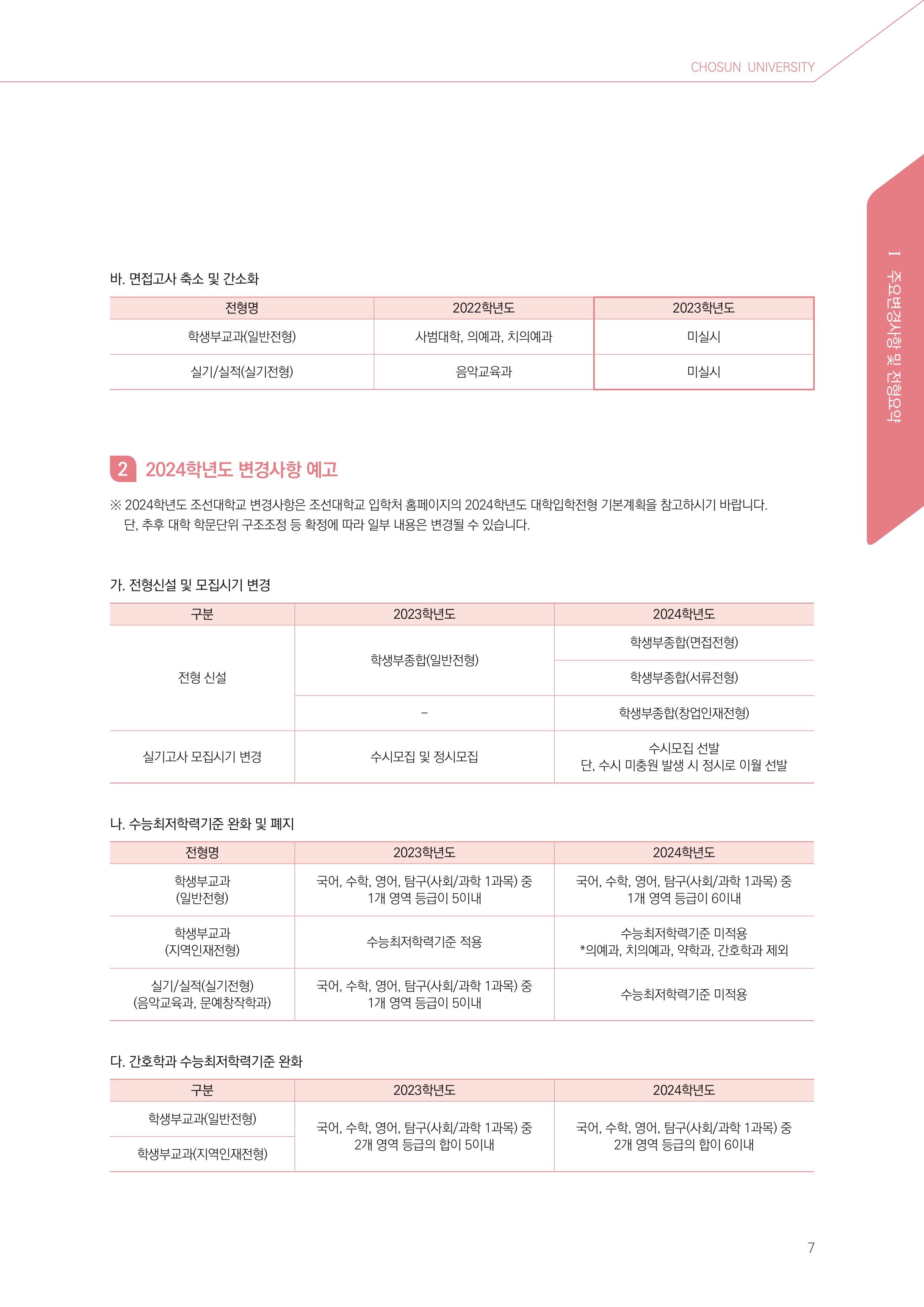 2023학년도 조선대학교 수시모집 전년 대비 변경사항 2023학년도 조선대학교 수시모집 전형 요약