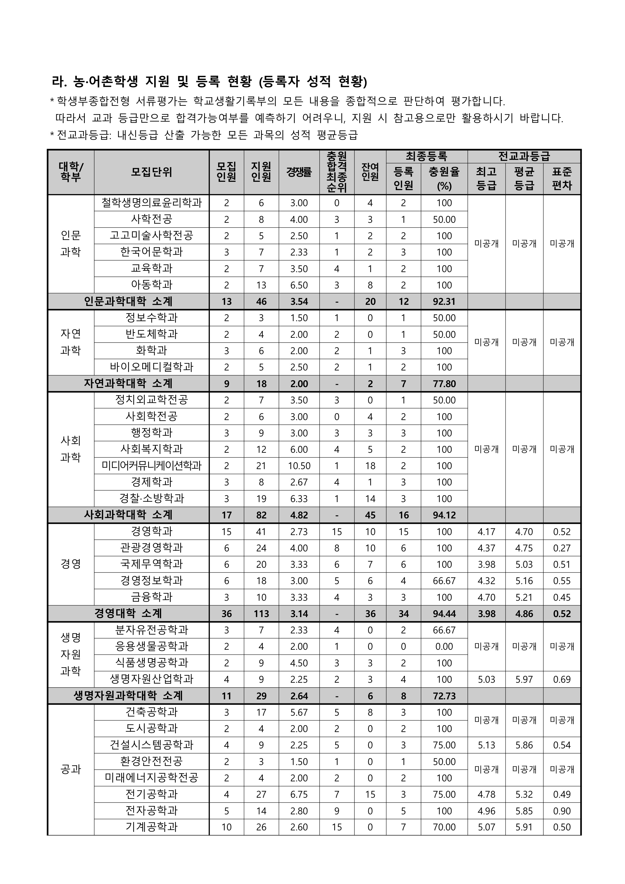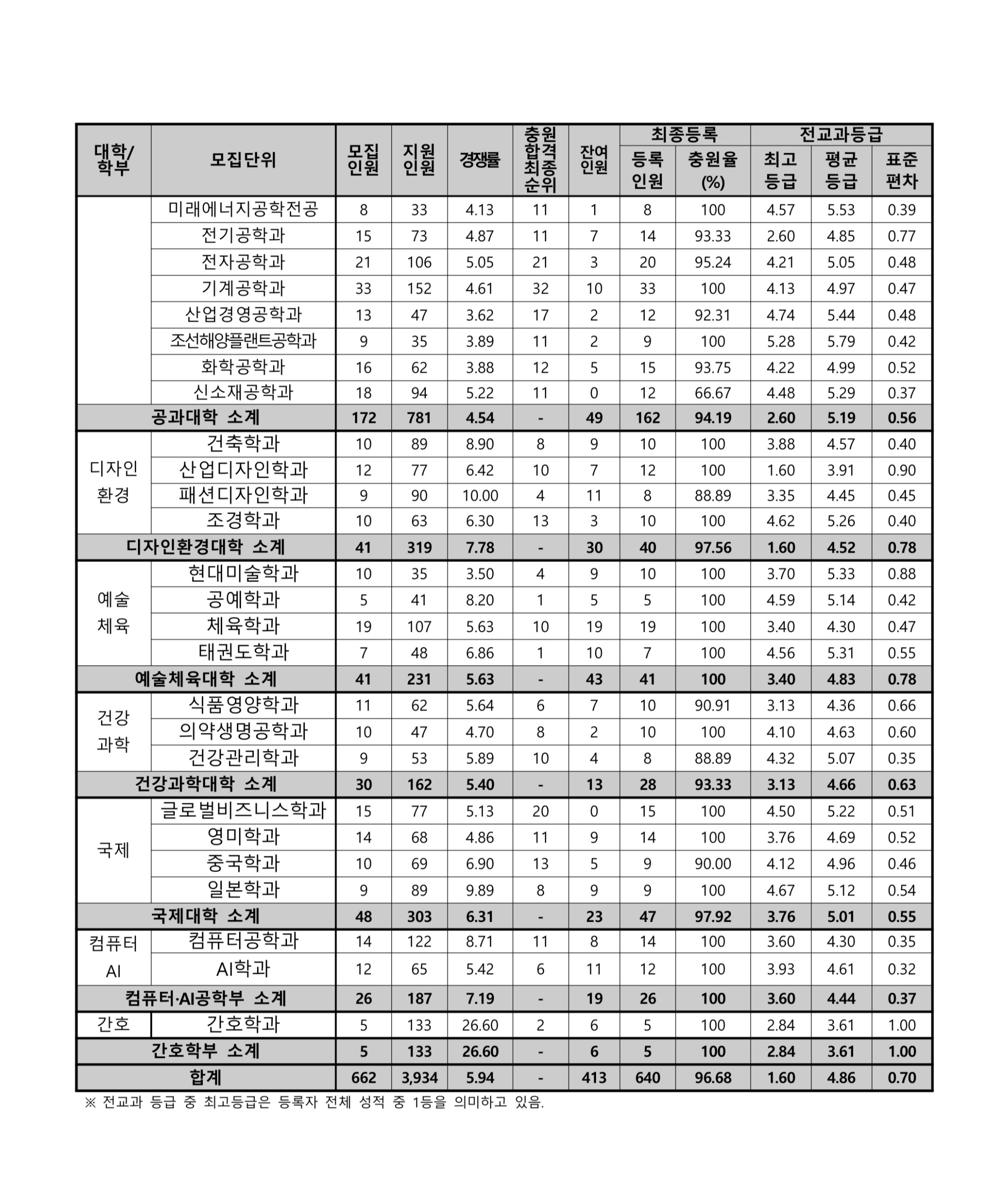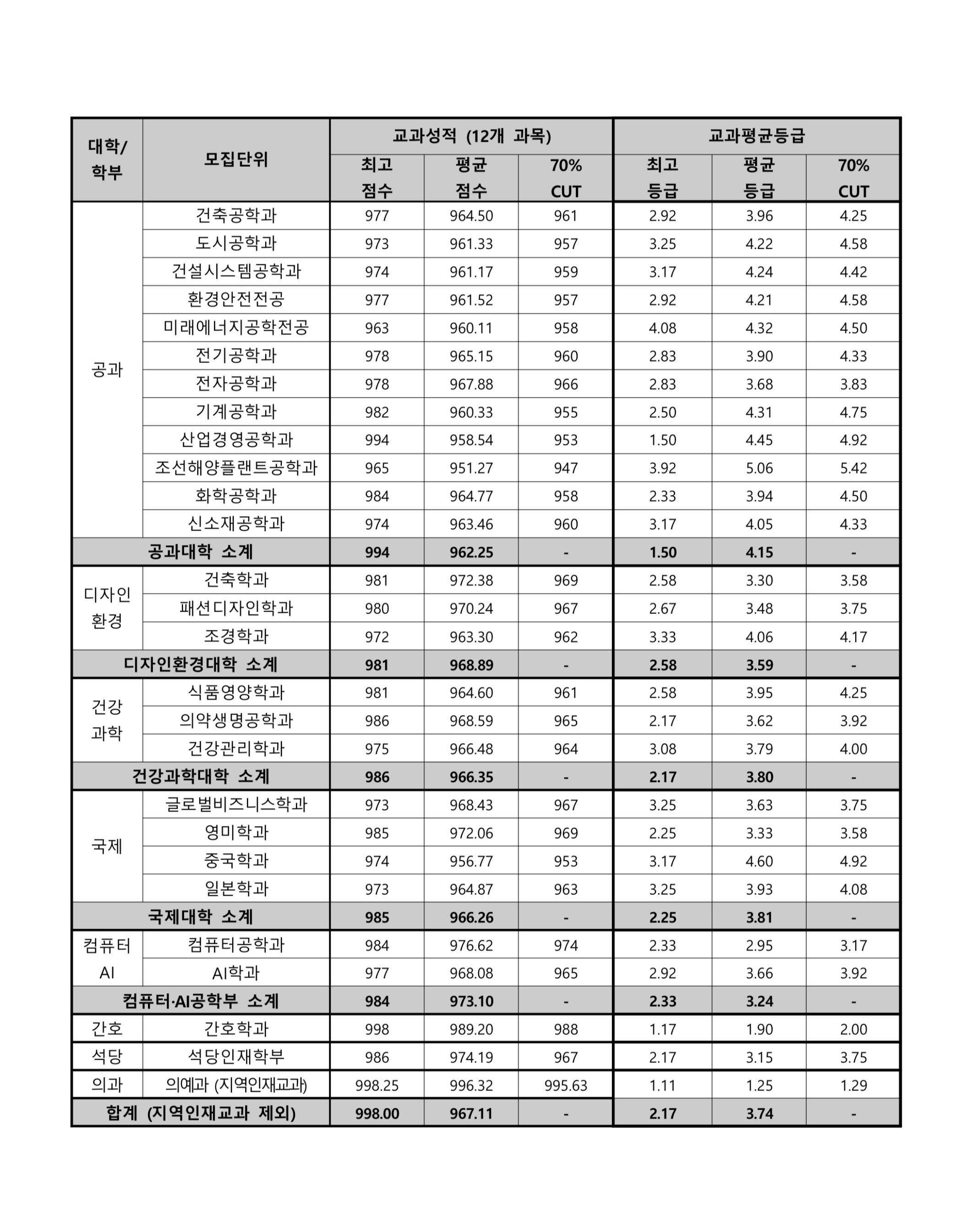 반영 교과목50% cut 70% cut 철학생명의료윤리학과 12 5.33 12 5.38 5.42 전과목 사학전공 7 9.86 9 4.78 4.79 전과목 고고미술사학전공 7 4.43 2 4.97 4.98 전과목 한국어문학과 12 4.33 7 4.64 4.93 전과목 교육학과 6 7.50 2 3.83 4.02 전과목 아동학과 7 8.71 13 4.63 4.77 전과목 정보수학과 8 4.25 7 5.83 6.08 전과목 반도체학과 8 6.13 6 5.14 5.72 전과목 화학과 11 2.73 11 5.66 6.12 전과목 바이오메디컬학과 8 6.25 9 4.36 4.66 전과목 정치외교학전공 7 5.29 4 4.91 4.99 전과목 사회학전공 6 5.00 2 4.62 4.88 전과목 행정학과 10 5.50 4 4.09 4.20 전과목 사회복지학과 6 13.17 1 4.13 4.20 전과목 미디어커뮤니케이션학과 10 19.00 2 3.66 3.94 전과목 경제학과 14 4.21 15 4.46 4.94 전과목 경찰·소방학과 13 14.23 7 4.16 4.23 전과목 경영학과 46 5.37 28 4.43 4.71 전과목 관광경영학과 18 5.67 9 4.76 4.93 전과목 국제무역학과 18 4.50 10 5.02 5.40 전과목 경영정보학과 18 4.39 9 4.70 4.93 전과목 금융학과 10 4.60 7 4.75 4.89 전과목 융합경영학과 1 6.00 0 분자유전공학과 12 3.33 11 5.35 5.80 전과목 응용생물공학과 9 3.11 8 4.99 5.39 전과목 식품생명공학과 9 4.67 7 4.95 5.06 전과목 생명자원산업학과 6 4.50 6 5.49 5.87 전과목 건축공학과 9 6.33 11 4.80 4.88 전과목 도시공학과 9 4.56 2 5.22 5.41 전과목 건설시스템공학과 13 4.00 13 5.34 5.70 전과목 환경안전전공 8 3.63 11 5.61 5.84 전과목 미래에너지공학전공 8 4.13 11 5.59 5.75 전과목 전기공학과 15 4.87 11 4.98 5.31 전과목 전자공학과 21 5.05 21 5.05 5.29 전과목 기계공학과 33 4.61 32 4.90 5.05 전과목 산업경영공학과 13 3.62 17 5.21 5.77 전과목 조선해양플랜트공학과 9 3.89 11 5.64 5.75 전과목 화학공학과 16 3.88 12 4.80 5.08 전과목 신소재공학과 18 5.22 11 5.22 5.50 전과목 건축학과 10 8.90 8 4.62 4.68 전과목 산업디자인학과 12 6.42 10 3.89 4.30 전과목 패션디자인학과 9 10.00 4 4.62 4.72 전과목 조경학과 10 6.30 13 5.21 5.47 전과목 현대미술학과 10 3.50 4 5.12 6.00 전과목 공예학과 5 8.20 1 5.21 5.53 전과목 체육학과 19 5.63 10 4.45 4.50 전과목 태권도학과 7 6.86 1 5.25 5.39 전과목 식품영양학과 11 5.64 6 4.53 4.79 전과목 의약생명공학과 10 4.70 8 4.40 4.61 전과목 건강관리학과 9 5.89 10 5.17 5.28 전과목 글로벌비즈니스학과 15 5.13 20 4.93 5.62 전과목 영미학과 14 4.86 11 4.68 5.07 전과목 중국학과 10 6.90 13 5.20 5.20 전과목 일본학과 9 9.89 8 5.00 5.01 전과목 컴퓨터공학과 14 8.71 11 4.25 4.34 전과목 AI학과 12 5.42 6 4.60 4.73 전과목 간호학과 5 26.60 2 3.23 3.24 전과목 모집단위 지역인재종합전형 모집인원 경쟁률 충원인원 최종등록자 학생부 교과성적 환산등급 산출