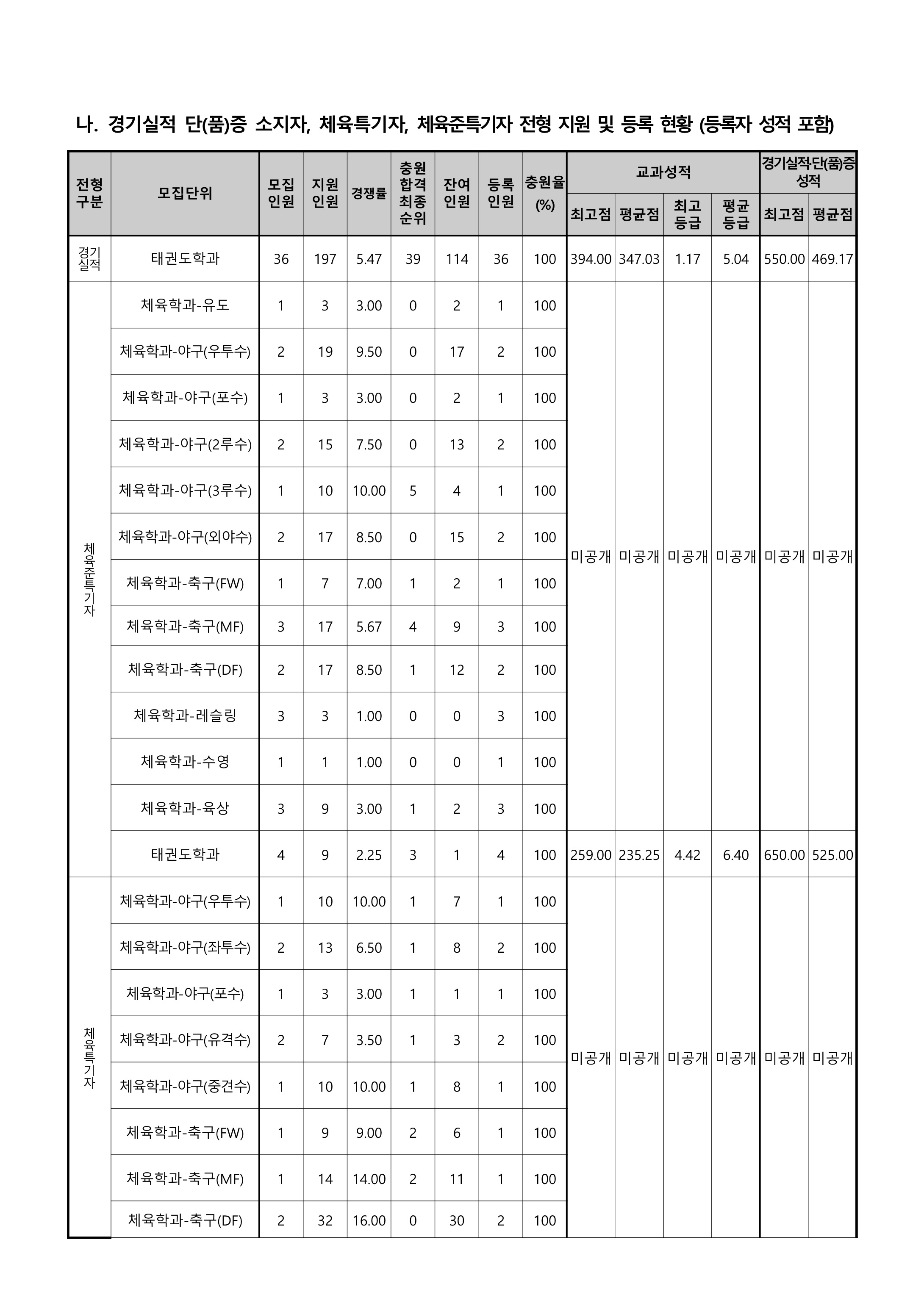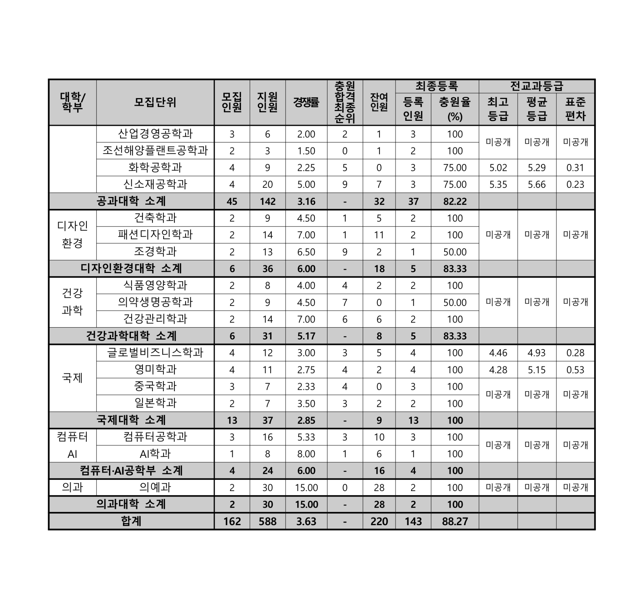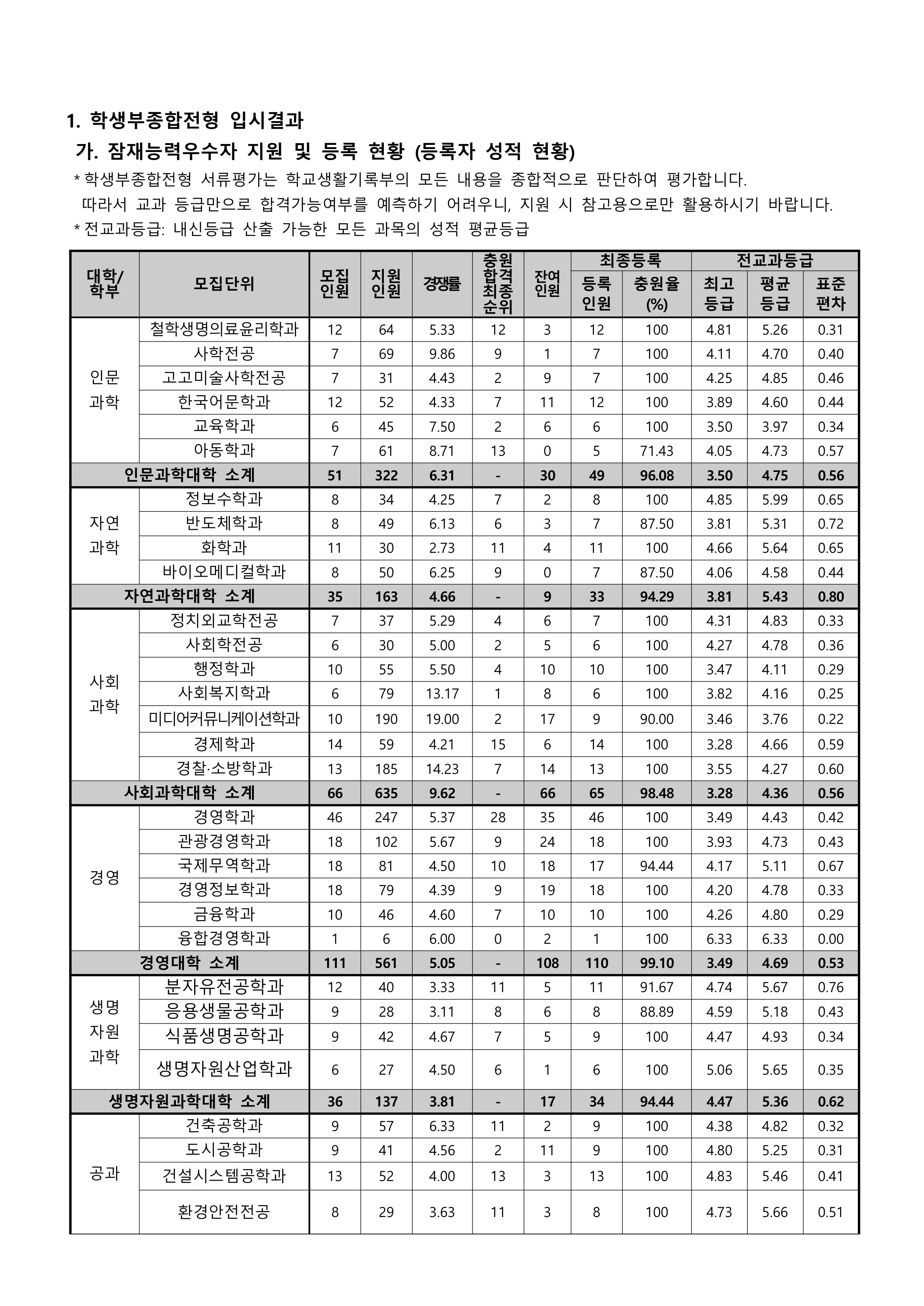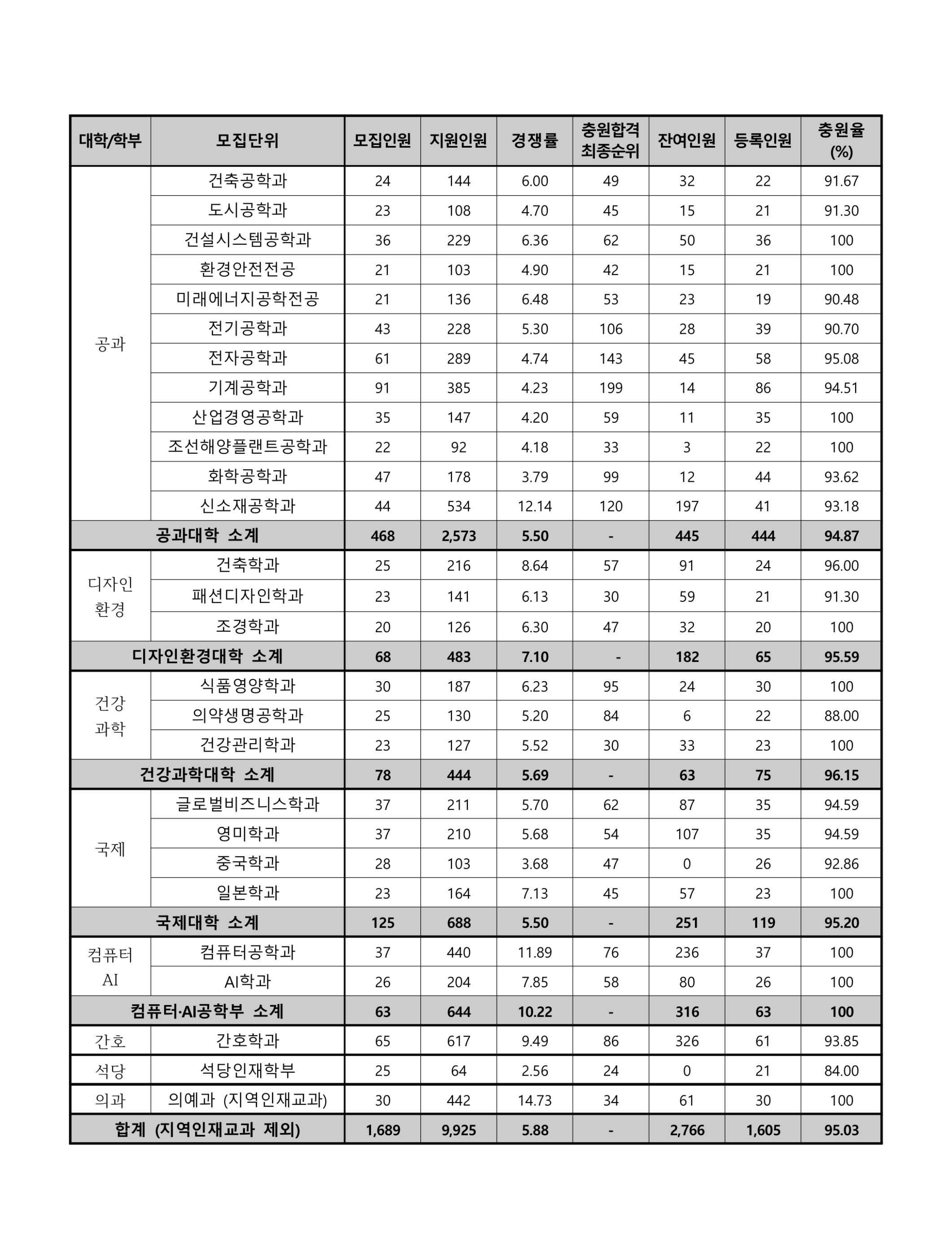 반영 교과목50% cut 70% cut 철학생명의료윤리학과 12 5.33 12 5.38 5.42 전과목 사학전공 7 9.86 9 4.78 4.79 전과목 고고미술사학전공 7 4.43 2 4.97 4.98 전과목 한국어문학과 12 4.33 7 4.64 4.93 전과목 교육학과 6 7.50 2 3.83 4.02 전과목 아동학과 7 8.71 13 4.63 4.77 전과목 정보수학과 8 4.25 7 5.83 6.08 전과목 반도체학과 8 6.13 6 5.14 5.72 전과목 화학과 11 2.73 11 5.66 6.12 전과목 바이오메디컬학과 8 6.25 9 4.36 4.66 전과목 정치외교학전공 7 5.29 4 4.91 4.99 전과목 사회학전공 6 5.00 2 4.62 4.88 전과목 행정학과 10 5.50 4 4.09 4.20 전과목 사회복지학과 6 13.17 1 4.13 4.20 전과목 미디어커뮤니케이션학과 10 19.00 2 3.66 3.94 전과목 경제학과 14 4.21 15 4.46 4.94 전과목 경찰·소방학과 13 14.23 7 4.16 4.23 전과목 경영학과 46 5.37 28 4.43 4.71 전과목 관광경영학과 18 5.67 9 4.76 4.93 전과목 국제무역학과 18 4.50 10 5.02 5.40 전과목 경영정보학과 18 4.39 9 4.70 4.93 전과목 금융학과 10 4.60 7 4.75 4.89 전과목 융합경영학과 1 6.00 0 분자유전공학과 12 3.33 11 5.35 5.80 전과목 응용생물공학과 9 3.11 8 4.99 5.39 전과목 식품생명공학과 9 4.67 7 4.95 5.06 전과목 생명자원산업학과 6 4.50 6 5.49 5.87 전과목 건축공학과 9 6.33 11 4.80 4.88 전과목 도시공학과 9 4.56 2 5.22 5.41 전과목 건설시스템공학과 13 4.00 13 5.34 5.70 전과목 환경안전전공 8 3.63 11 5.61 5.84 전과목 미래에너지공학전공 8 4.13 11 5.59 5.75 전과목 전기공학과 15 4.87 11 4.98 5.31 전과목 전자공학과 21 5.05 21 5.05 5.29 전과목 기계공학과 33 4.61 32 4.90 5.05 전과목 산업경영공학과 13 3.62 17 5.21 5.77 전과목 조선해양플랜트공학과 9 3.89 11 5.64 5.75 전과목 화학공학과 16 3.88 12 4.80 5.08 전과목 신소재공학과 18 5.22 11 5.22 5.50 전과목 건축학과 10 8.90 8 4.62 4.68 전과목 산업디자인학과 12 6.42 10 3.89 4.30 전과목 패션디자인학과 9 10.00 4 4.62 4.72 전과목 조경학과 10 6.30 13 5.21 5.47 전과목 현대미술학과 10 3.50 4 5.12 6.00 전과목 공예학과 5 8.20 1 5.21 5.53 전과목 체육학과 19 5.63 10 4.45 4.50 전과목 태권도학과 7 6.86 1 5.25 5.39 전과목 식품영양학과 11 5.64 6 4.53 4.79 전과목 의약생명공학과 10 4.70 8 4.40 4.61 전과목 건강관리학과 9 5.89 10 5.17 5.28 전과목 글로벌비즈니스학과 15 5.13 20 4.93 5.62 전과목 영미학과 14 4.86 11 4.68 5.07 전과목 중국학과 10 6.90 13 5.20 5.20 전과목 일본학과 9 9.89 8 5.00 5.01 전과목 컴퓨터공학과 14 8.71 11 4.25 4.34 전과목 AI학과 12 5.42 6 4.60 4.73 전과목 간호학과 5 26.60 2 3.23 3.24 전과목 모집단위 지역인재종합전형 모집인원 경쟁률 충원인원 최종등록자 학생부 교과성적 환산등급 산출