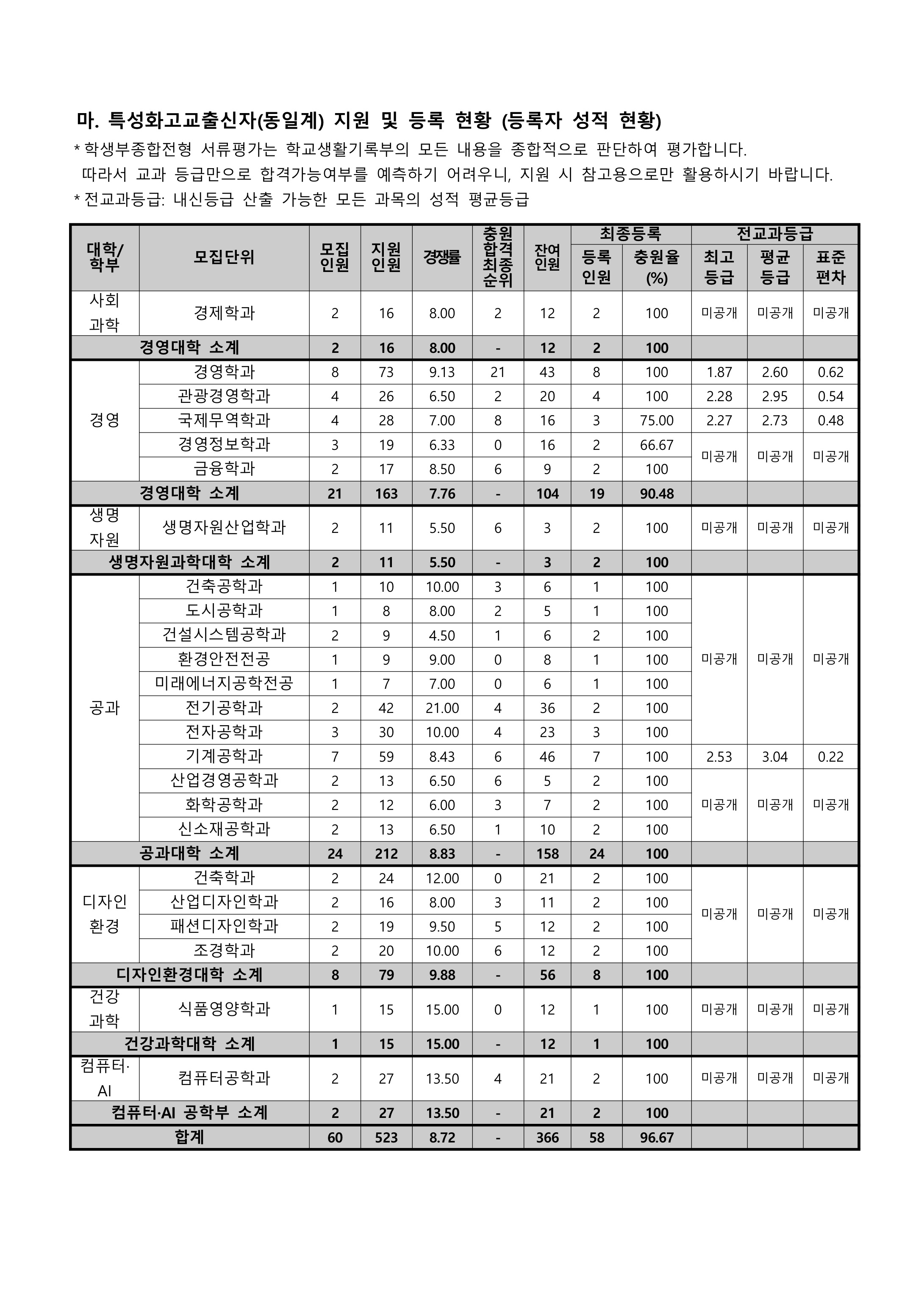 반영 교과목50% cut 70% cut 철학생명의료윤리학과 2 5.00 8 사학전공 2 4.50 6 고고미술사학전공 2 4.50 1 한국어문학과 3 3.33 0 교육학과 2 4.50 3 아동학과 2 6.50 1 정보수학과 2 2.00 1 반도체학과 2 2.50 2 화학과 2 2.50 3 바이오메디컬학과 2 4.00 6 정치외교학전공 2 4.00 4 사회학전공 2 5.00 2 행정학과 2 5.00 3 사회복지학과 2 13.00 0 미디어커뮤니케이션학과 3 8.33 0 경제학과 3 4.33 2 경찰·소방학과 3 7.67 3 경영학과 10 5.10 20 3.81 4.94 전과목 관광경영학과 4 4.50 0 국제무역학과 4 3.50 1 4.73 5.72 전과목 경영정보학과 4 4.00 1 4.67 5.32 전과목 금융학과 2 4.00 0 분자유전공학과 2 2.50 0 응용생물공학과 2 3.00 3 식품생명공학과 2 3.50 3 생명자원산업학과 2 3.50 2 건축공학과 2 4.50 1 도시공학과 2 2.50 1 건설시스템공학과 3 2.67 3 환경안전전공 2 3.50 4 미래에너지공학전공 2 3.00 3 전기공학과 3 3.67 3 전자공학과 5 3.00 3 5.66 5.69 전과목 기계공학과 6 4.00 5 5.03 5.08 전과목 산업경영공학과 3 2.67 1 조선해양플랜트공학과 2 2.50 1 화학공학과 4 2.50 5 4.78 5.06 전과목 신소재공학과 3 2.33 2 건축학과 2 7.00 5 패션디자인학과 2 6.50 3 조경학과 2 5.00 4 체육학과 2 11.50 1 식품영양학과 3 4.33 2 의약생명공학과 2 3.50 0 건강관리학과 2 5.00 1 글로벌비즈니스학과 2 4.00 1 영미학과 3 4.33 4 중국학과 2 4.00 0 일본학과 2 5.50 0 컴퓨터공학과 3 7.33 2 AI학과 2 6.50 6 모집단위 특성화고교출신자(동일계)전형 모집인원 경쟁률 충원인원 최종등록자 학생부 교과성적 환산등급 산출