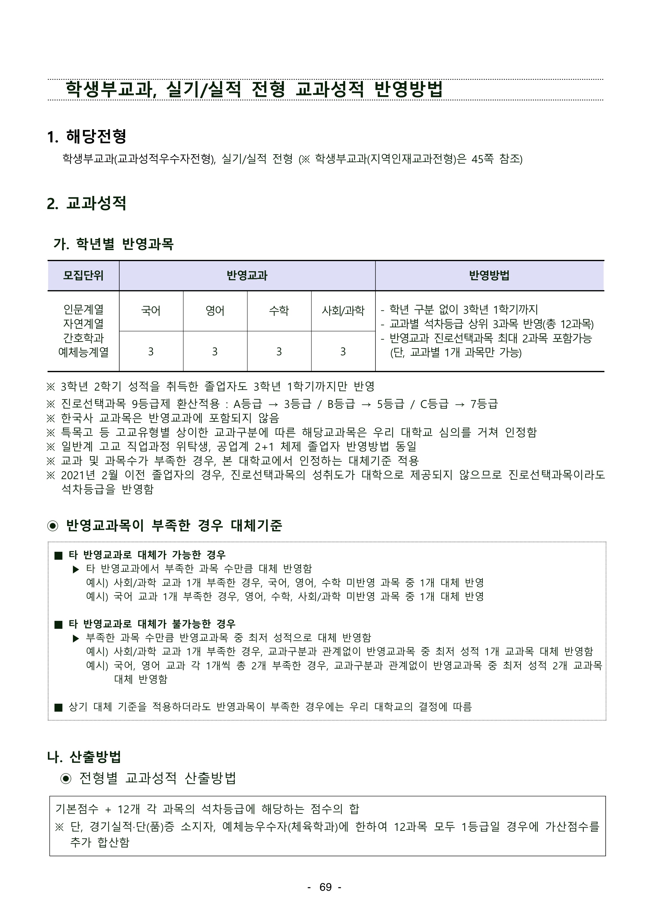 3) 환산점수 70%cut: 각 모집단위별 학생선발에 활용된 학생부 교과성적 환산점수(100명중 70등의 점수)