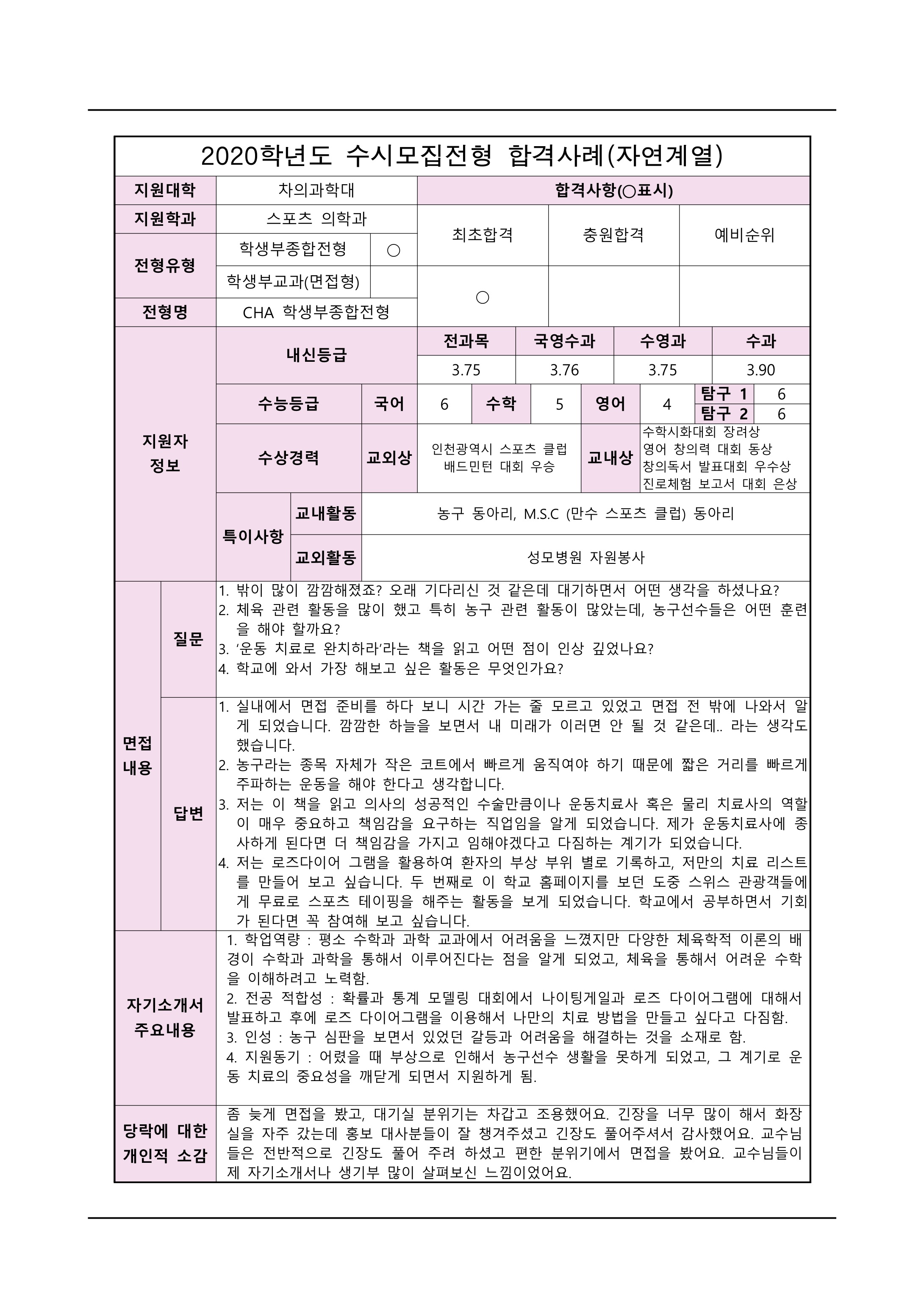 차의과학대학교 의생명과학과2021학년도 차의과학대학교 면접 후기1 - 스포츠의학과