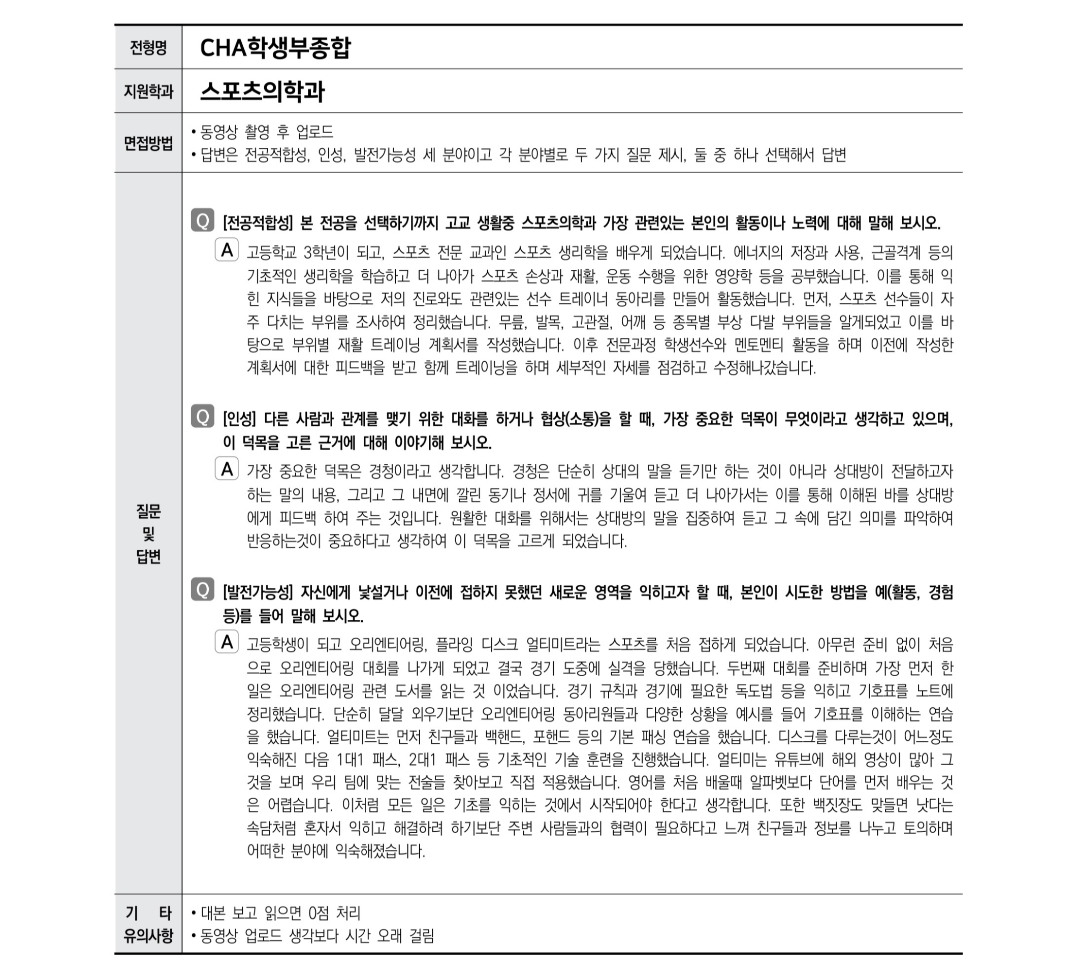 2022학년도 차의과학대학교 학생부교과 면접고사 가이드 문항 차의과학대학교 스포츠의학과
