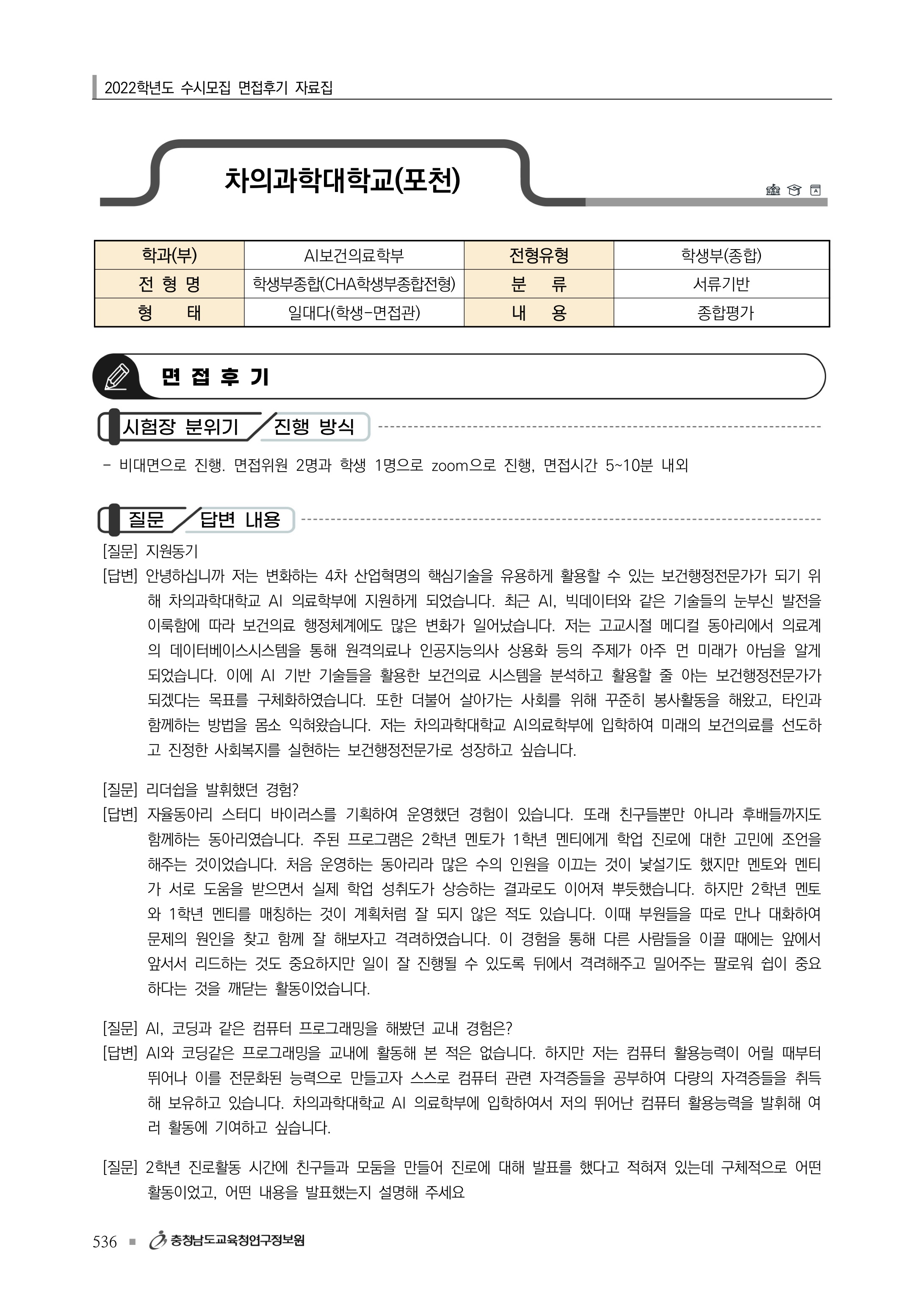 2022학년도 차의과학대학교 면접 후기2 - AI보건의료학부