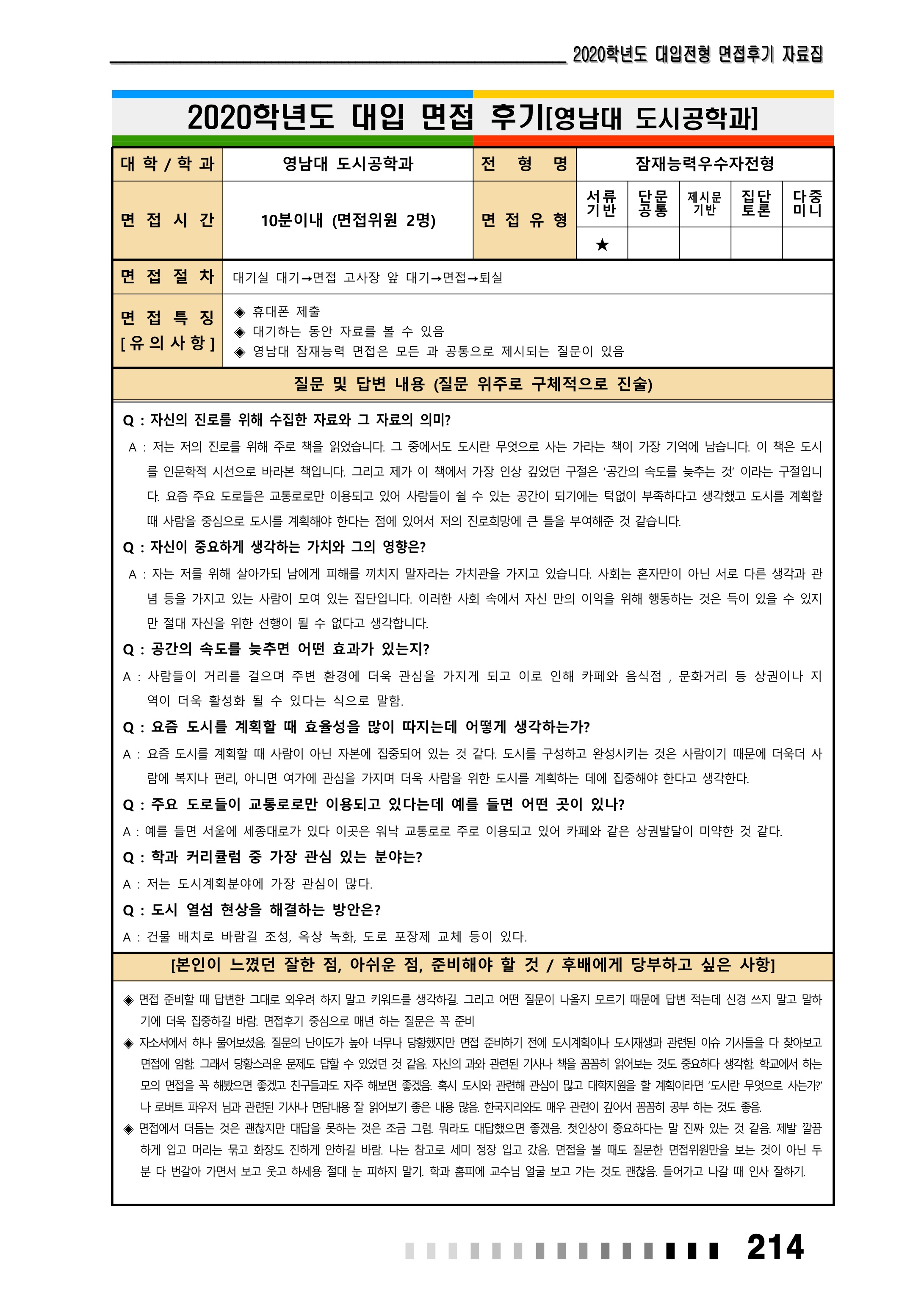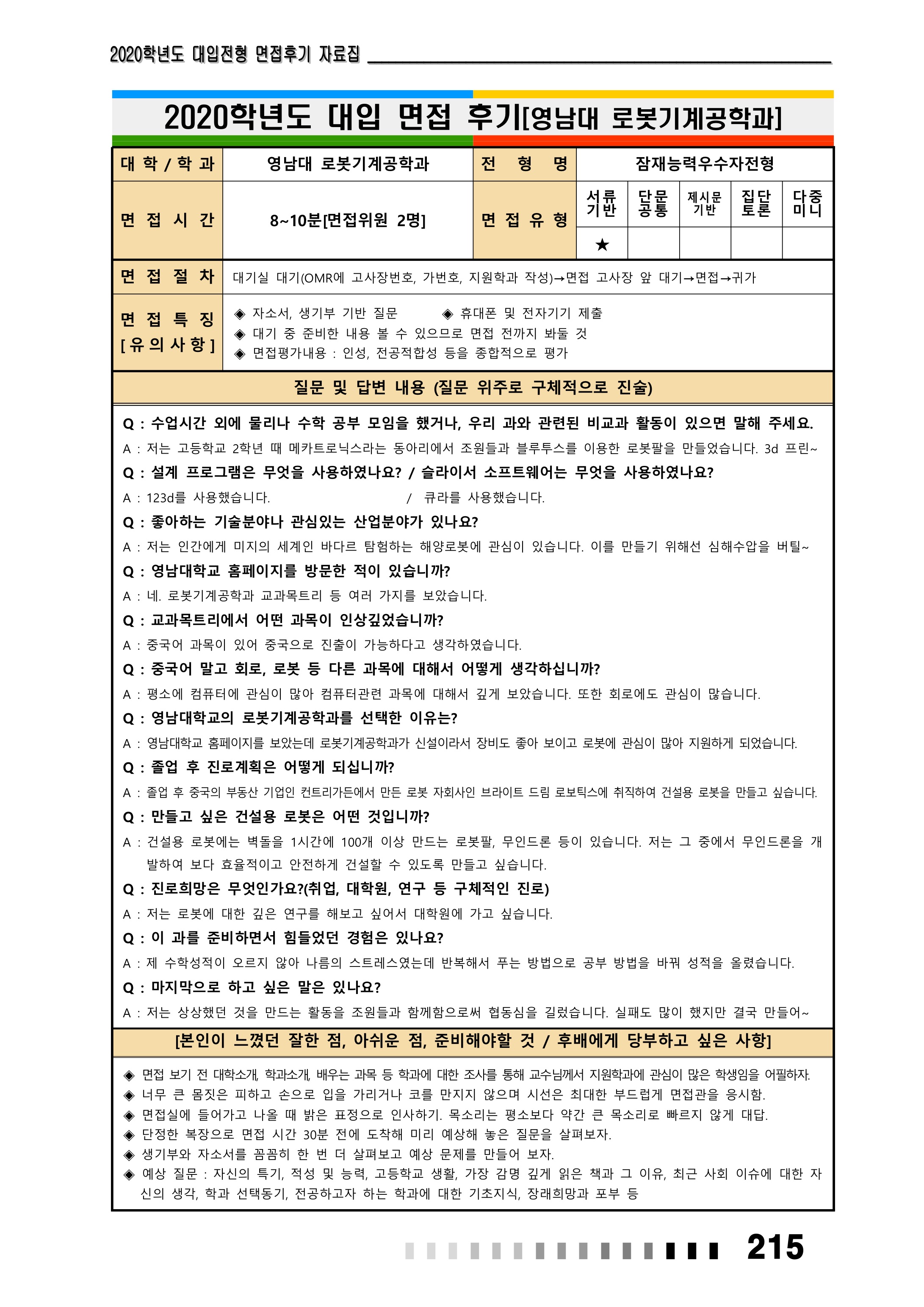 2021학년도 영남대학교 면접 후기9 - 도시공학과 2021학년도 영남대학교 면접 후기10 - 로봇기계공학과