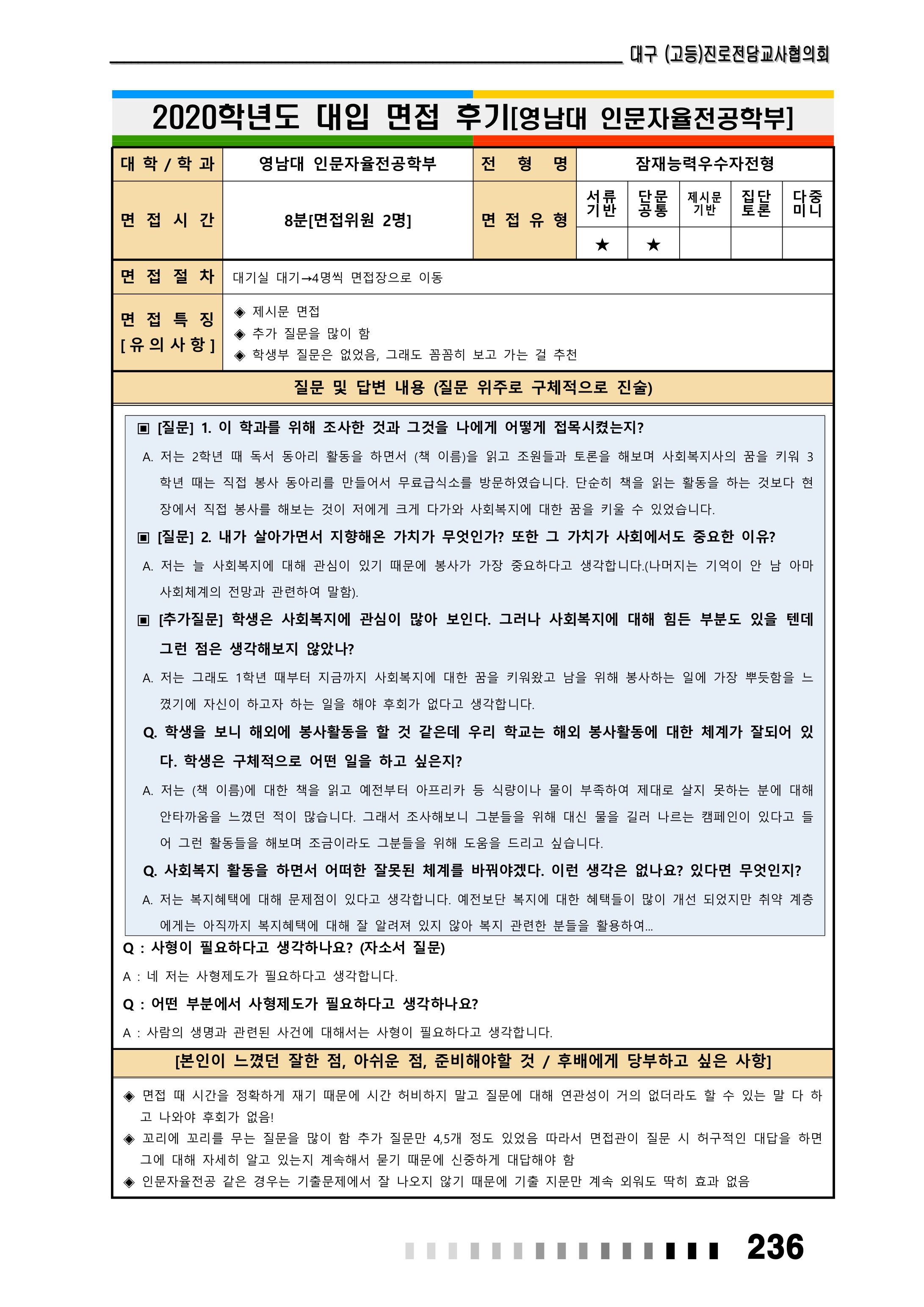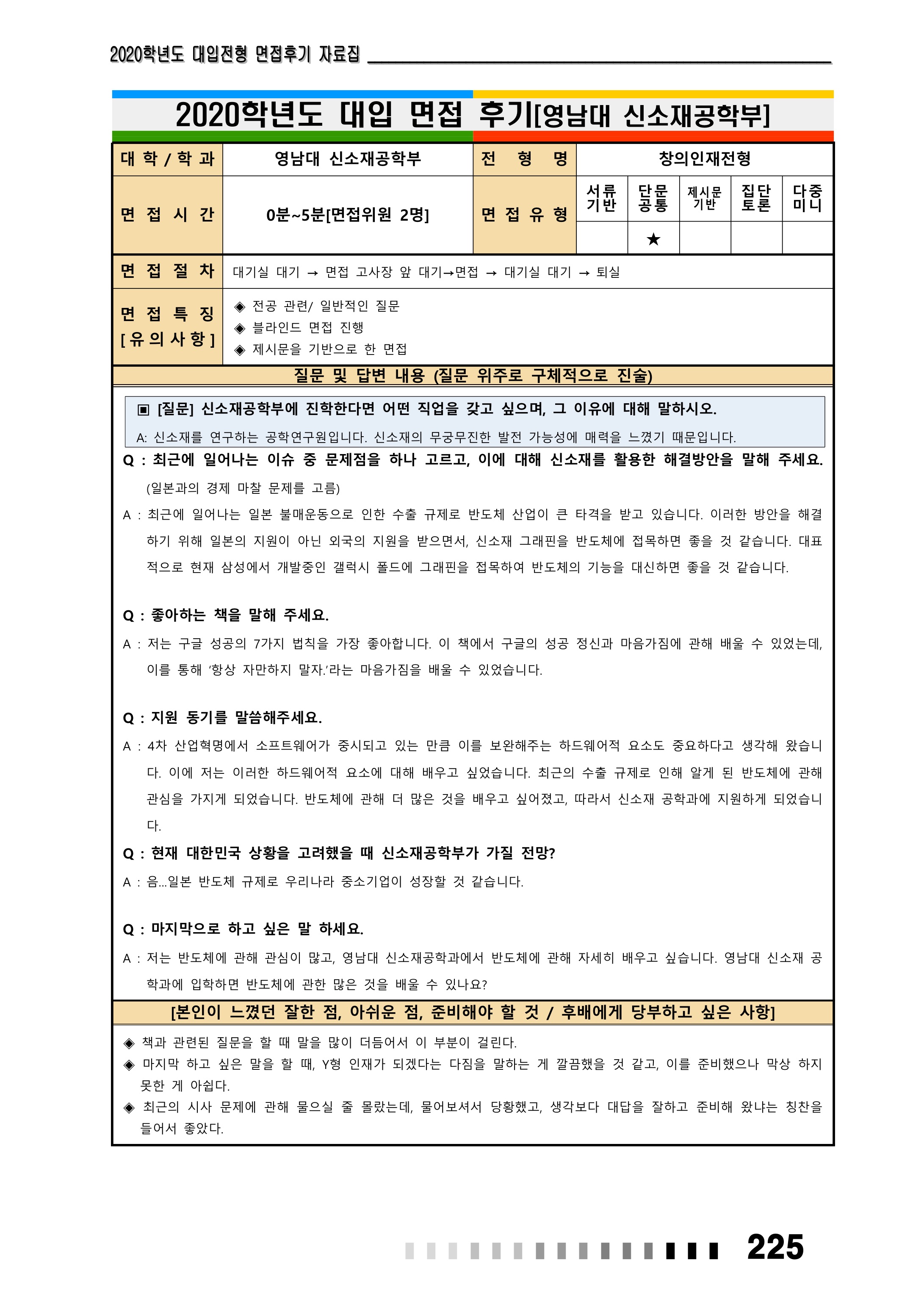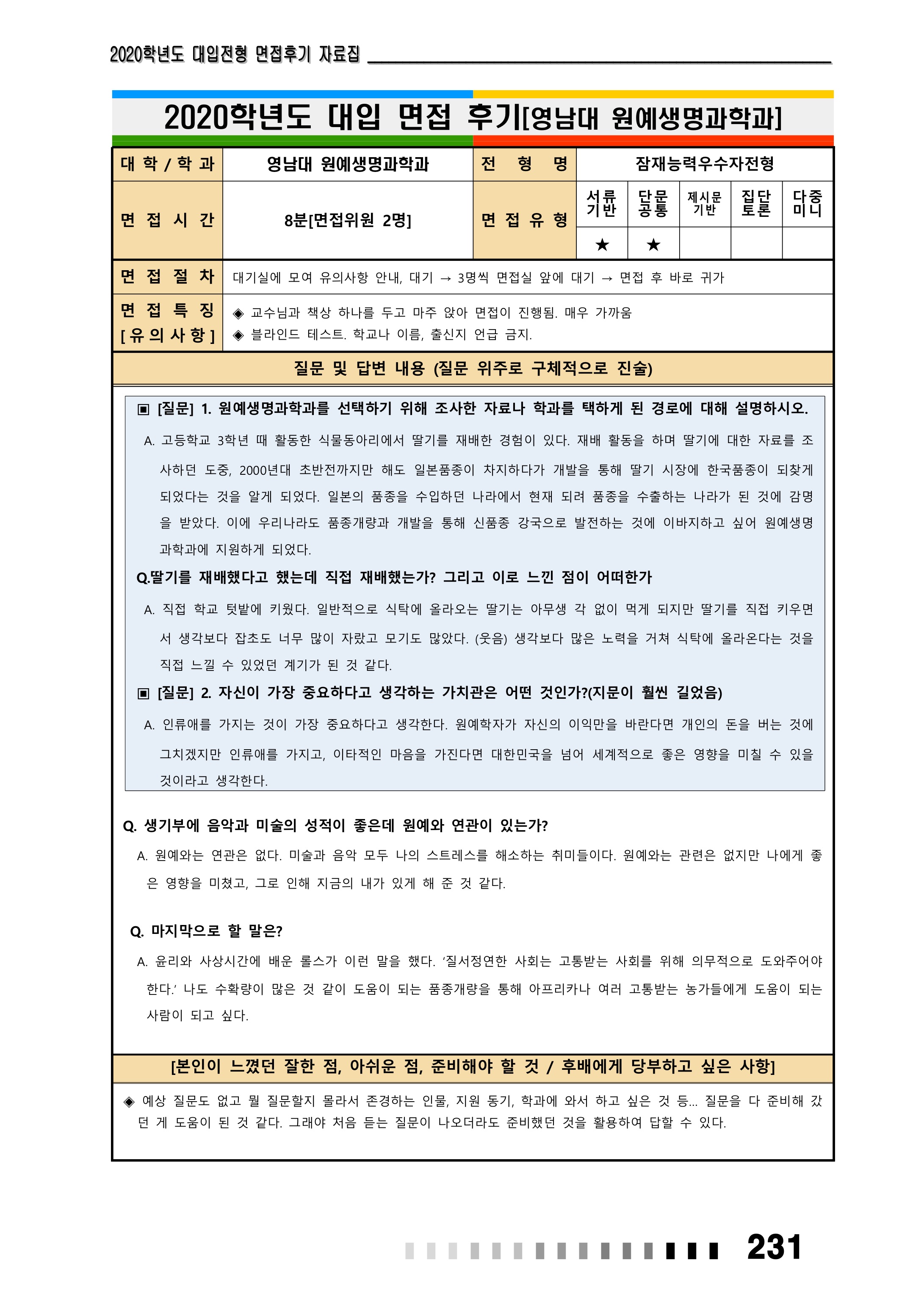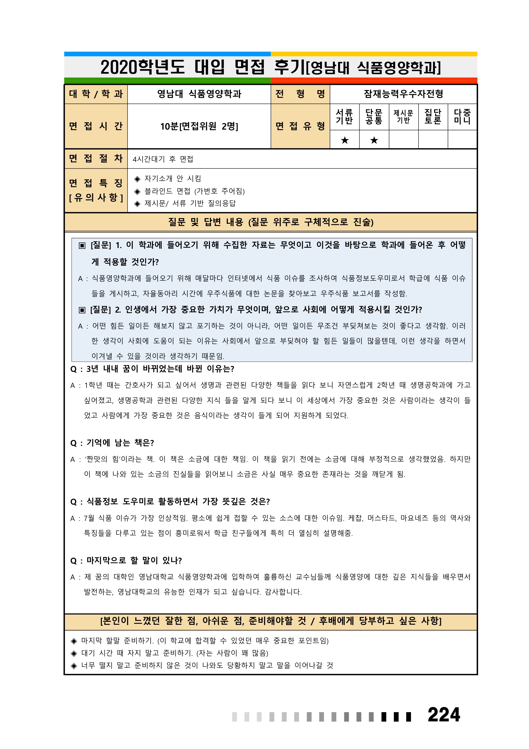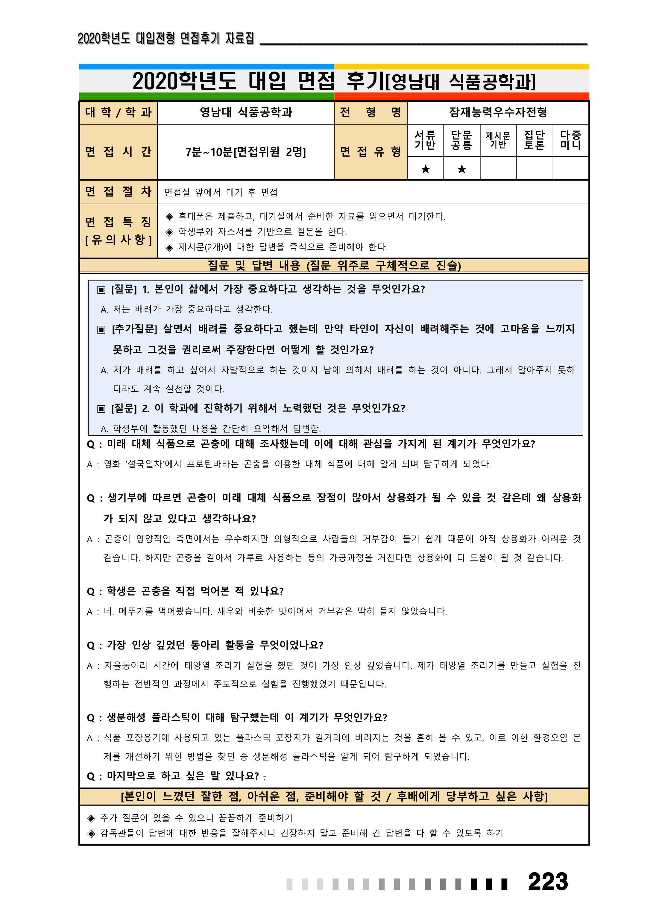 2021학년도 영남대학교 면접 후기20 - 식품영양학과 2021학년도 영남대학교 면접 후기21 - 신소재공학부