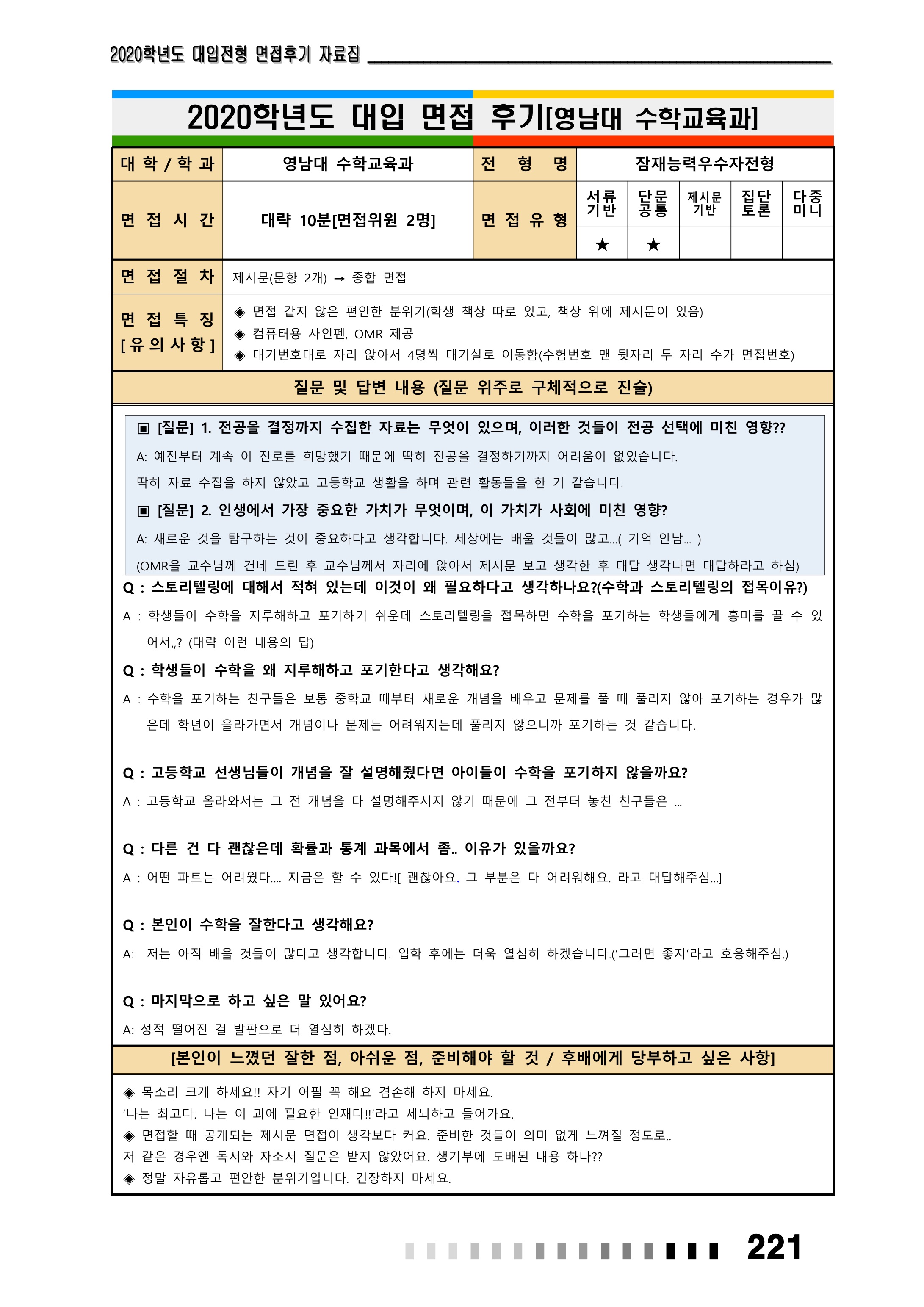 2021학년도 영남대학교 면접 후기17 - 수학교육과 2021학년도 영남대학교 면접 후기18 - 식품경제외식학과