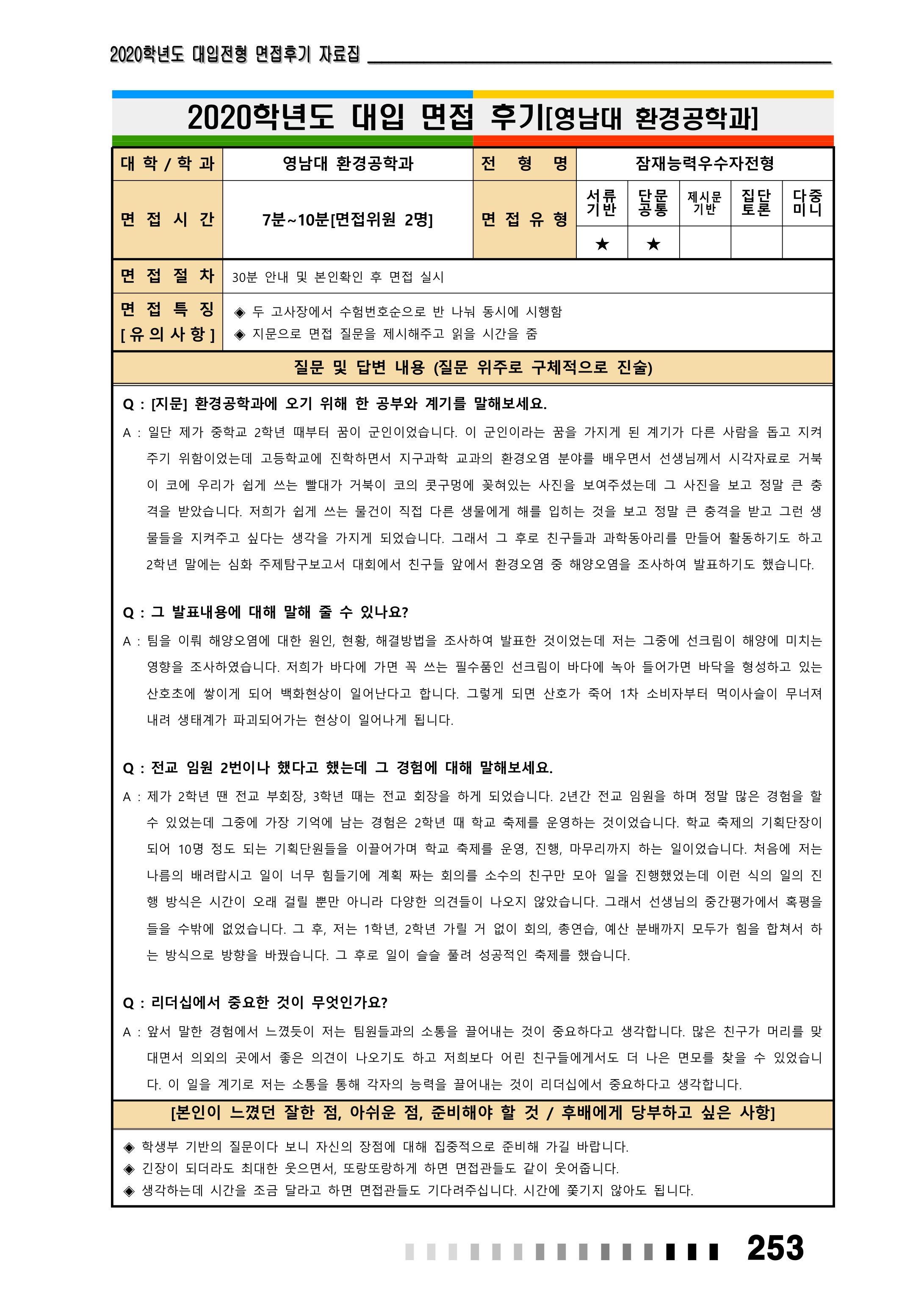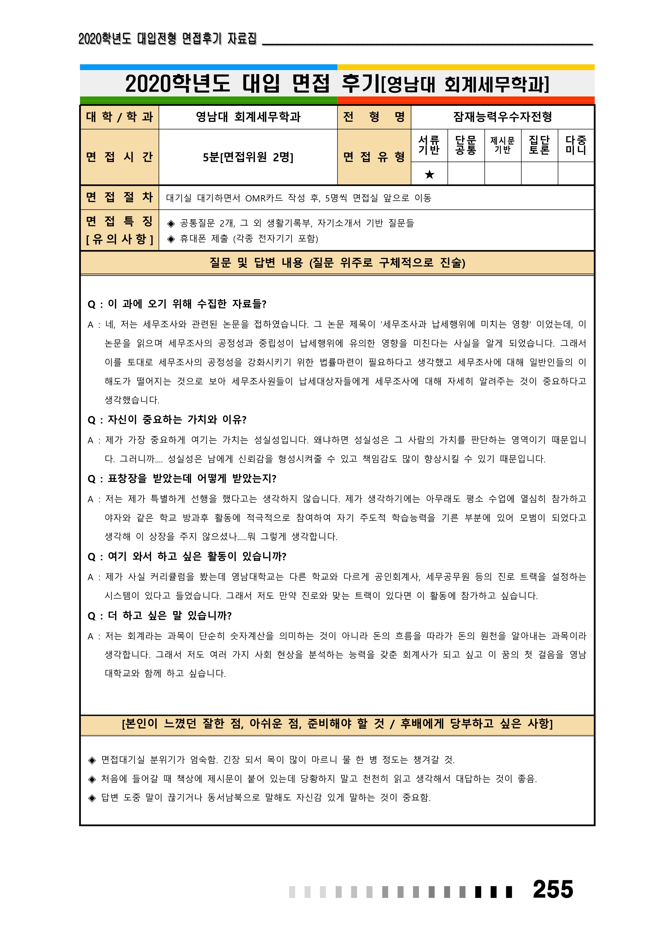 2021학년도 영남대학교 면접 후기52 - 환경공학과 2021학년도 영남대학교 면접 후기53 - 회계세무학과