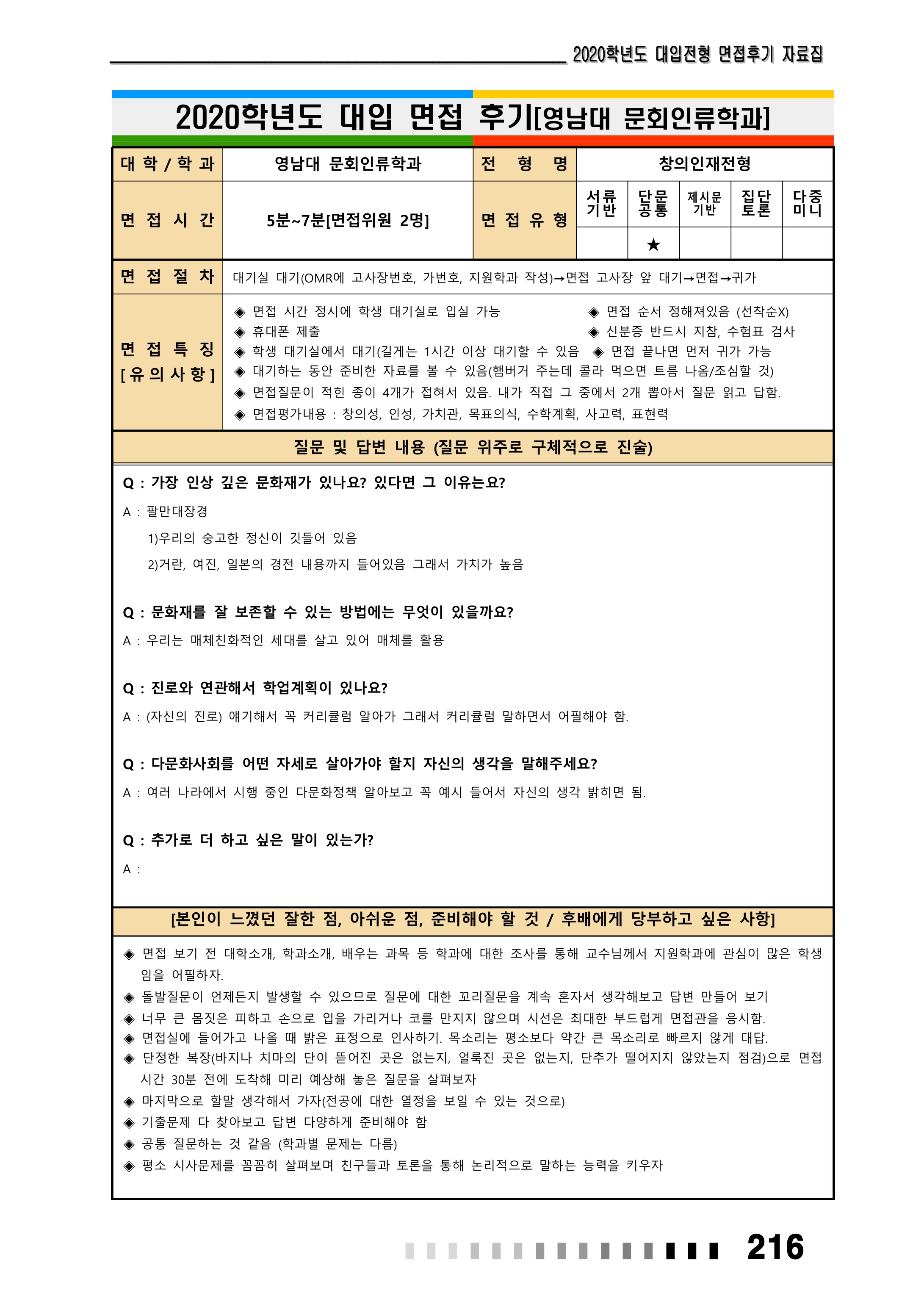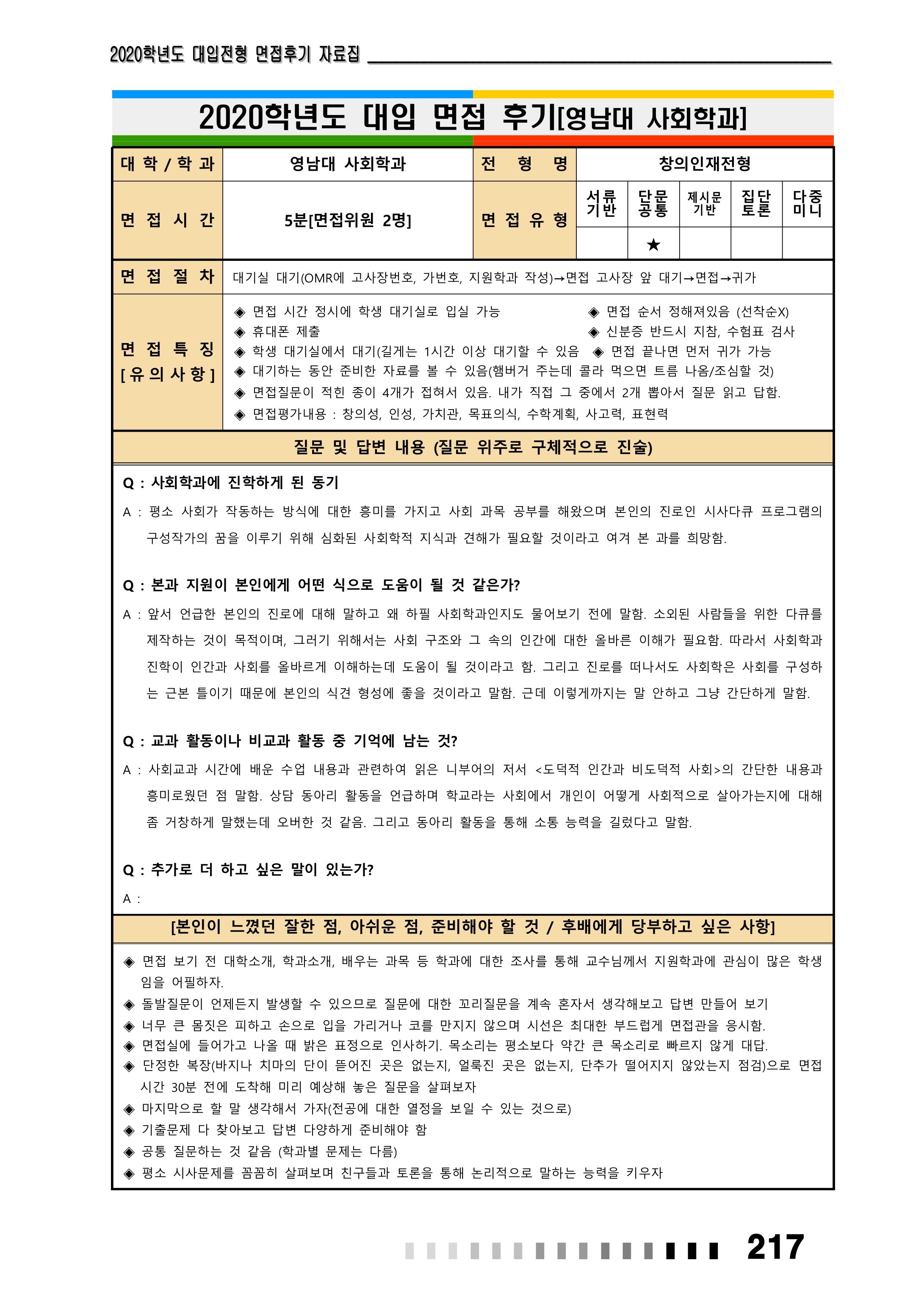 2021학년도 영남대학교 면접 후기11 - 문화인류학과 2021학년도 영남대학교 면접 후기12 - 사회학과