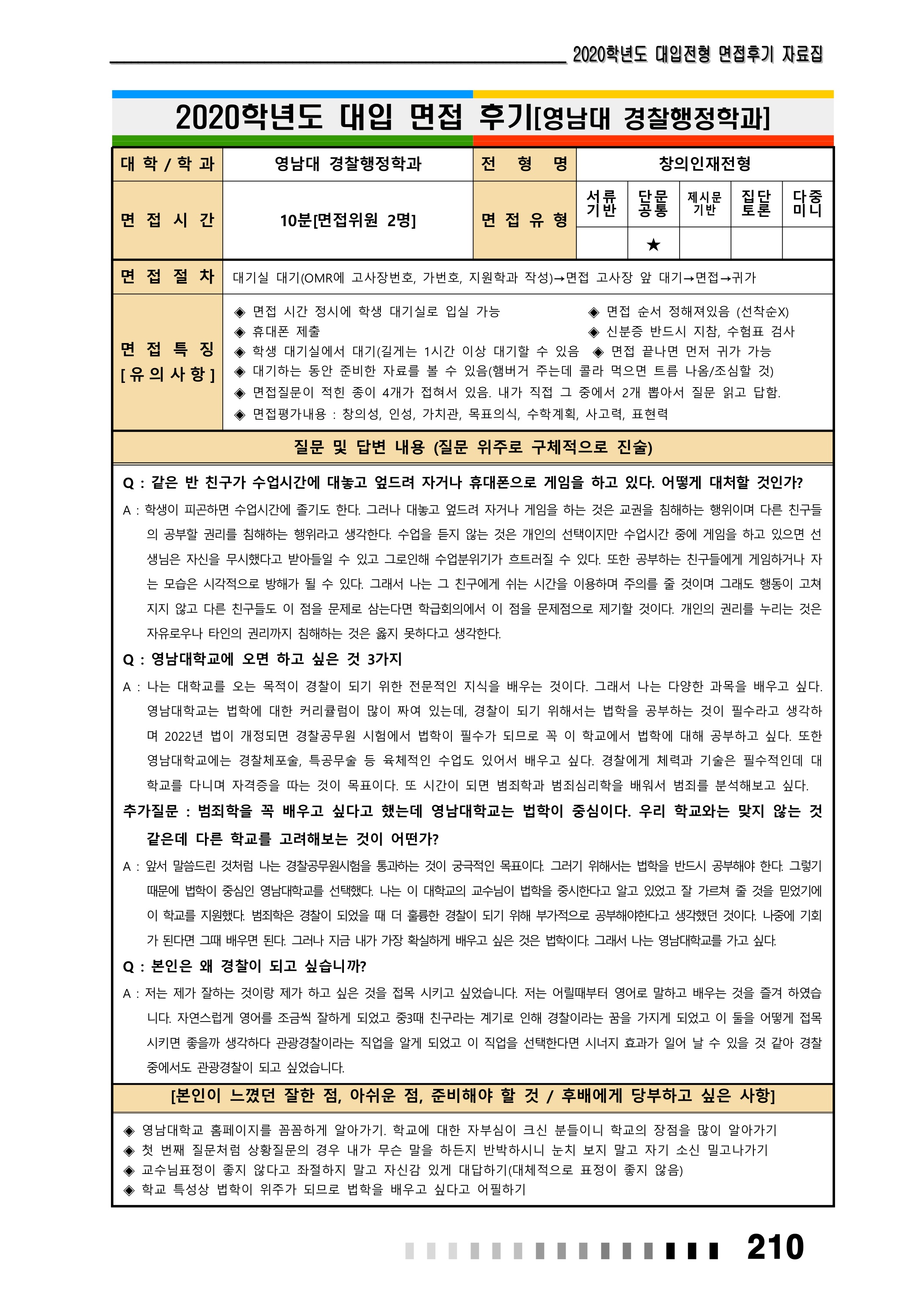 2021학년도 영남대학교 면접 후기5 - 경찰행정학과 2021학년도 영남대학교 면접 후기6 - 국어국문학과