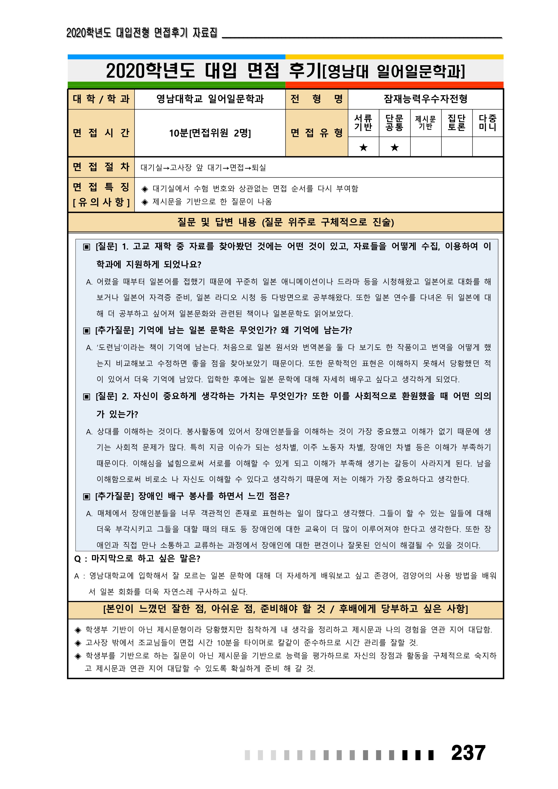 2021학년도 영남대학교 면접 후기34 - 인문자율전공학부 2021학년도 영남대학교 면접 후기35 - 일어일문학과