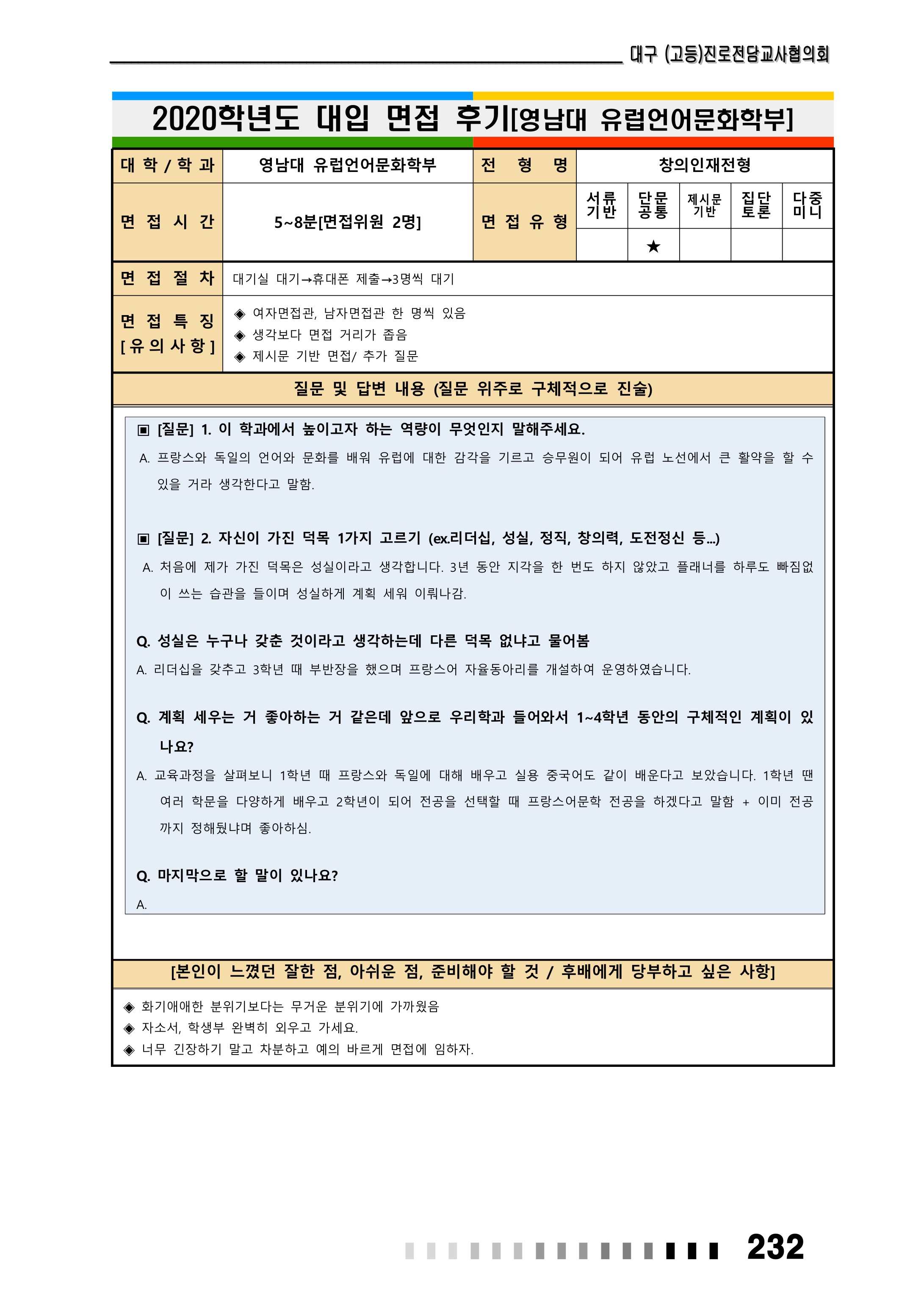 2021학년도 영남대학교 면접 후기29 - 유럽언어문화학부 2021학년도 영남대학교 면접 후기30 - 유아교육과