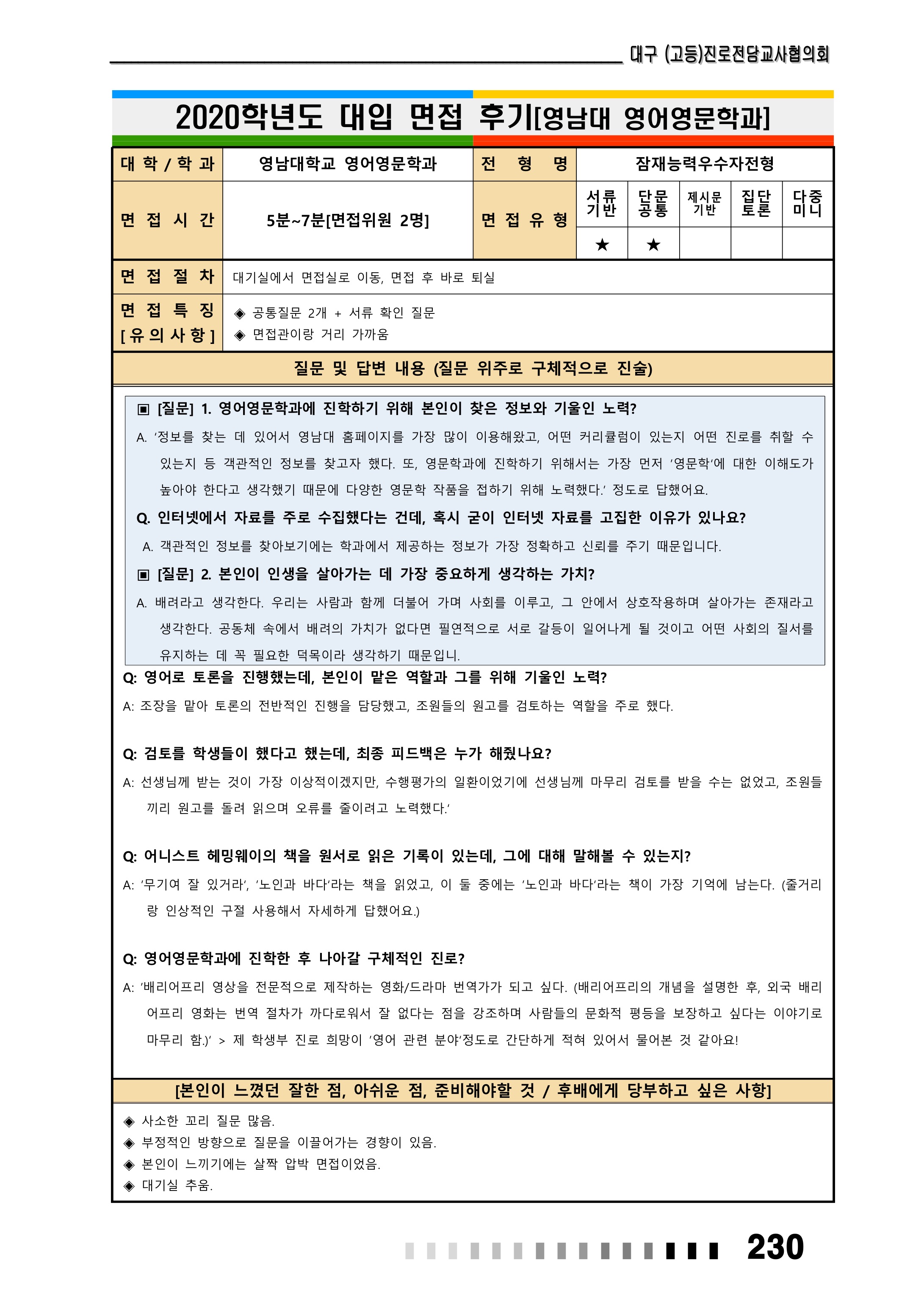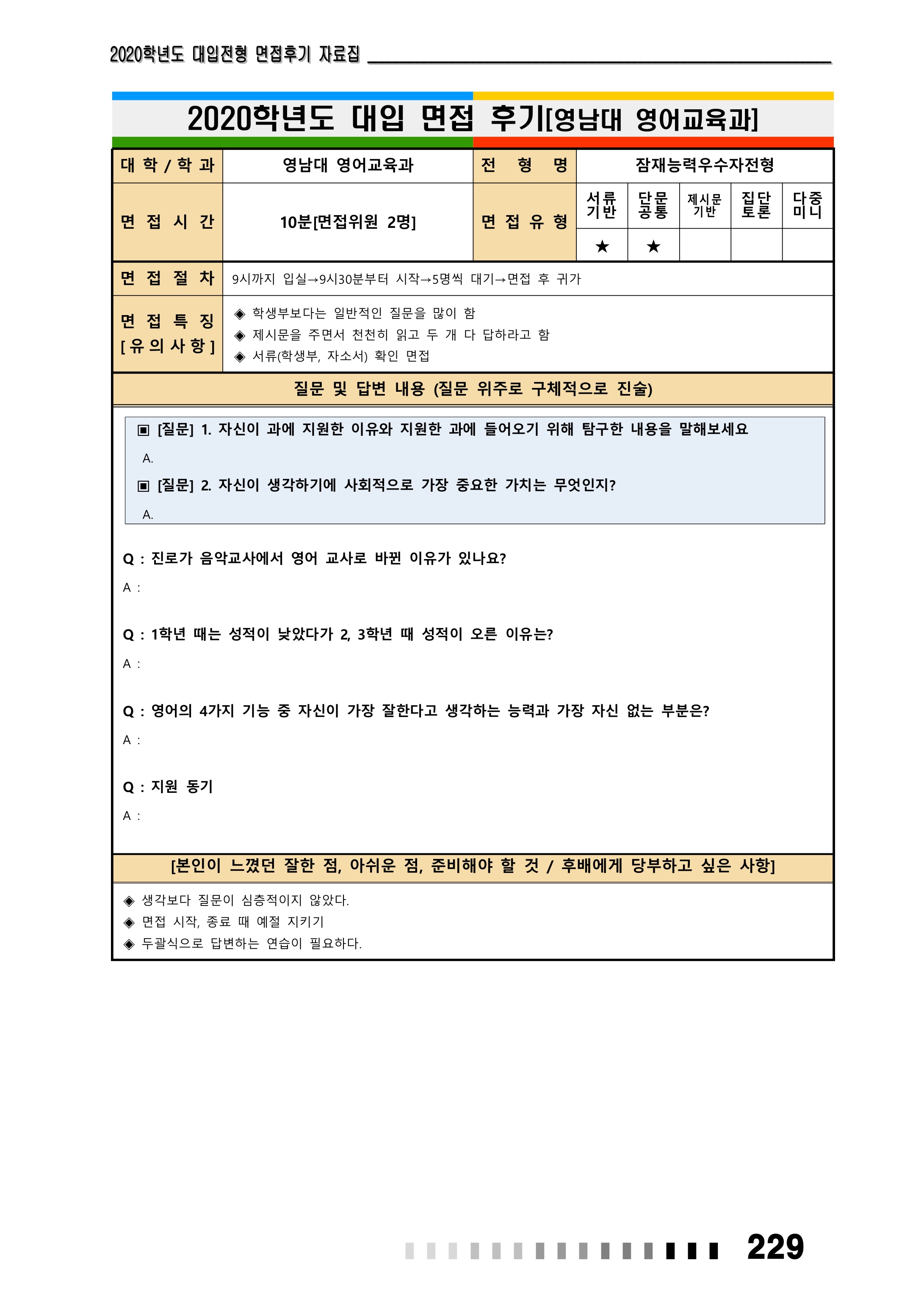 2021학년도 영남대학교 면접 후기26 - 영어교육과 2021학년도 영남대학교 면접 후기27 - 영어영문학과