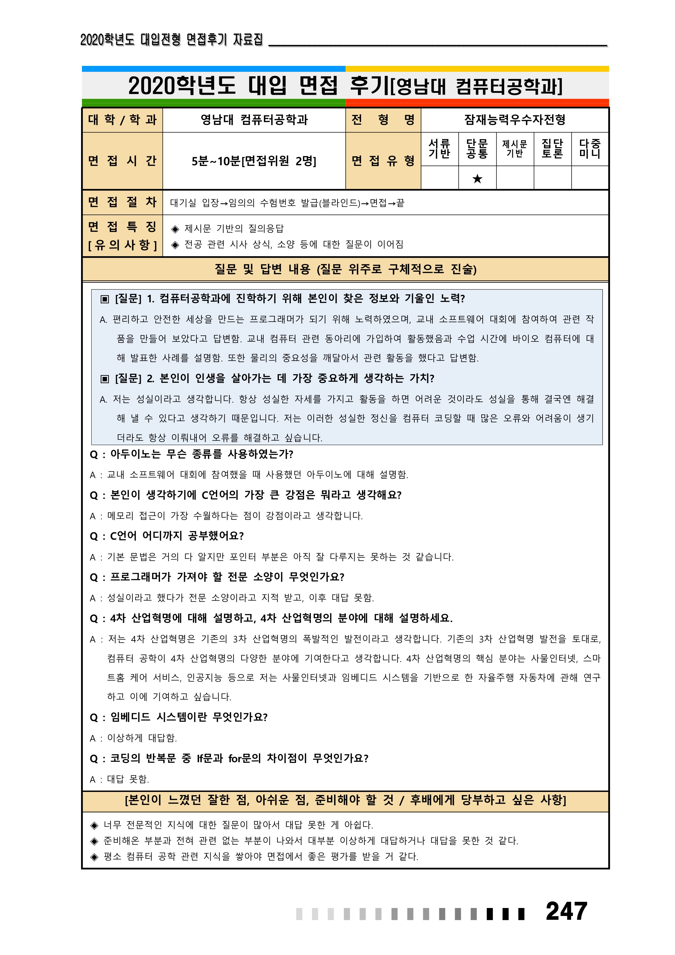 2021학년도 영남대학교 면접 후기45 - 컴퓨터공학과 2021학년도 영남대학교 면접 후기46 - 통계학과