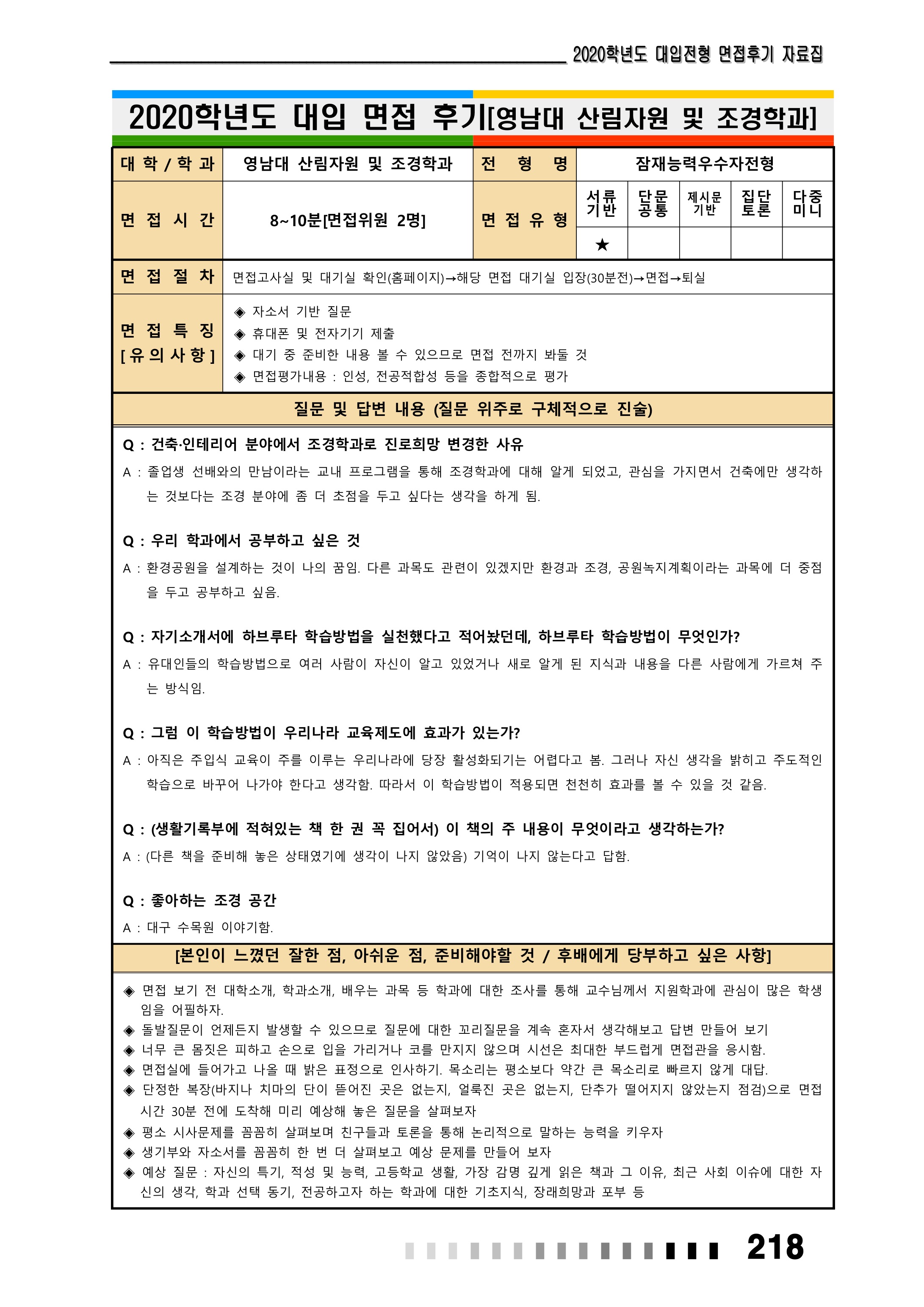 2021학년도 영남대학교 면접 후기12 - 사회학과 2021학년도 영남대학교 면접 후기13 - 산림자원및조경학과