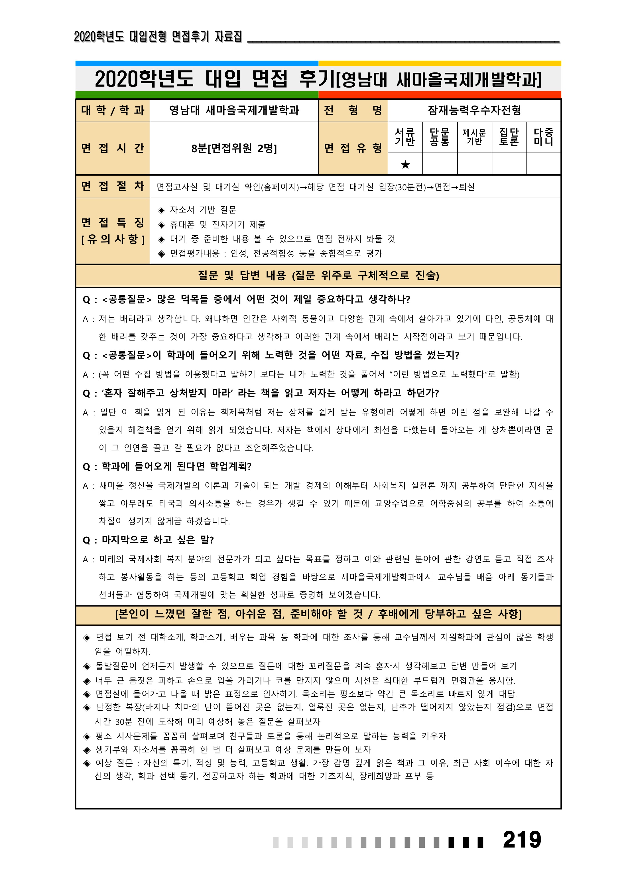 2021학년도 영남대학교 면접 후기13 - 산림자원및조경학과 2021학년도 영남대학교 면접 후기14 - 새마을국제개발학과