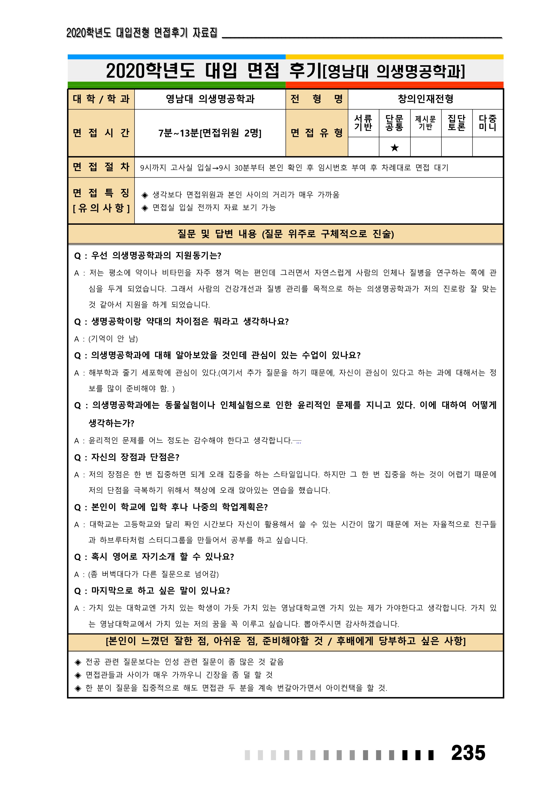 2021학년도 영남대학교 면접 후기32 - 의생명공학과 2021학년도 영남대학교 면접 후기33 - 의예과