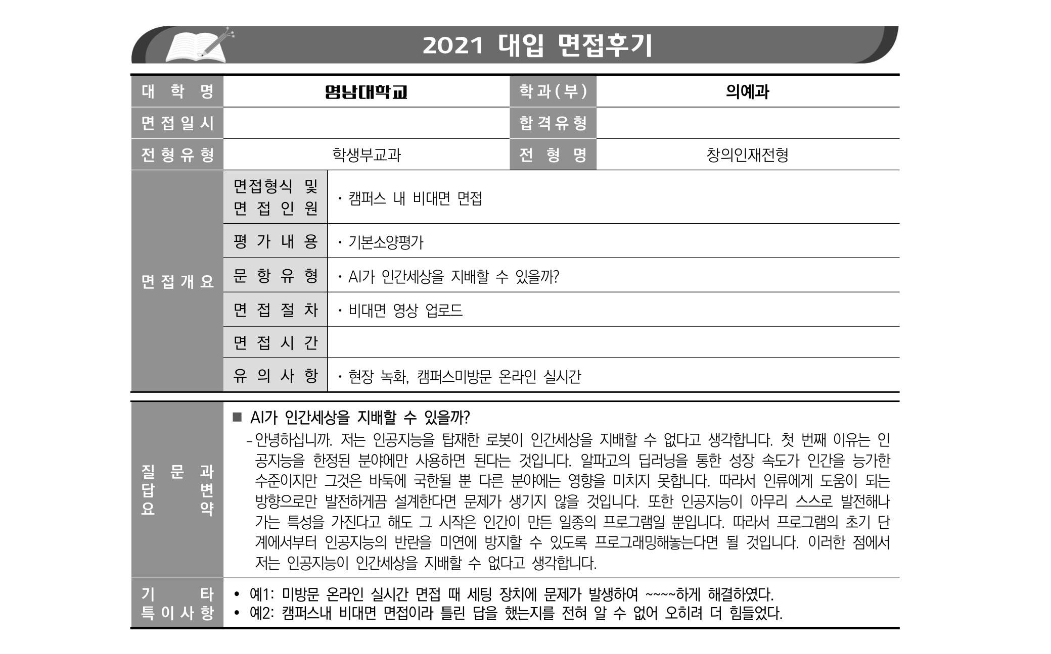 2021학년도 영남대학교 면접 후기33 - 의예과 2021학년도 영남대학교 면접 후기34 - 인문자율전공학부