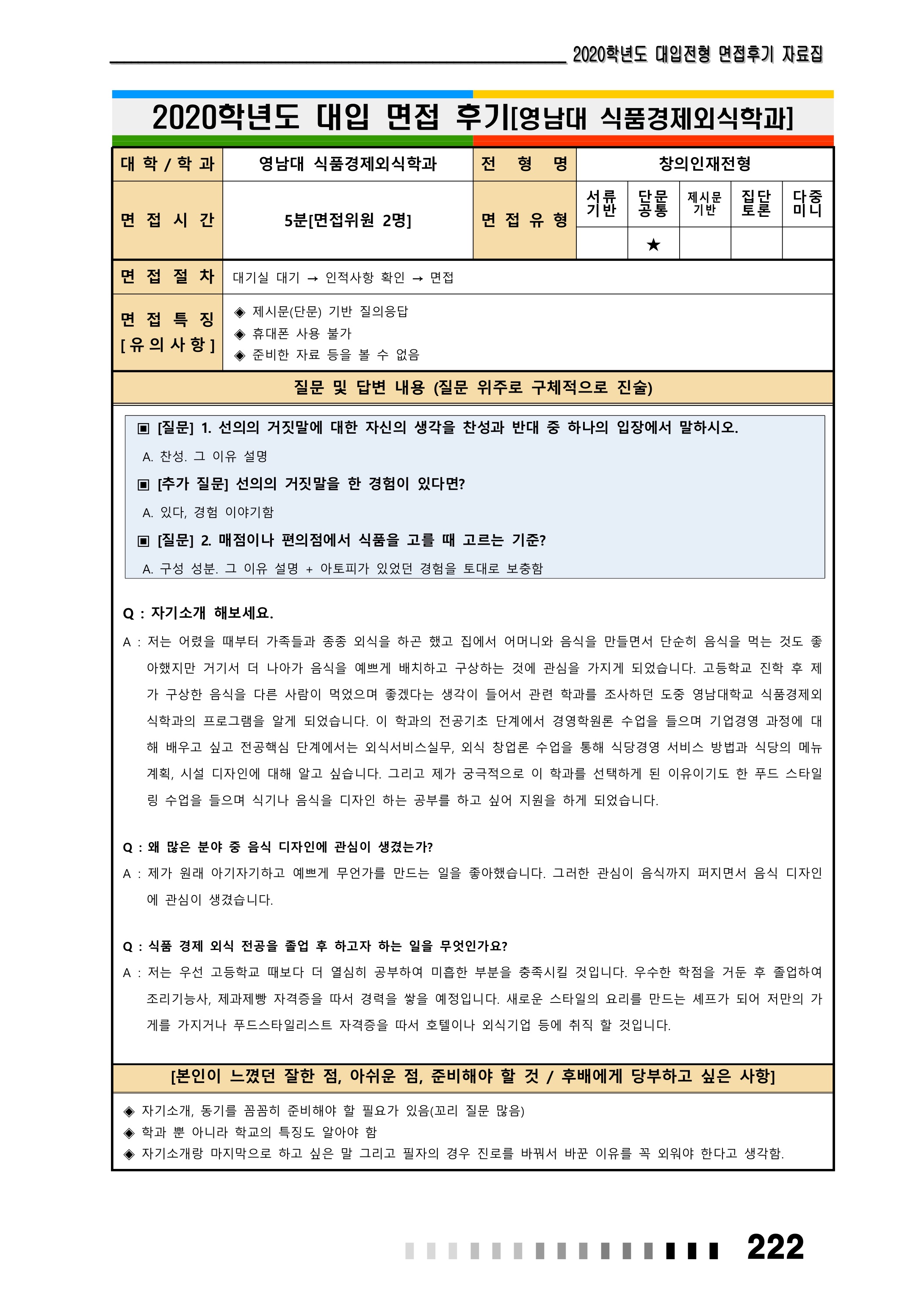 2021학년도 영남대학교 면접 후기18 - 식품경제외식학과 2021학년도 영남대학교 면접 후기19 - 식품공학과