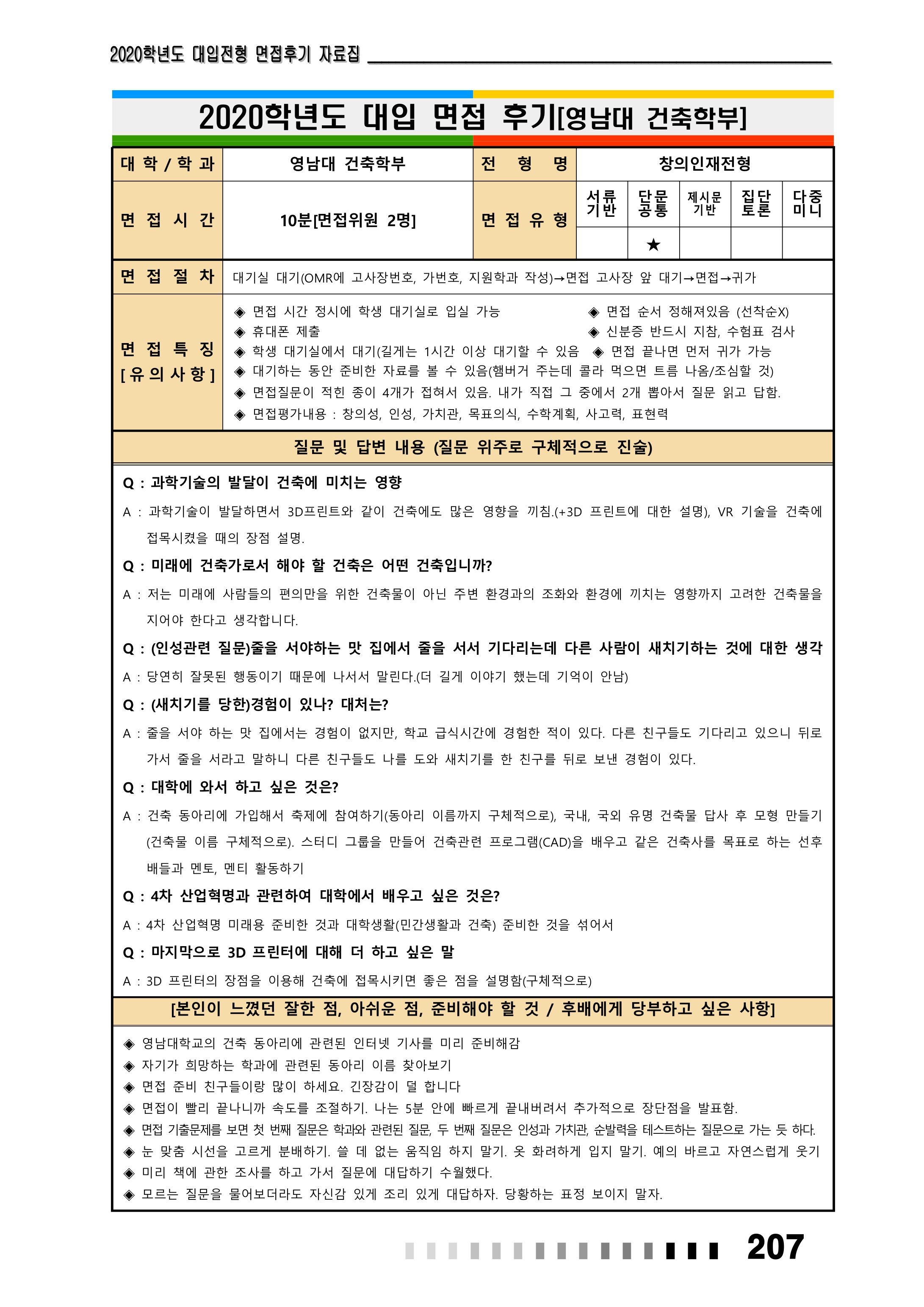 2021학년도 영남대학교 면접 후기1 - 건설시스템공학과 2021학년도 영남대학교 면접 후기2 - 건축학부