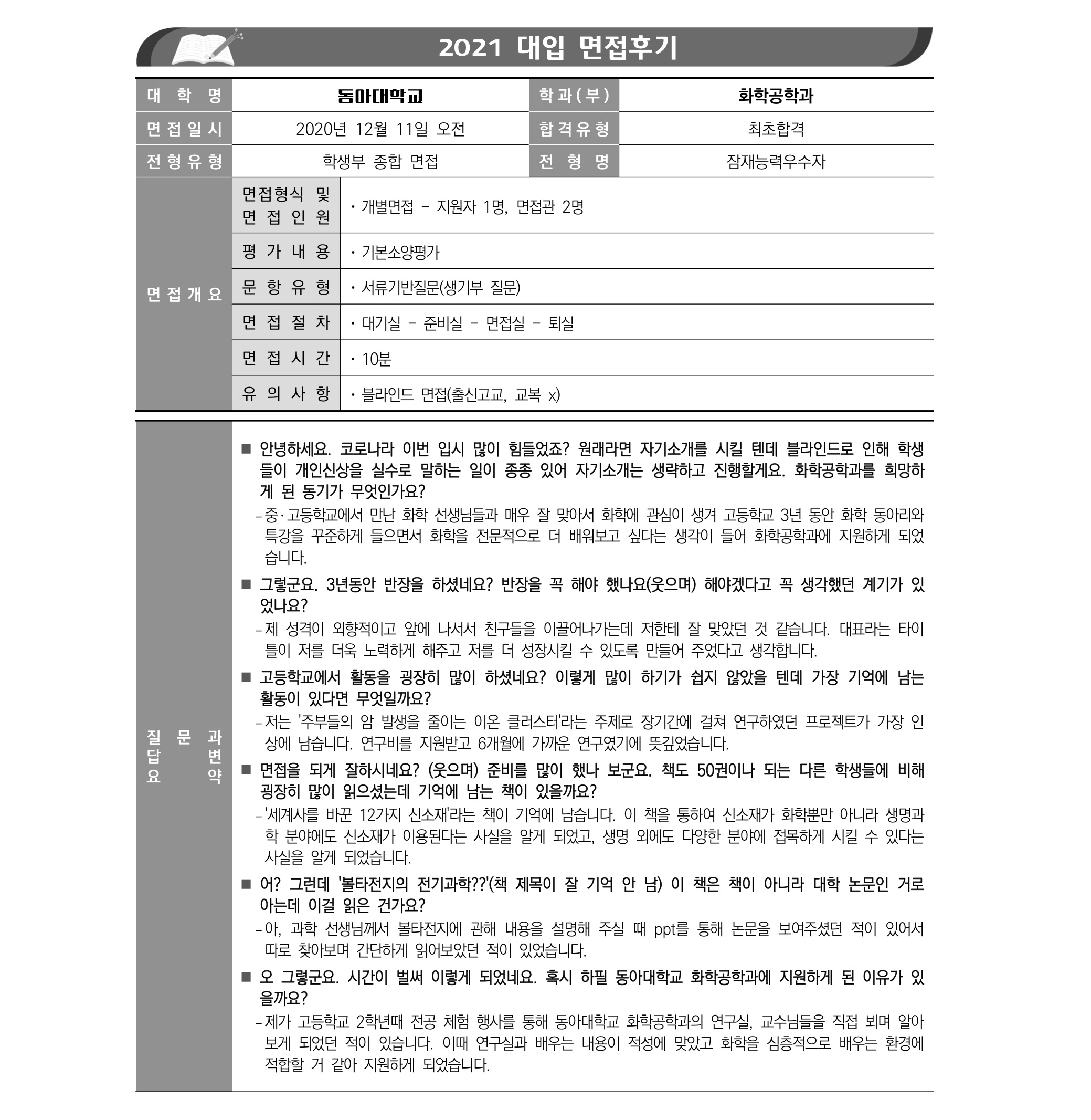 2021학년도 동아대학교 면접 후기59 - 화학공학과