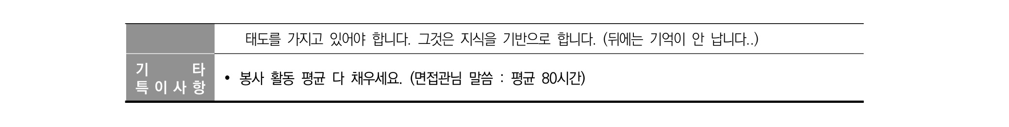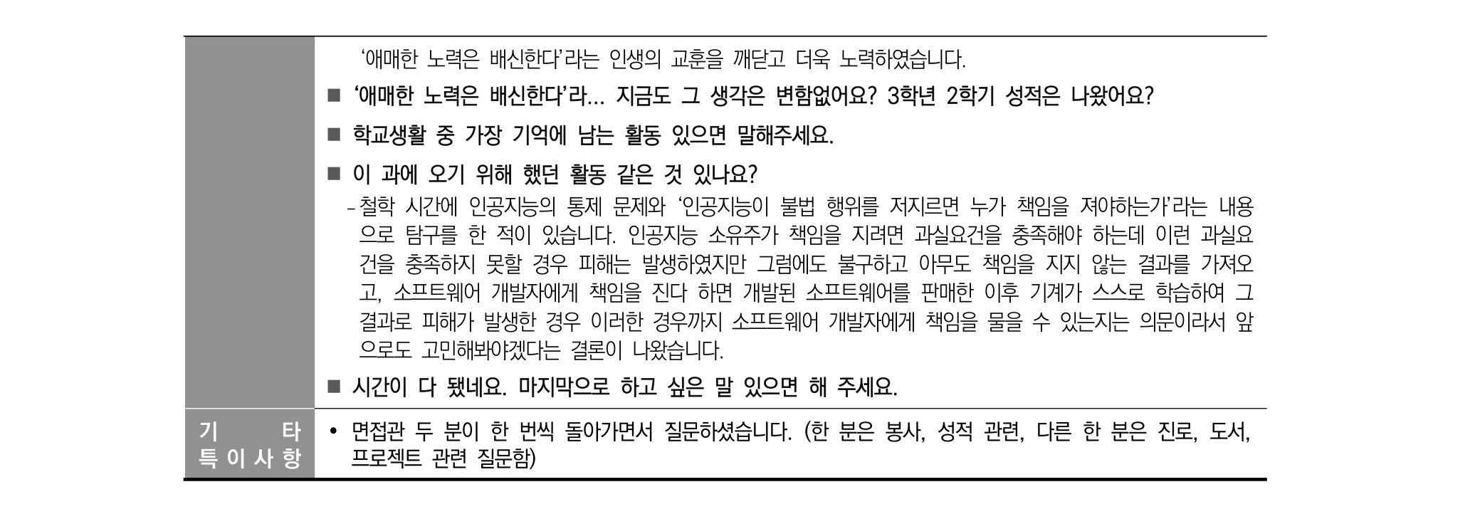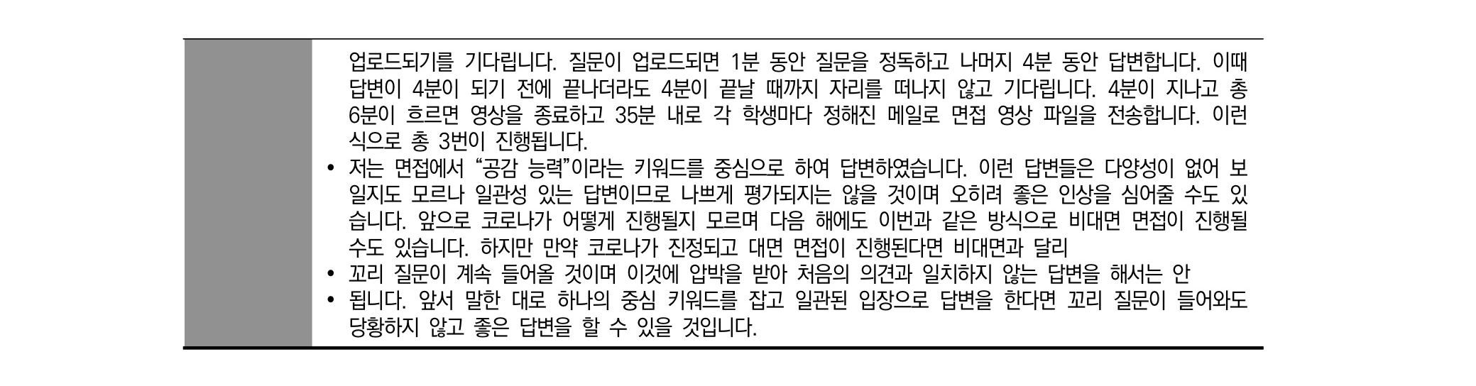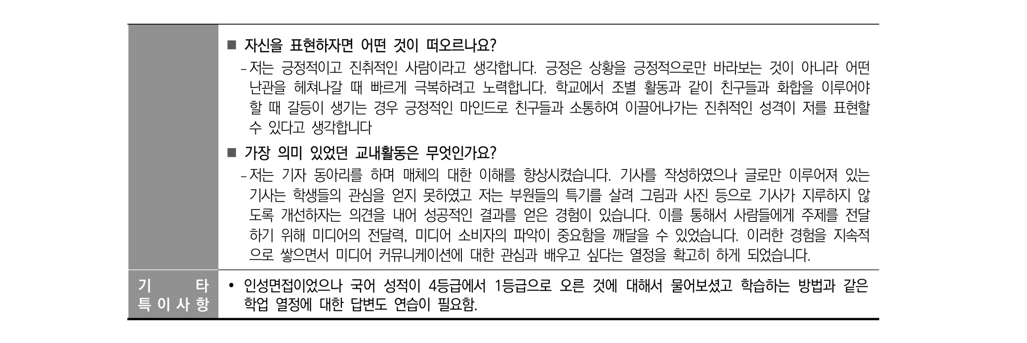· 고사실에 입장하여 4분간 면접관과의 대화를 통해 자신의 생각을 전달