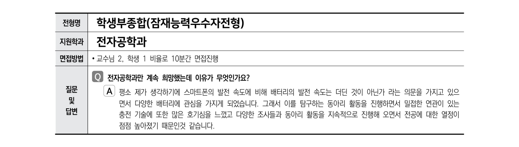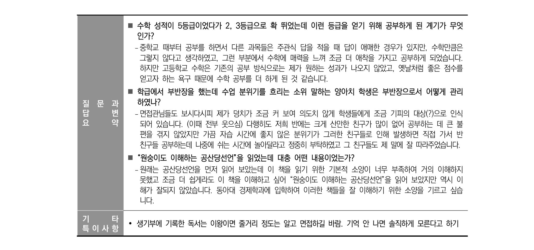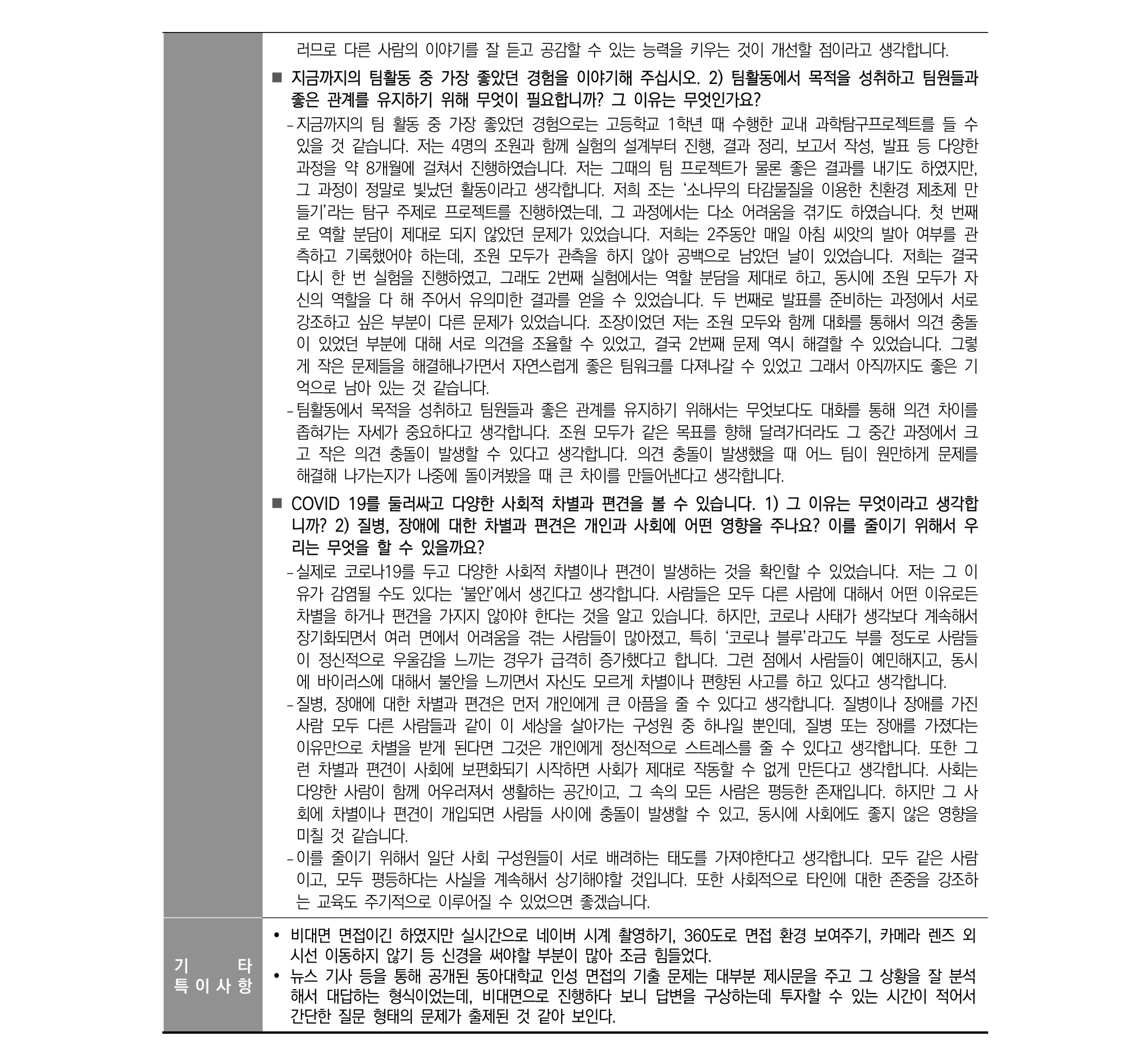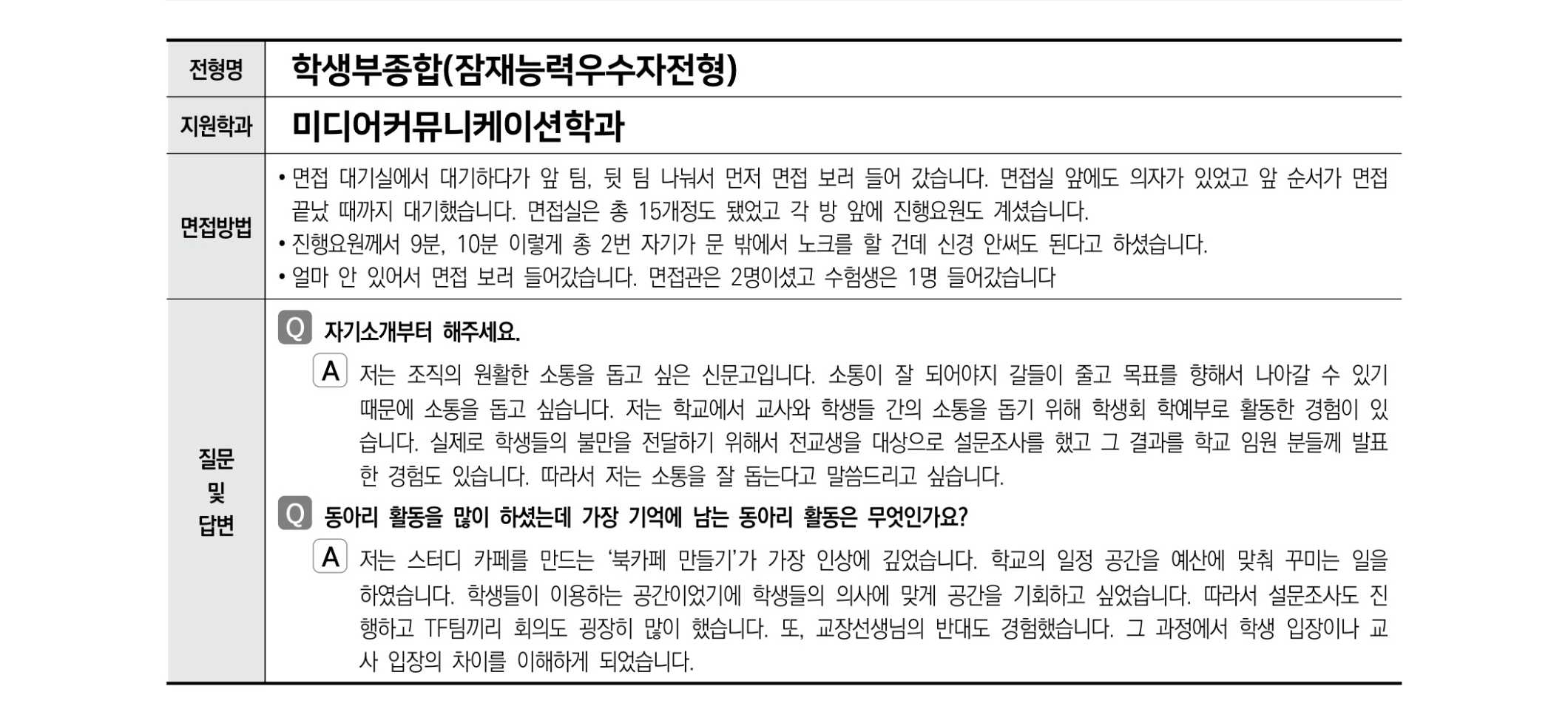 · 학생부를 제공하지 않으며 교과 관련 지식은 질문하지 않음면접 유형