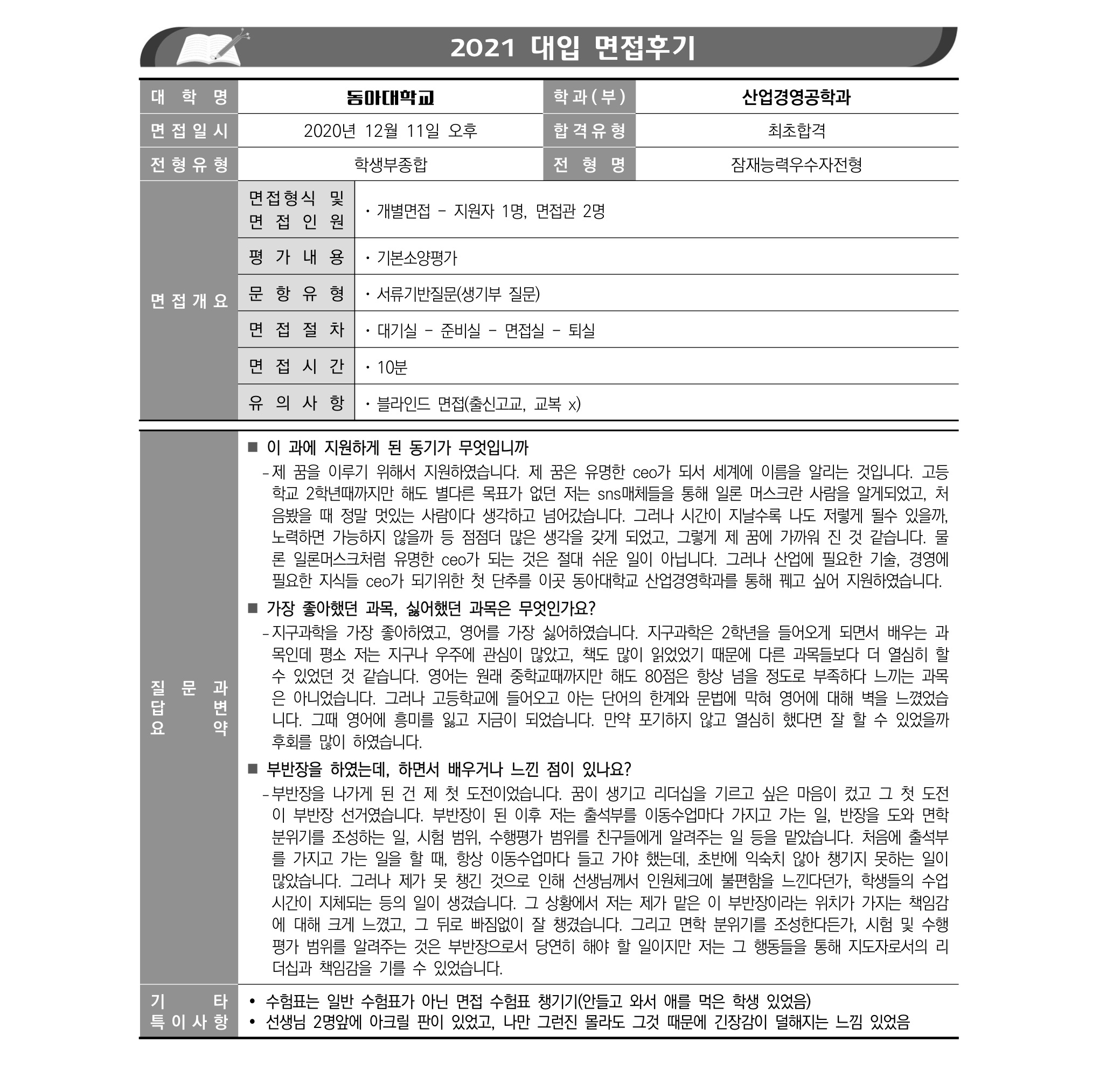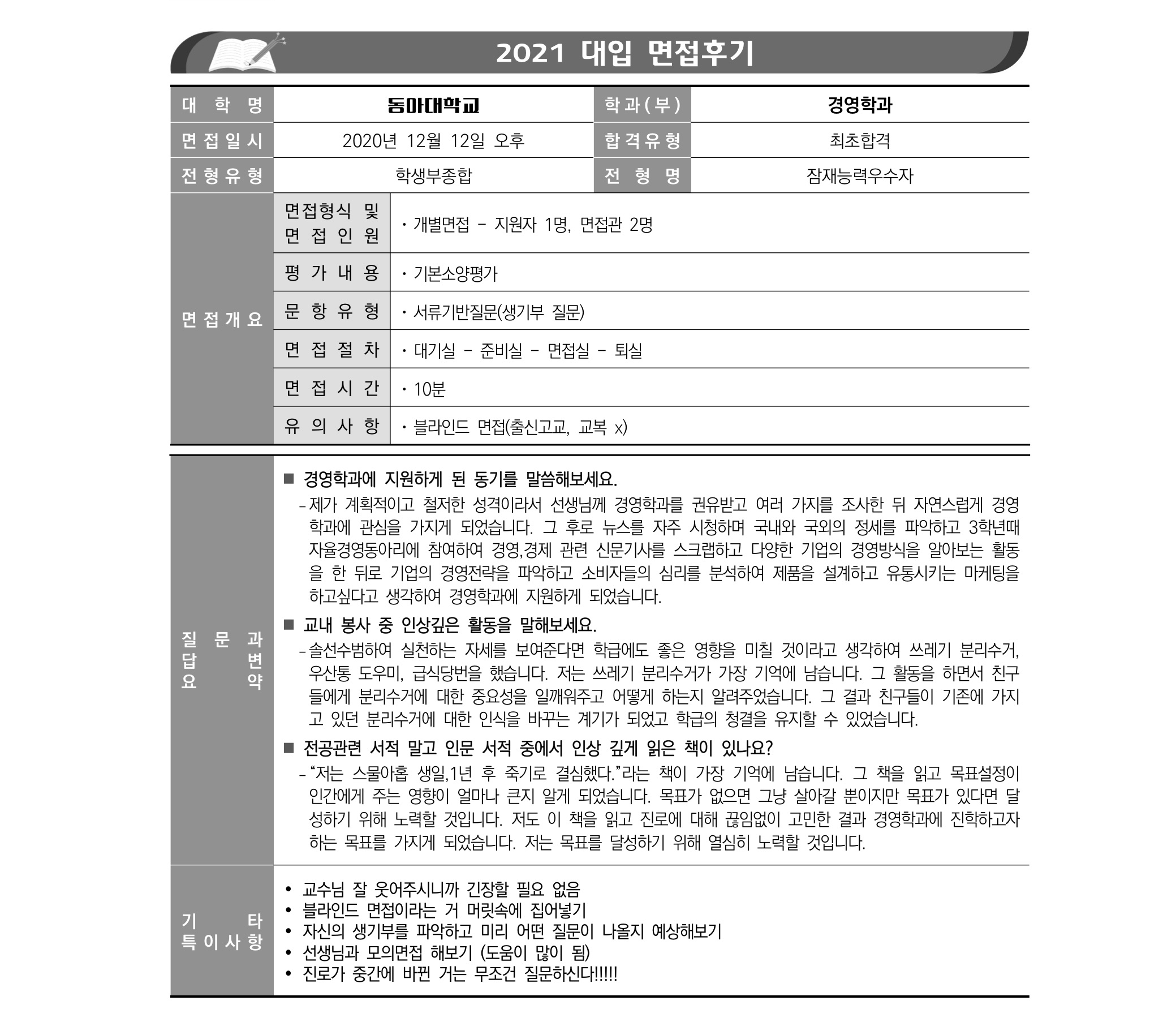 2021학년도 동아대학교 면접 후기5 - 경영학과 2021학년도 동아대학교 면접 후기6 - 경영학과