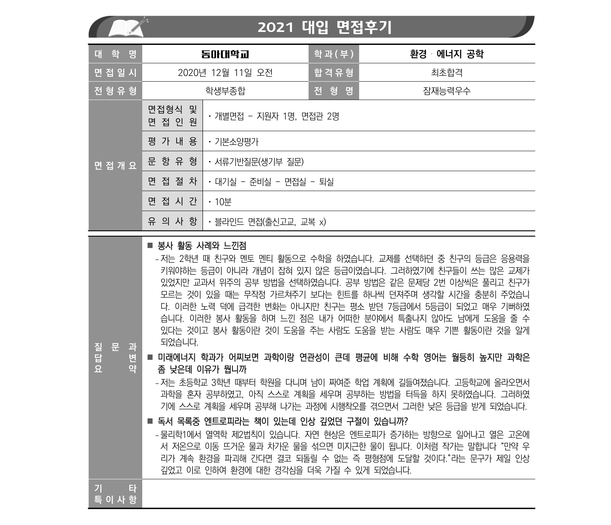 2021학년도 동아대학교 면접 후기60 - 환경에너지공학부 2021학년도 동아대학교 면접 후기61 - AI학과