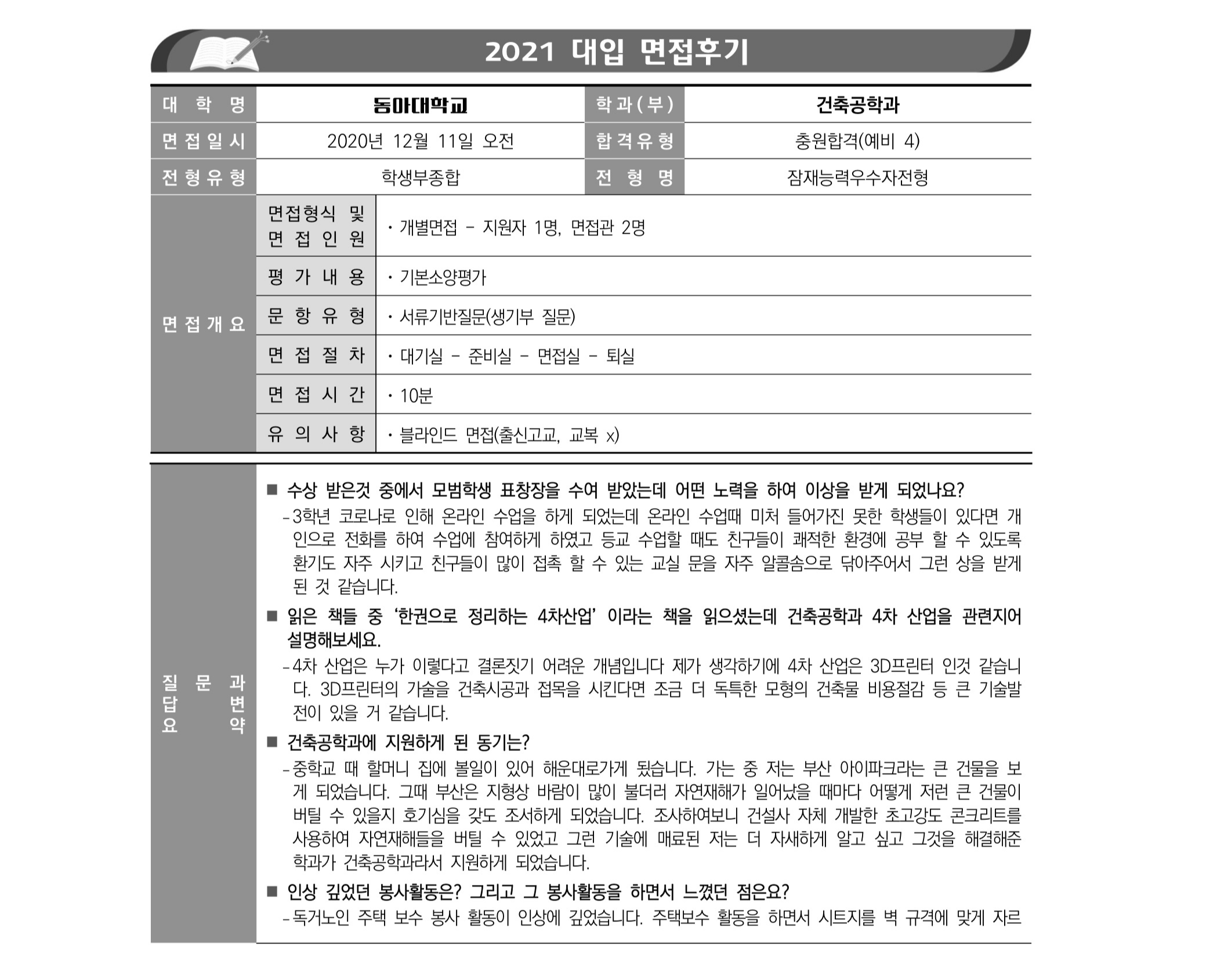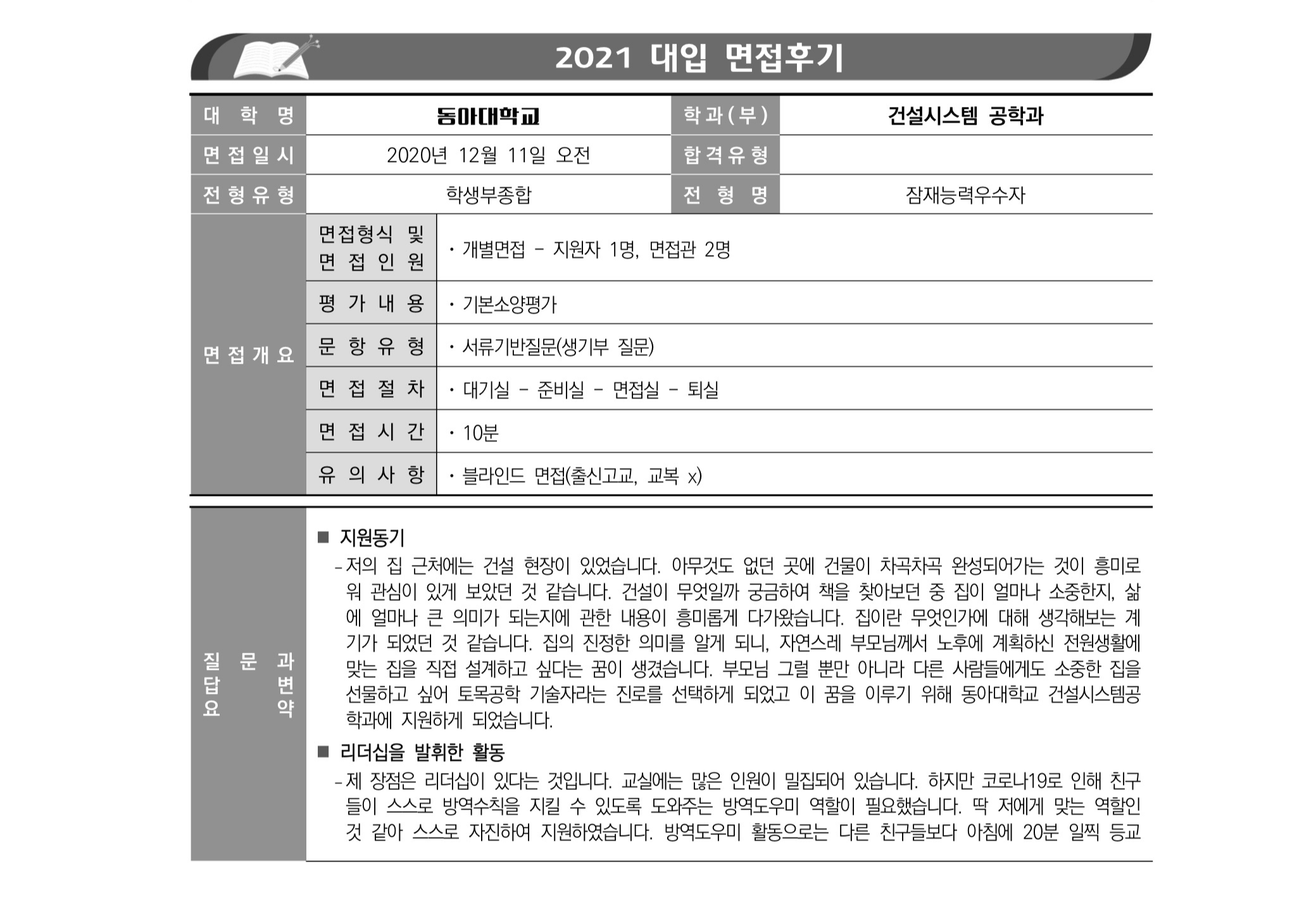 2021학년도 동아대학교 면접 후기2 - 건설시스템공학과 2021학년도 동아대학교 면접 후기3 - 건축공학과