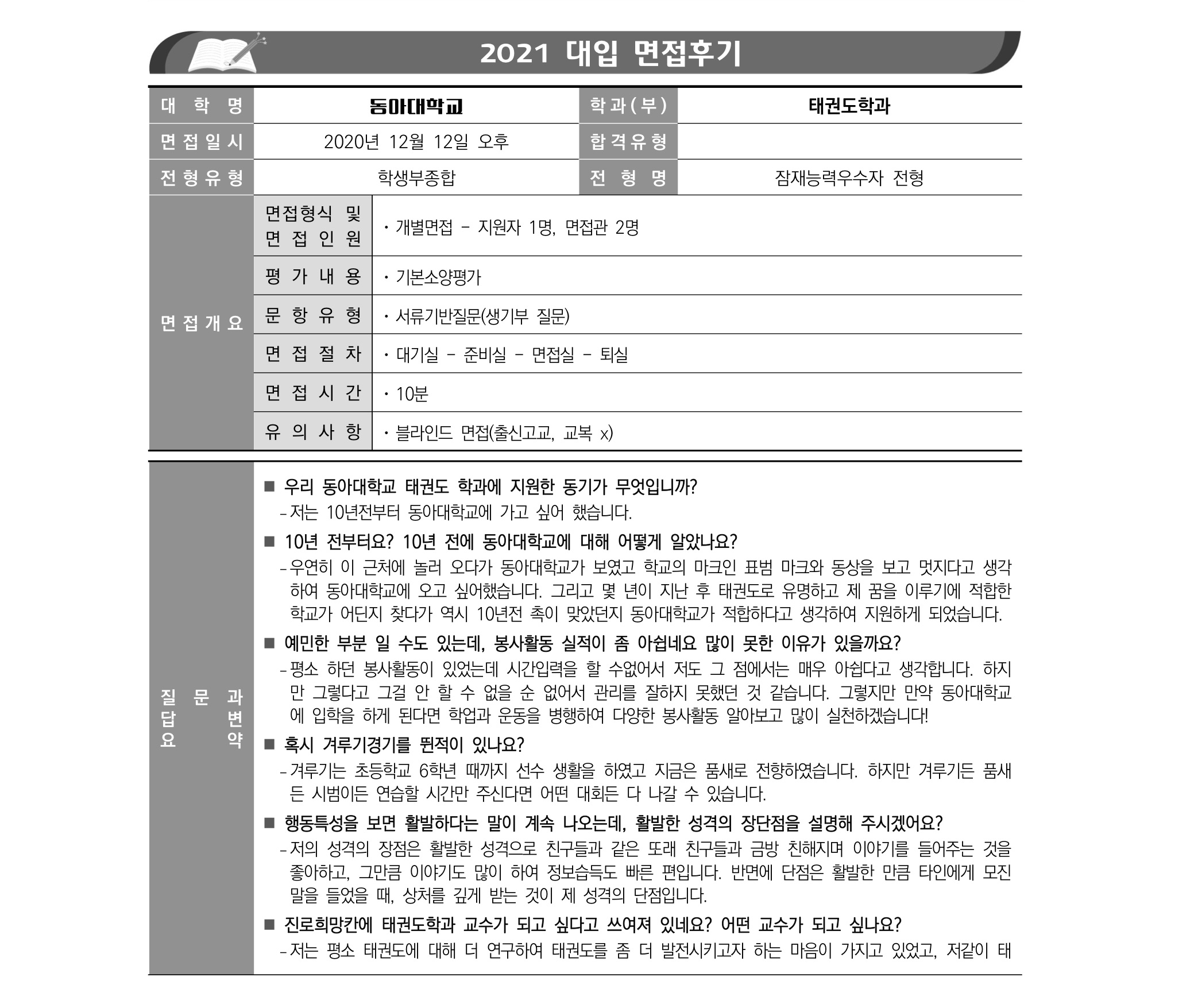 2021학년도 동아대학교 면접 후기54 - 태권도학과