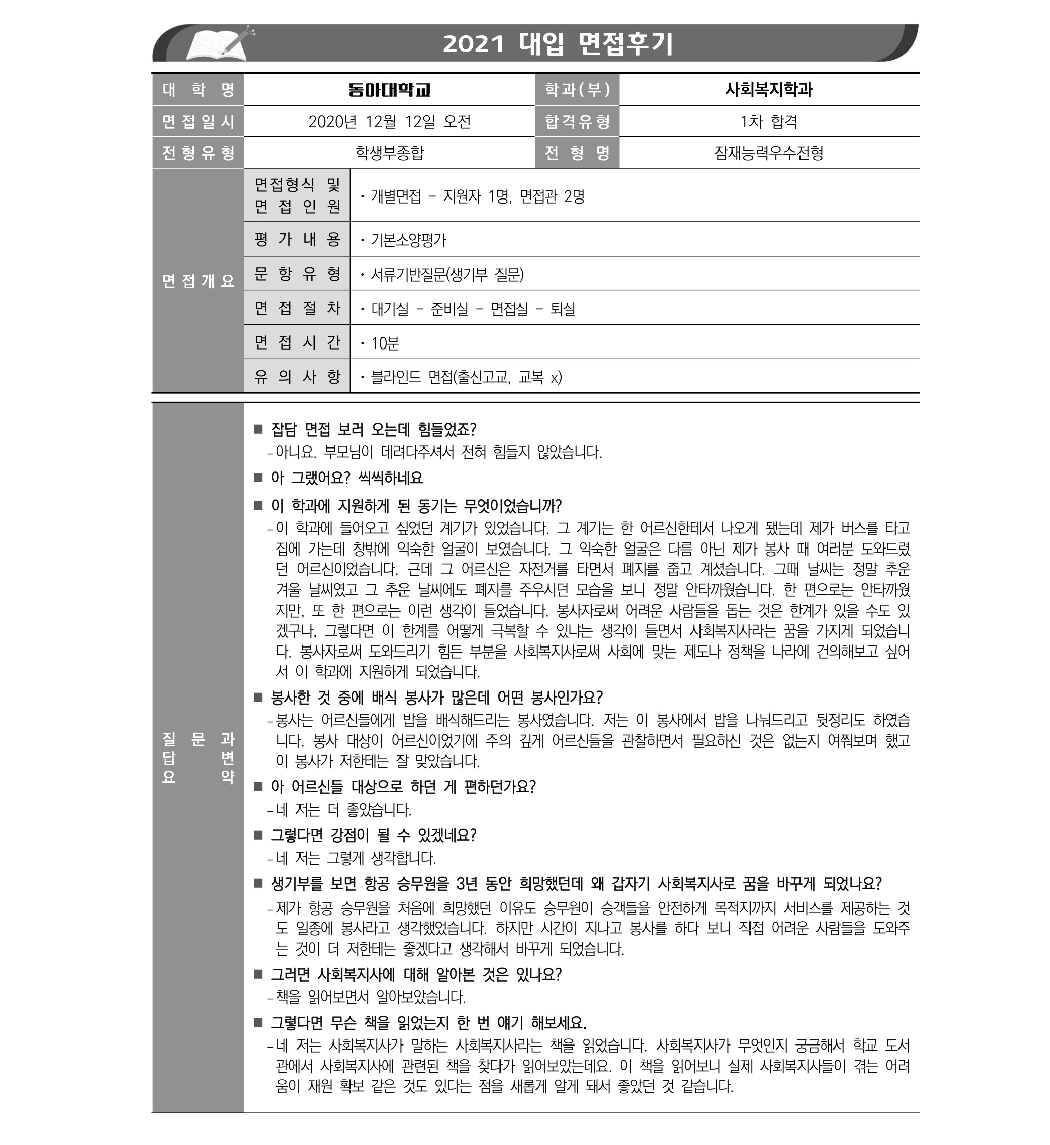 2021학년도 동아대학교 면접 후기25 - 사회복지학과